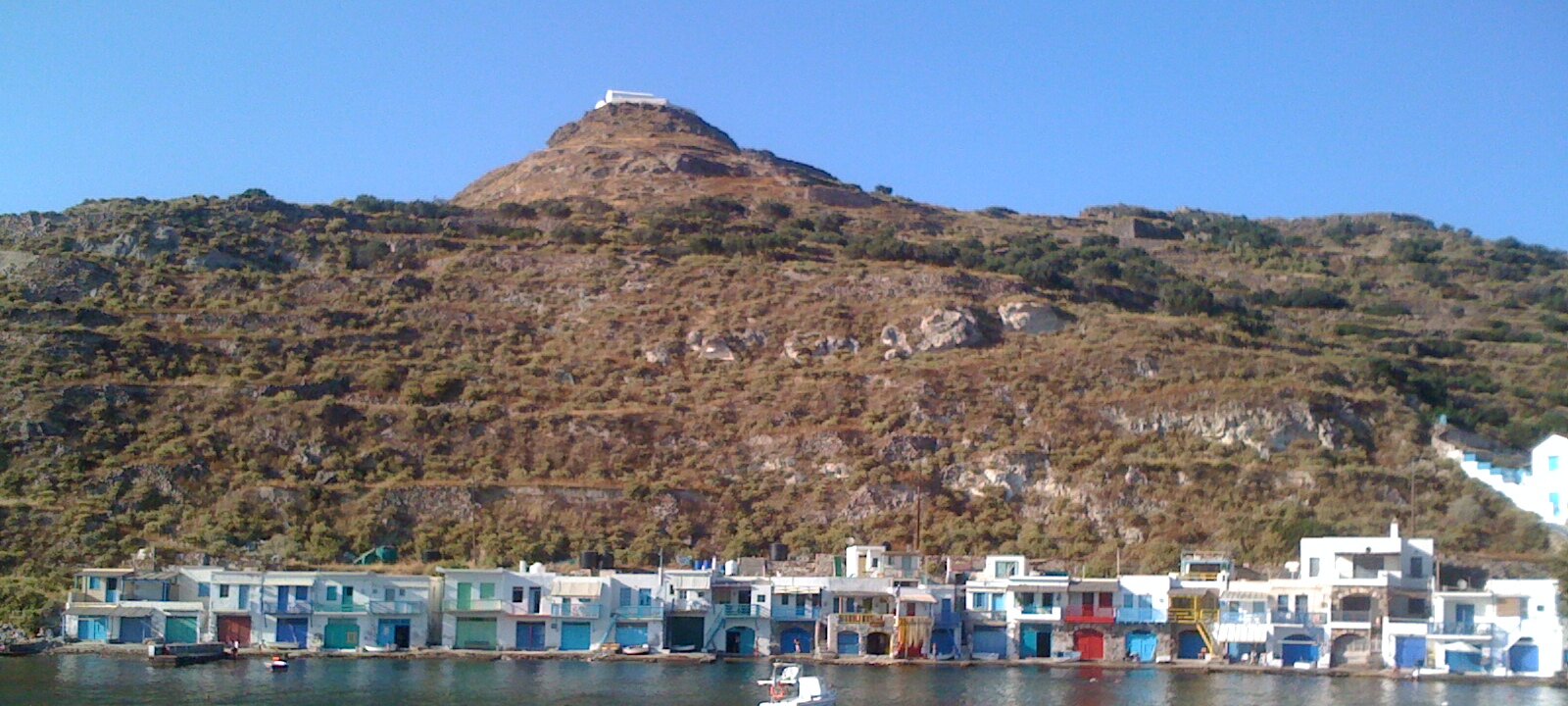Adamantas is situated inside a large 5km-wide bay. Small fishing village in the bay of Adamantas. The lower storey of the houses are used as boat garages. Klima. Klima. Small fishing village. Small fishing village. Mining sea terminal. As Milos is a volcanic island, geological formations abound. CatacombsCoast - west Labels