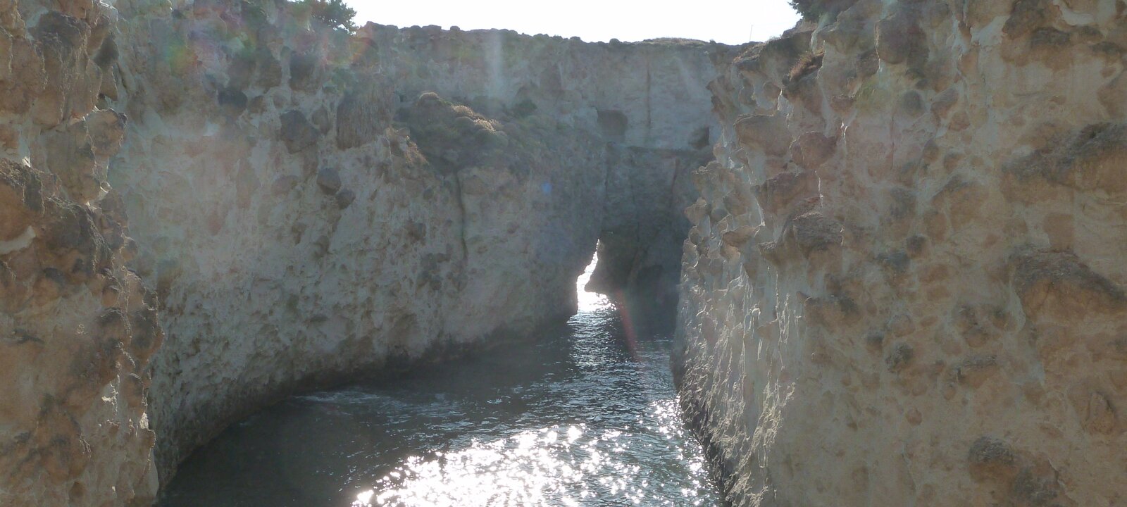 Sea water passes below a natural arch in a narrow gorge to reach a small beach. The small beach. The arch. The cliff. PaleohoriPlaka Labels