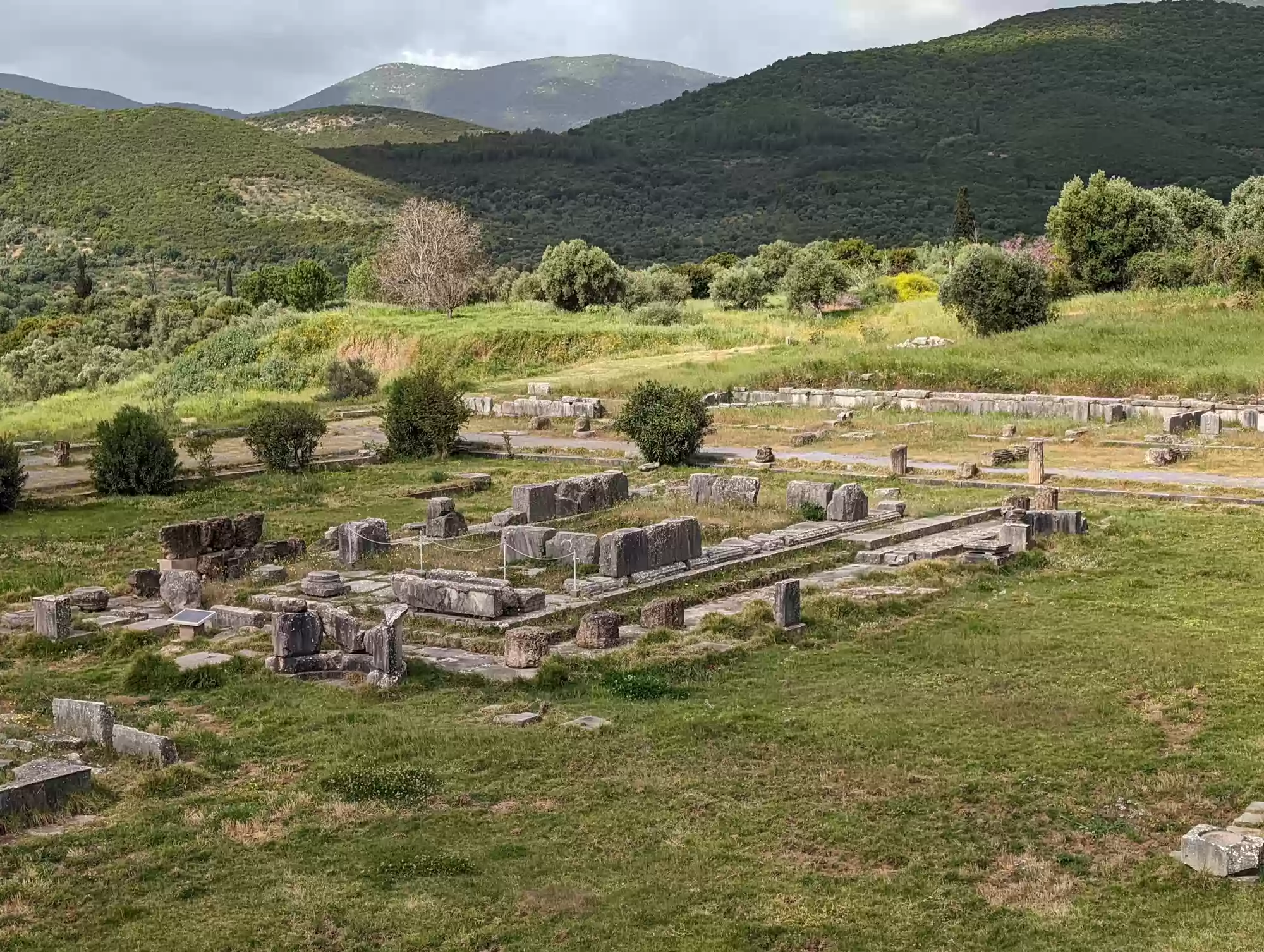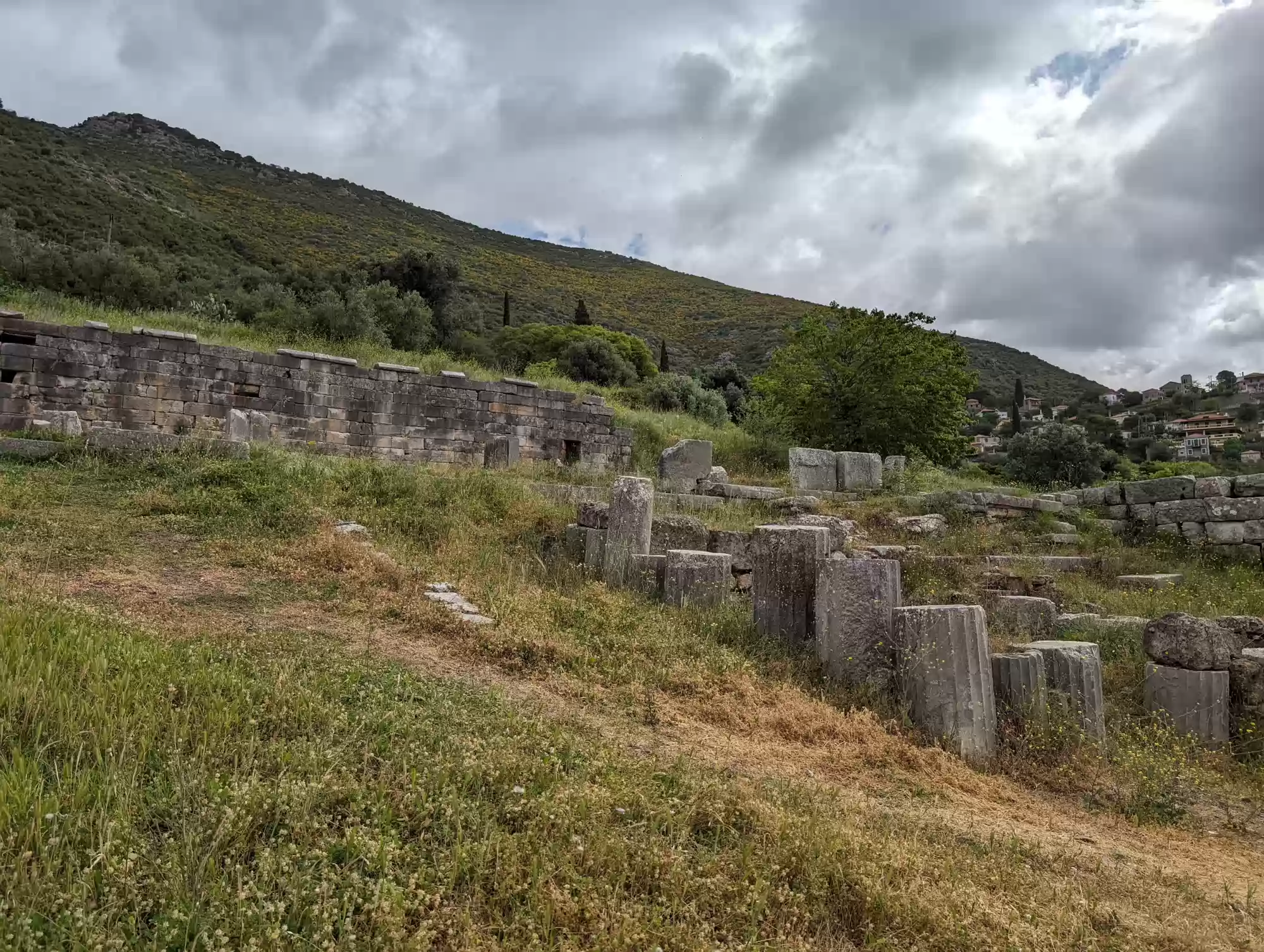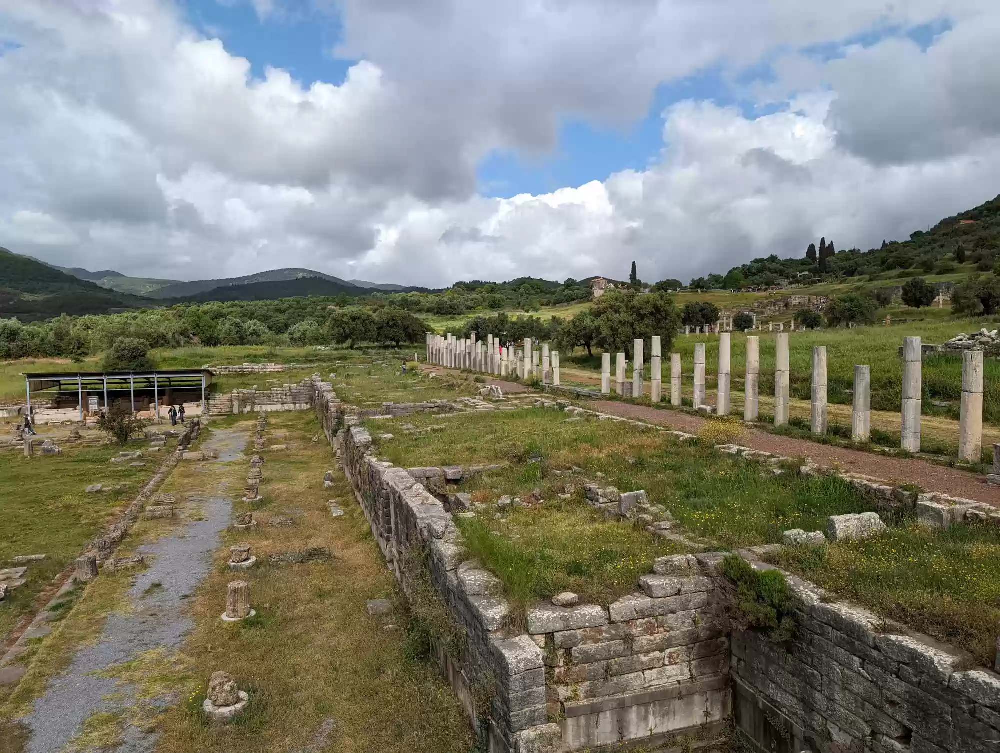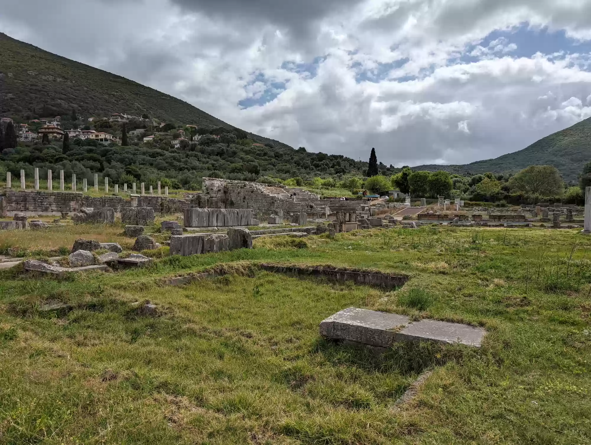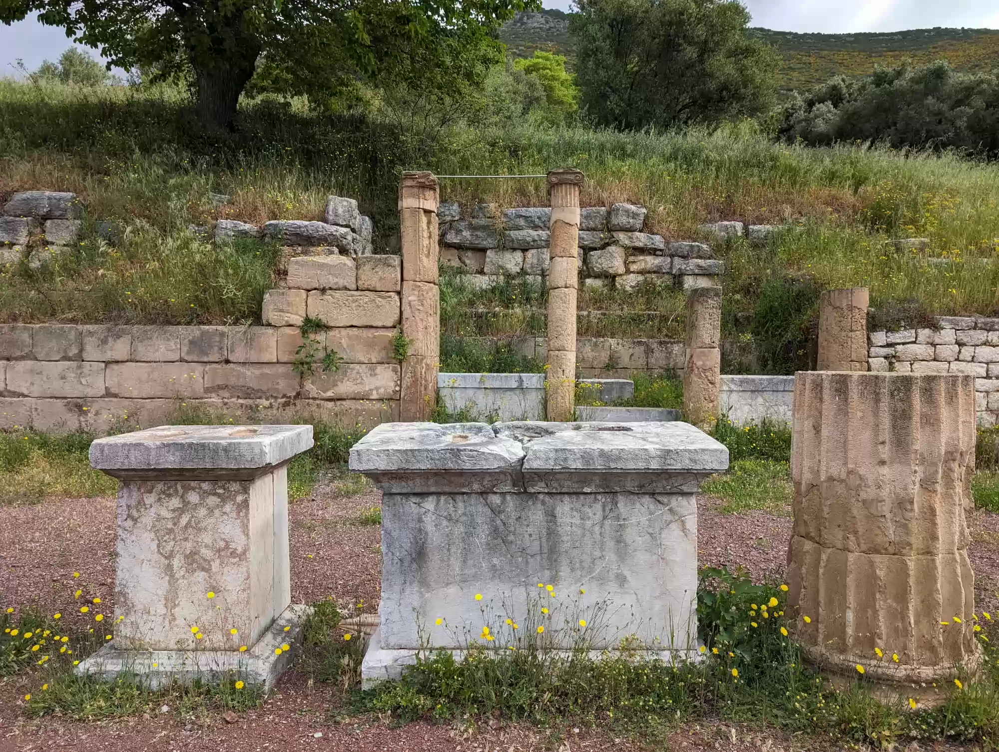Sanctuary of Asclepios. 140 bases for bronze honorary statues of eminent citizens. The courtyard is surrounded by 4 double stoas. There are rooms and buildings…