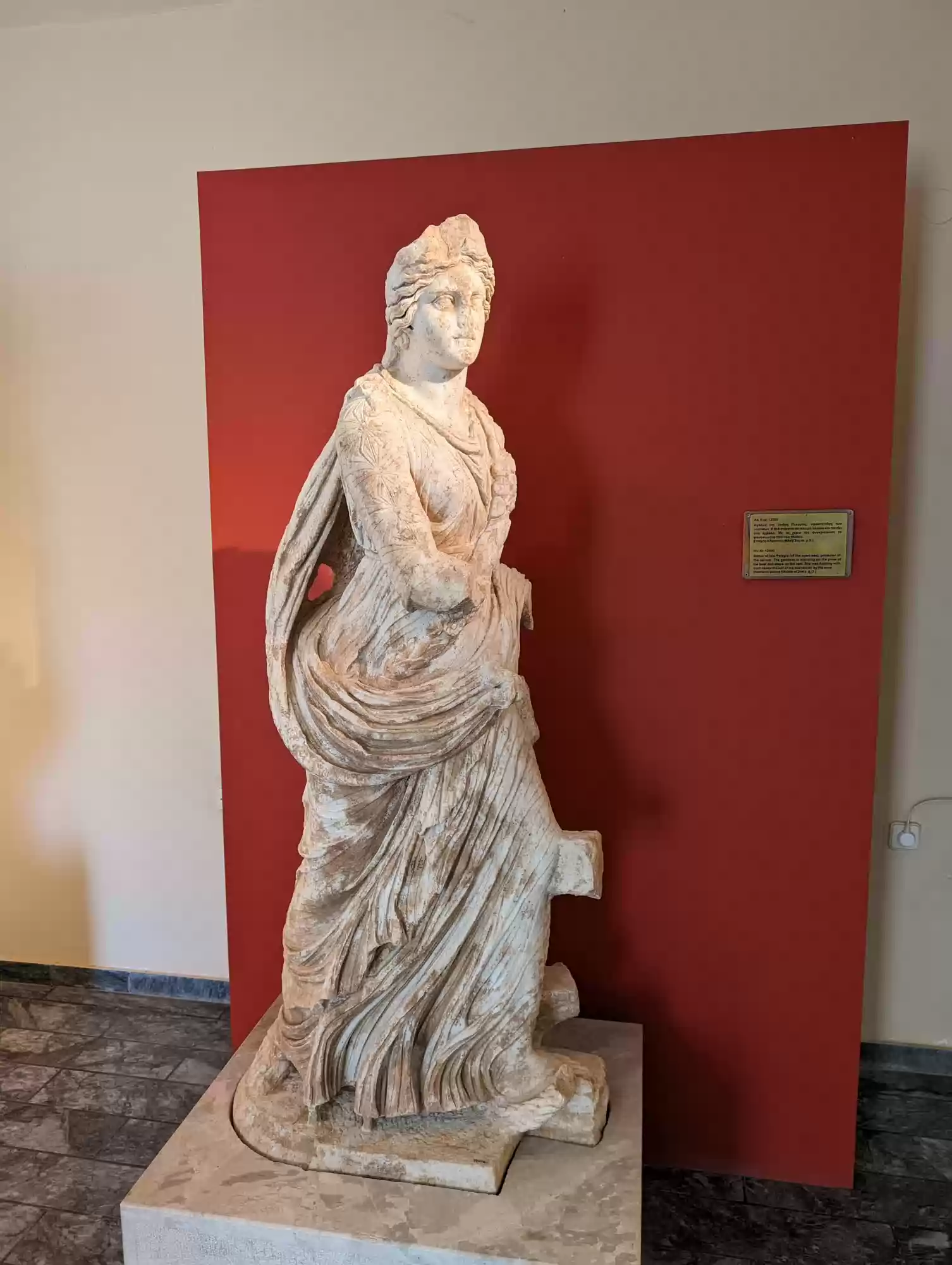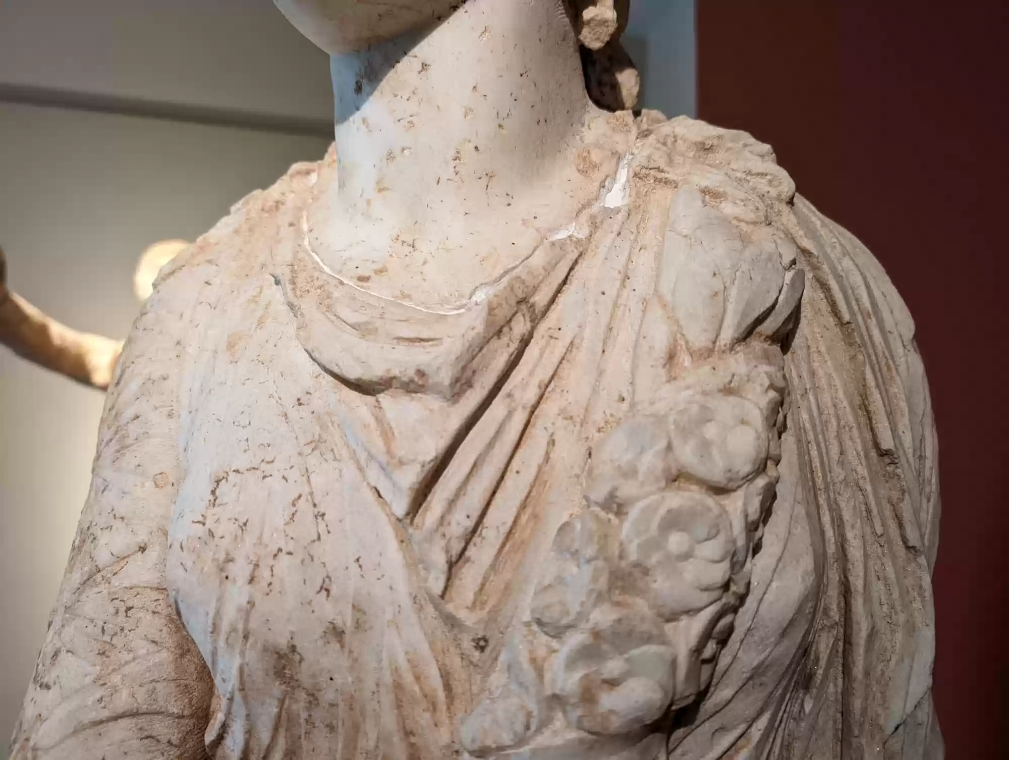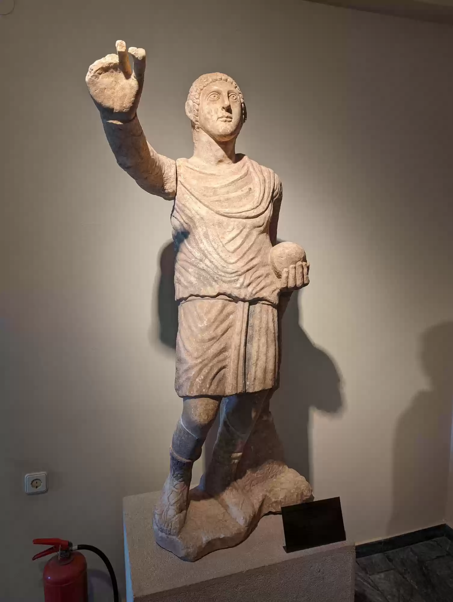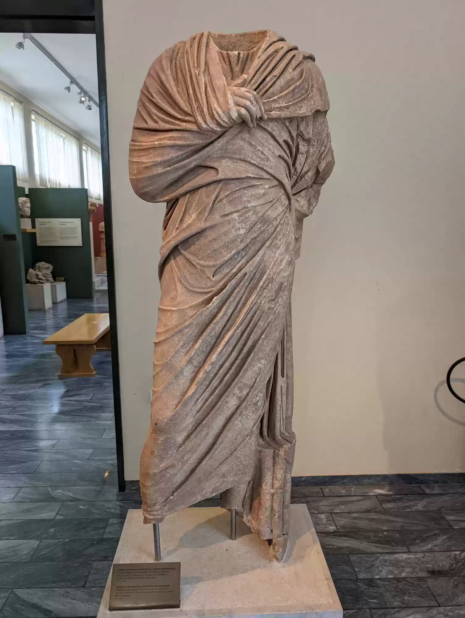 Statue of a man wearing a mantle from the Gymnasium of Messene. The papyrus roll at his left foot indicates he was an intellectual, 1st century CE.