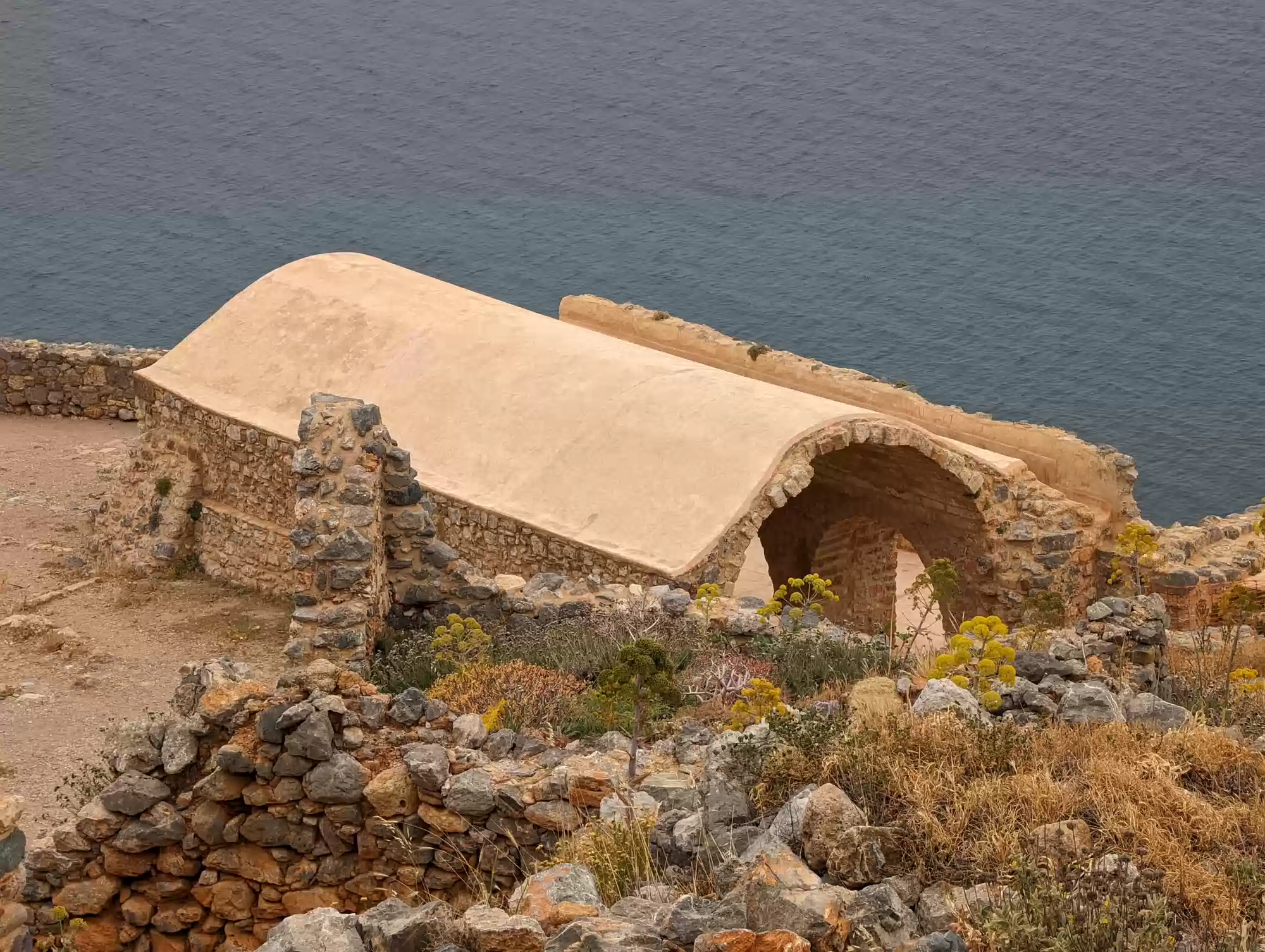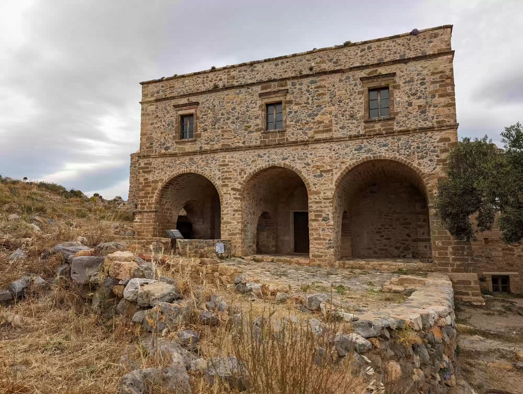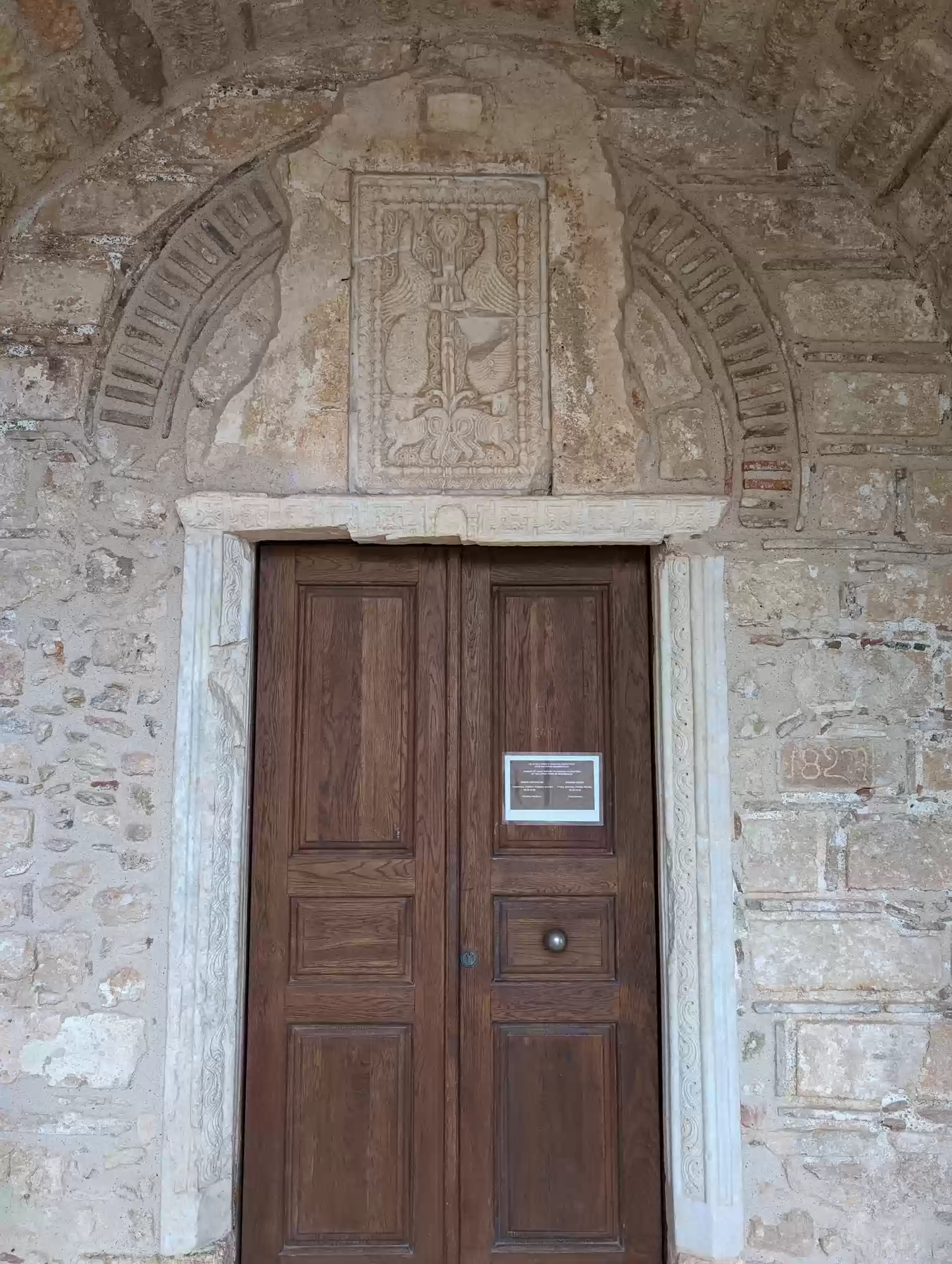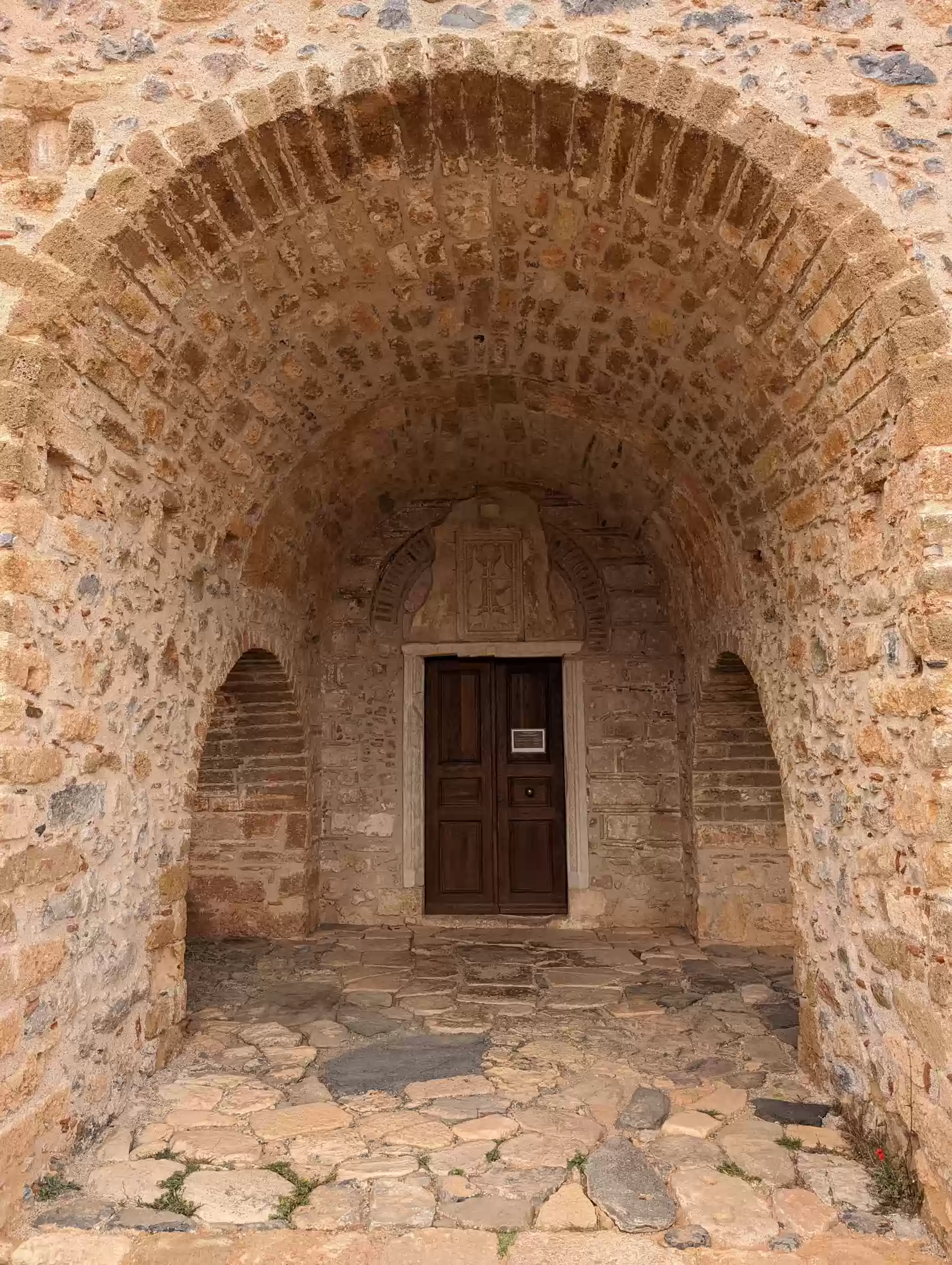 Late byzantine church. A second aisle was added ca. 1700 during the second Venetian rule. Gate complex.