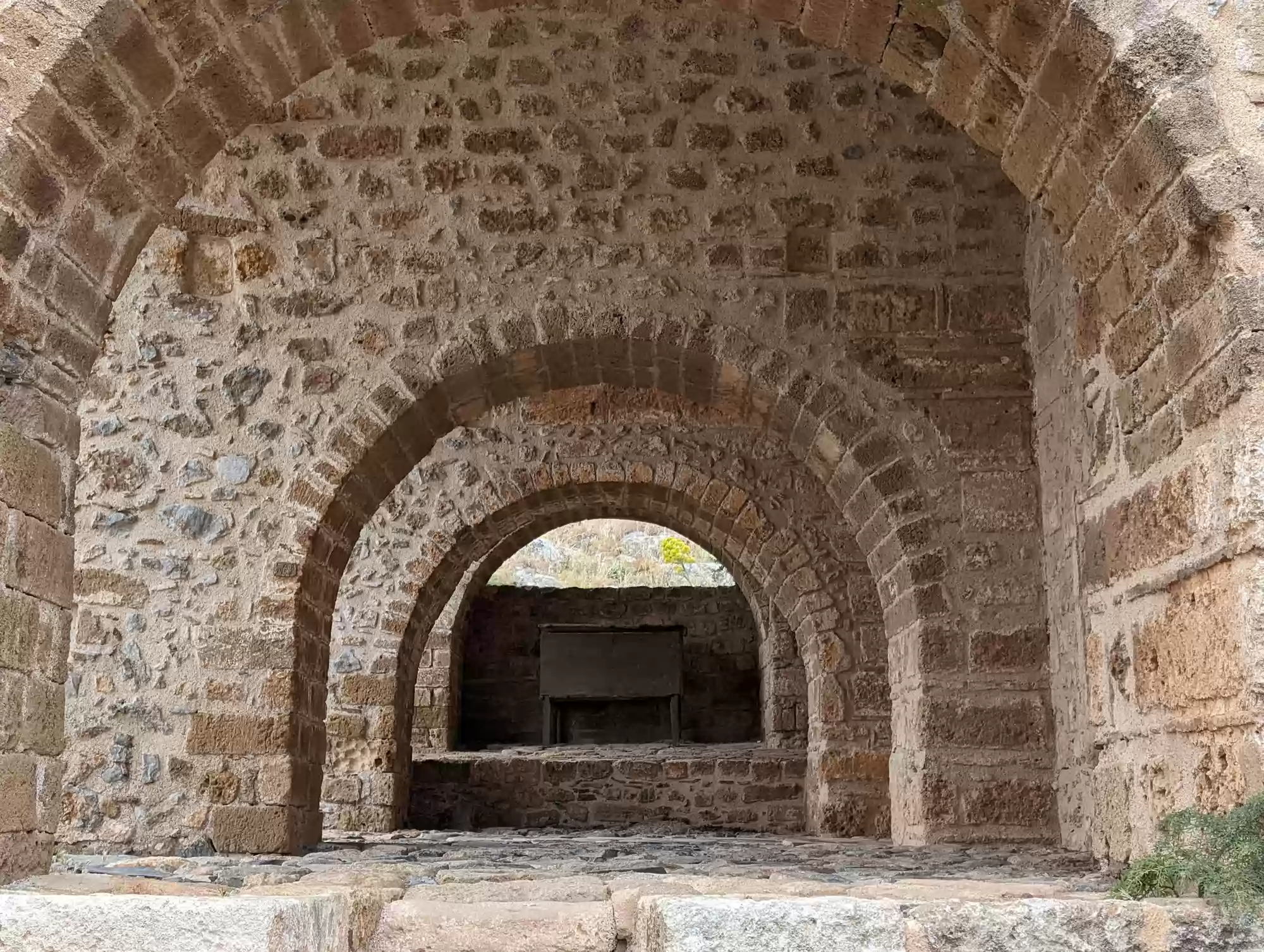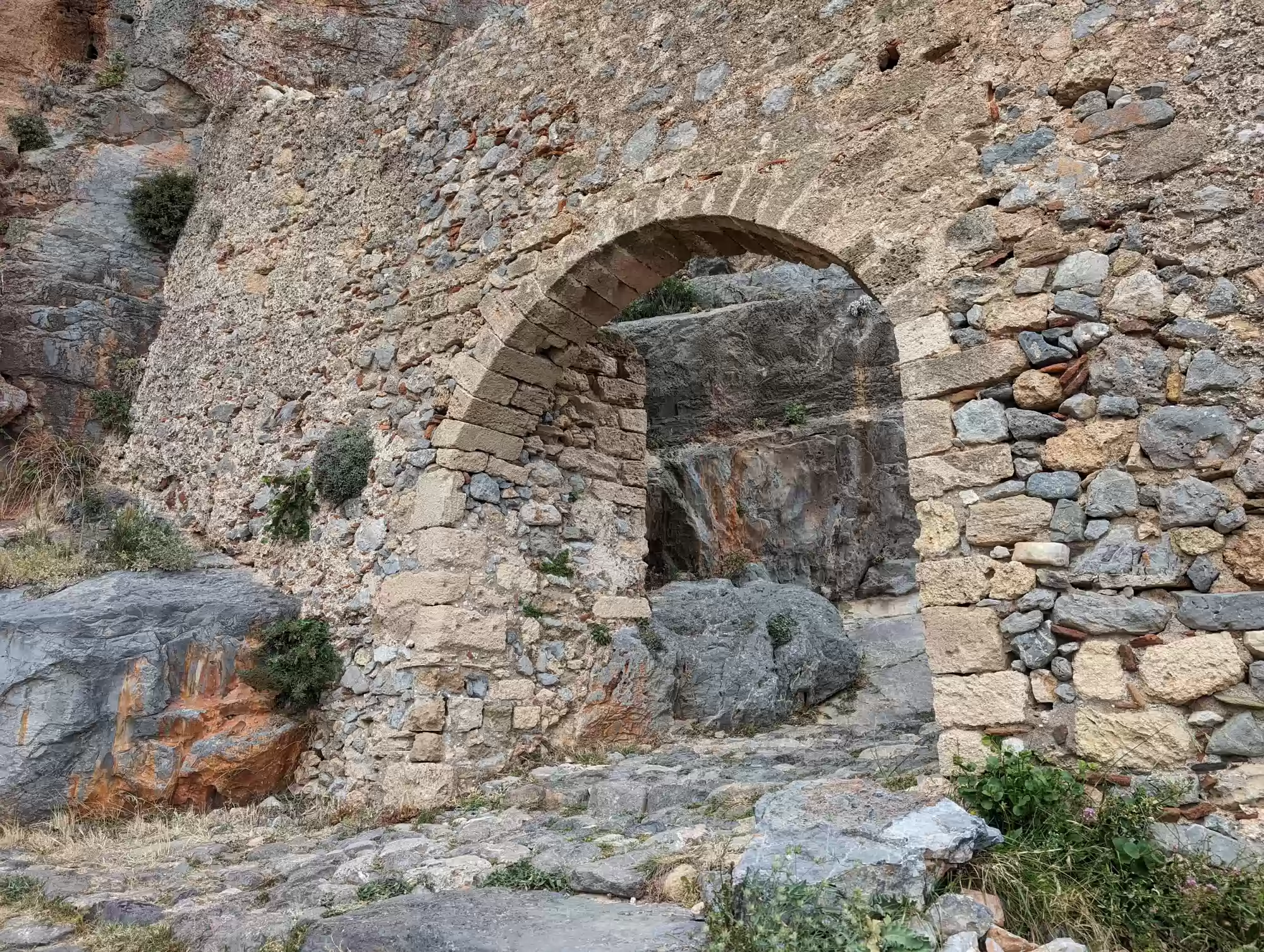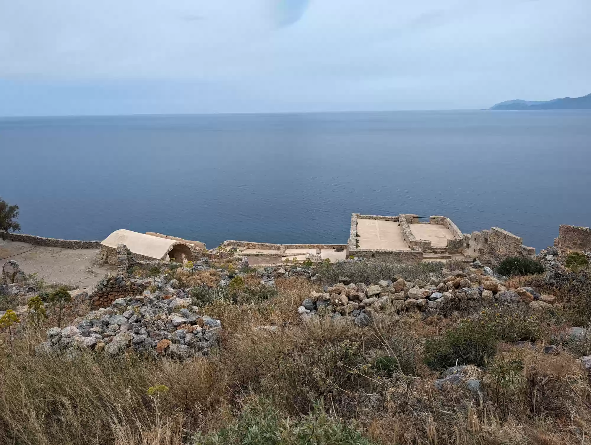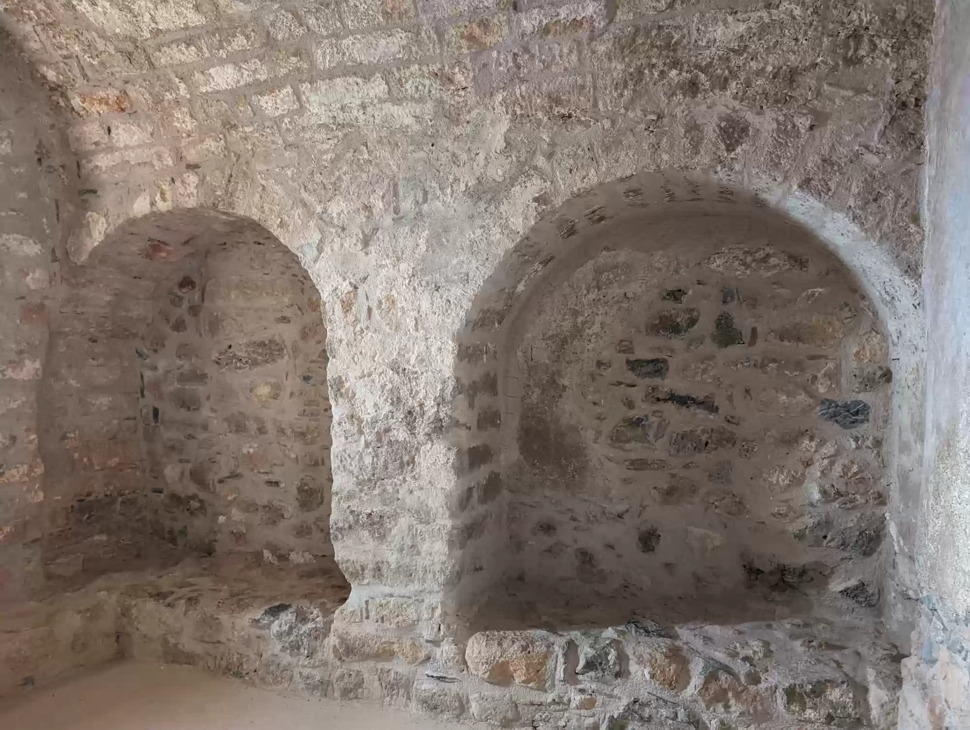 Late byzantine church. A second aisle was added ca. 1700 during the second Venetian rule. Gate complex.