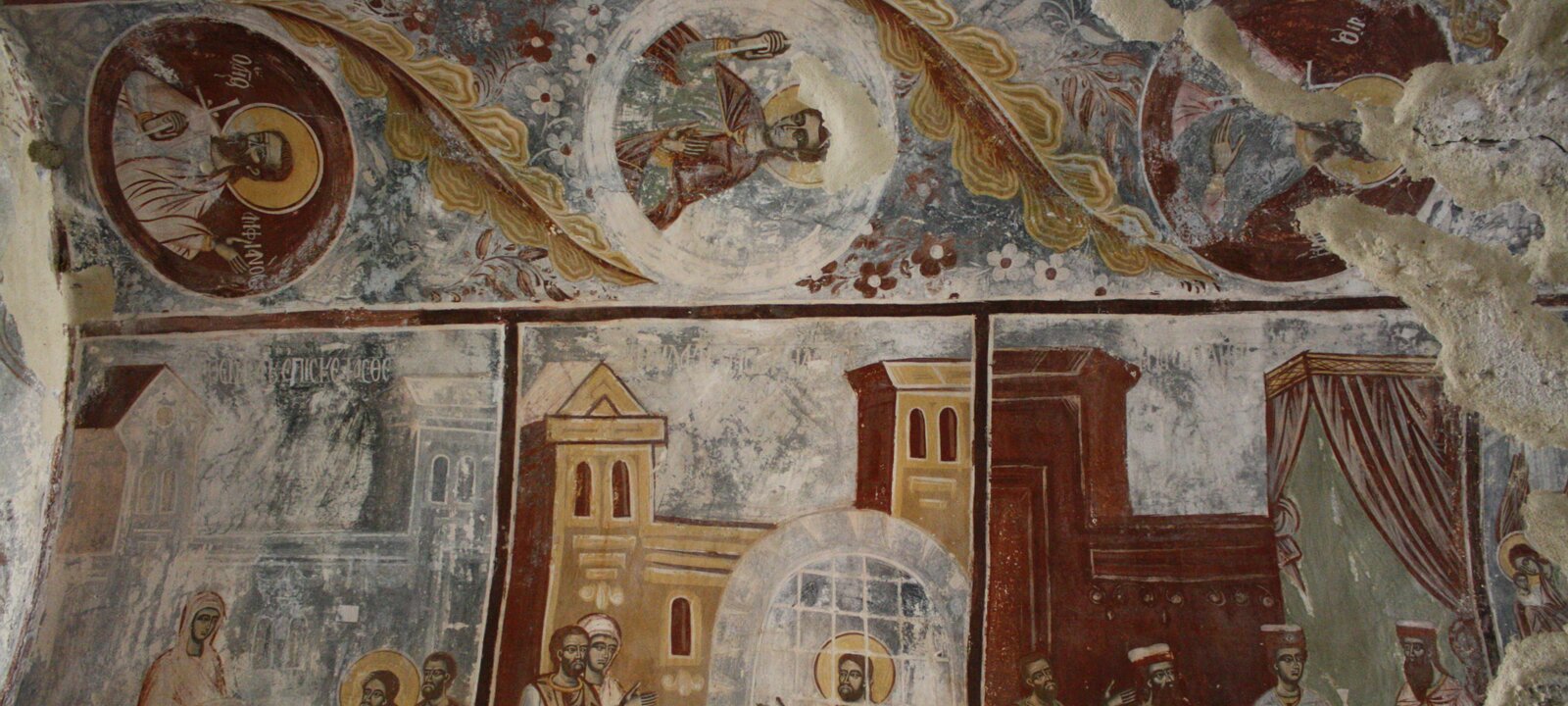 Mystras features: a preserved urban design for the settlement, a Frankish castle, a Byzantine palace, churches with paintings.