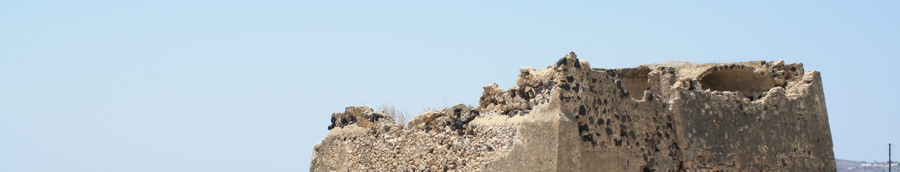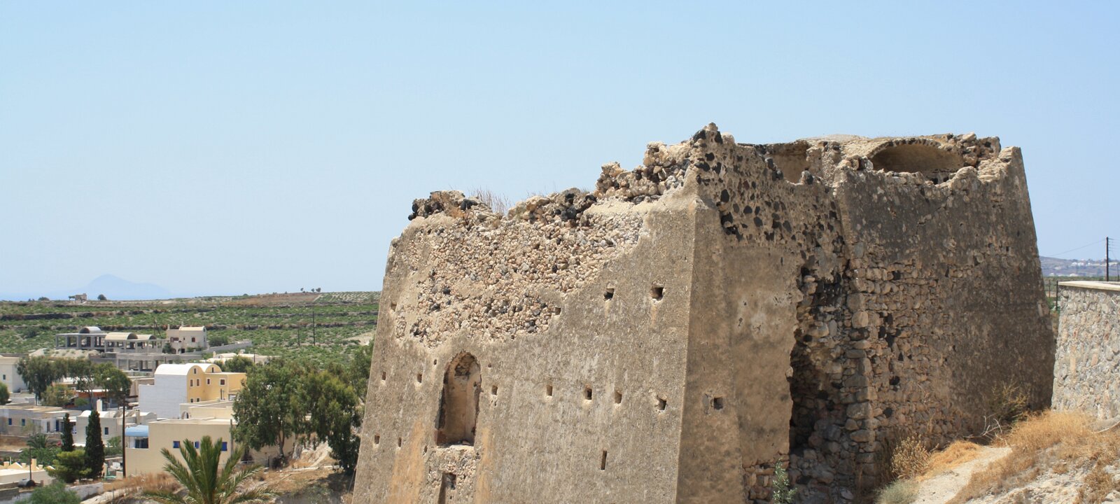 The village of Emporio is topped by a medieval castle. A goulas: square tower built during the Ottoman period (15-19th century) to protect the local population against pirate invasions. Goulas. Castle part of Emporio. CalderaFira Labels