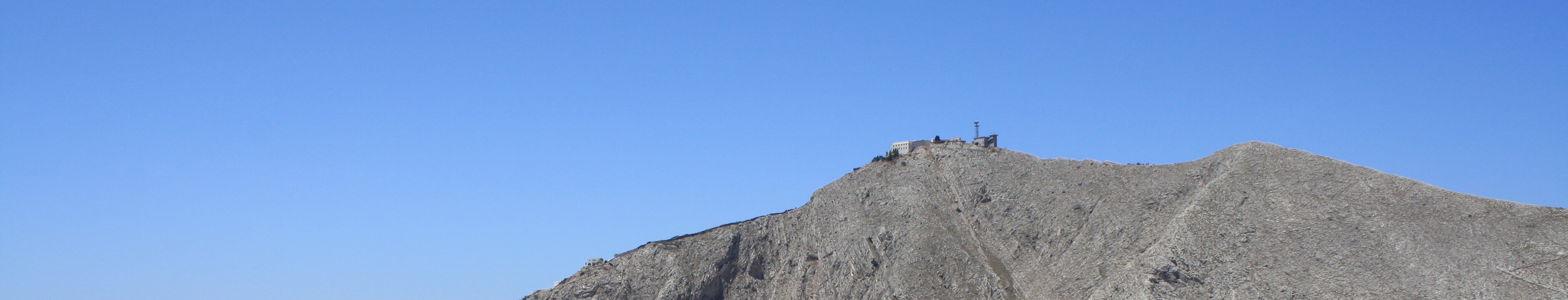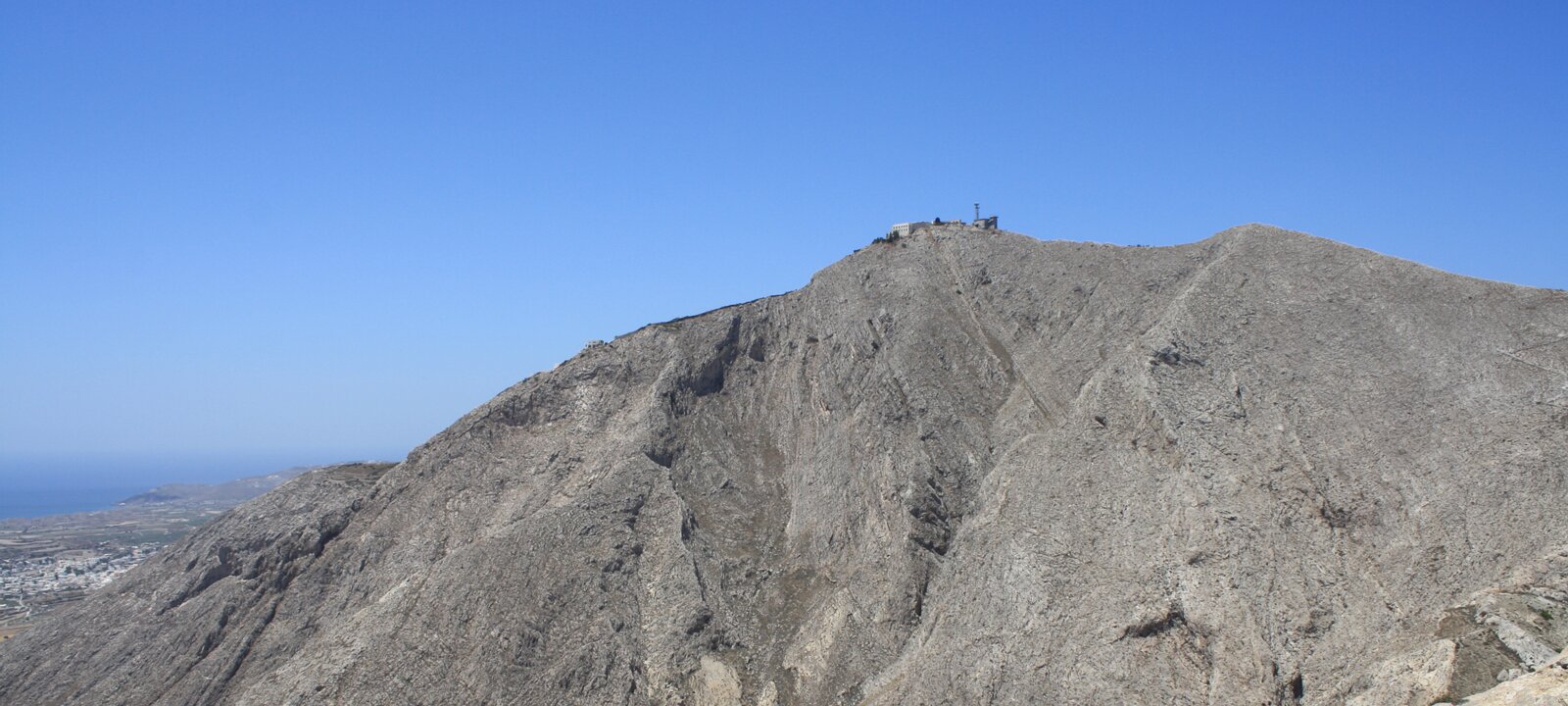 Mount Profitis Ilias (540m high) is the highest hill on Santorini. North part of Santorini. The slope goes from sea level (right) to the cliff above the caldera (left). Santorini's airport. The east part of Santorini is fairly flat. Pyrgos. Fira and surrounding towns. Oia. West part of Santorini. KokkiniNea Kamini Labels