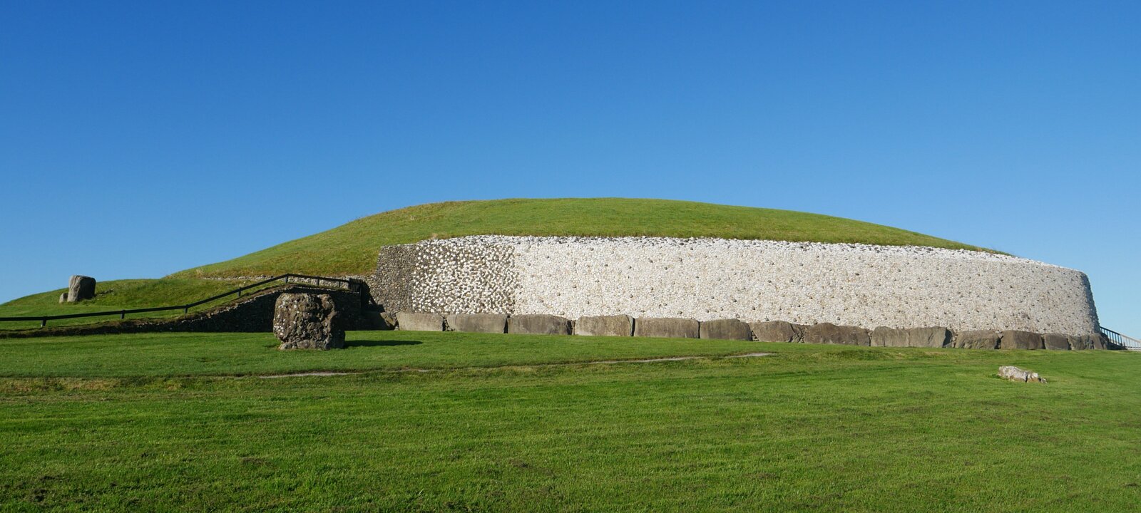 Newgrange passage tomb, 3200 BCE, 85 meters wide, 200000 tonnes. The passage is 40 meters long and is aligned with the rising sun on the Winter solstice. The mound had flattened over the centuries and has been re-elevated. Stone wall. MonasterboiceSlane Labels