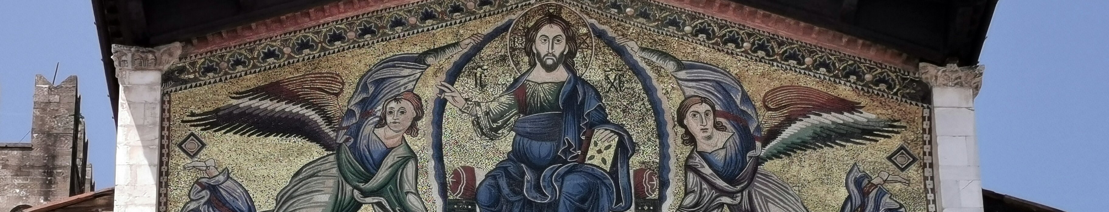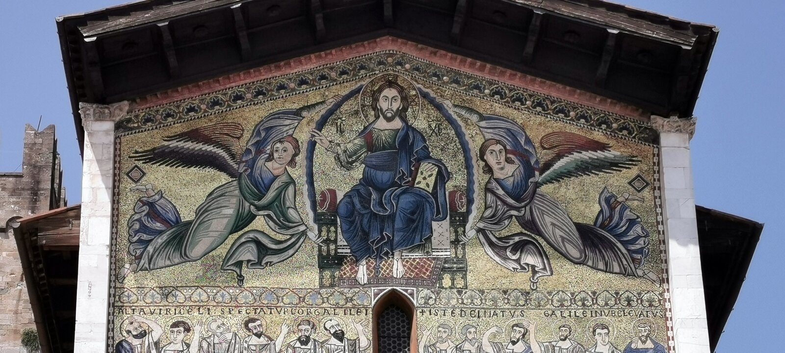 The church was built in the 12th century and the mosaic was added in the 13-14th centuries. Mosaic, 13-14th centuries. Guinigui tower. Duomo. Piazza AnfiteatroSan Michele in Foro Labels