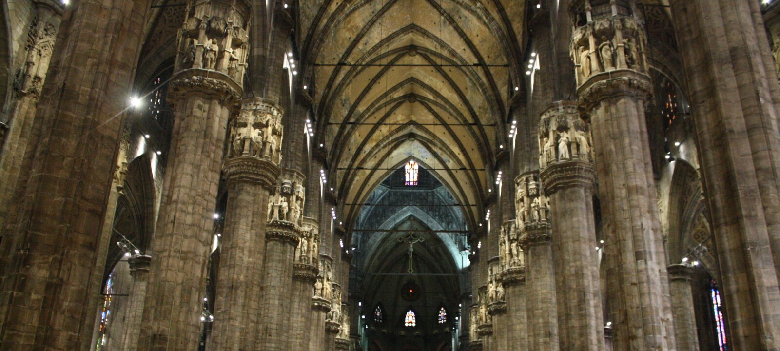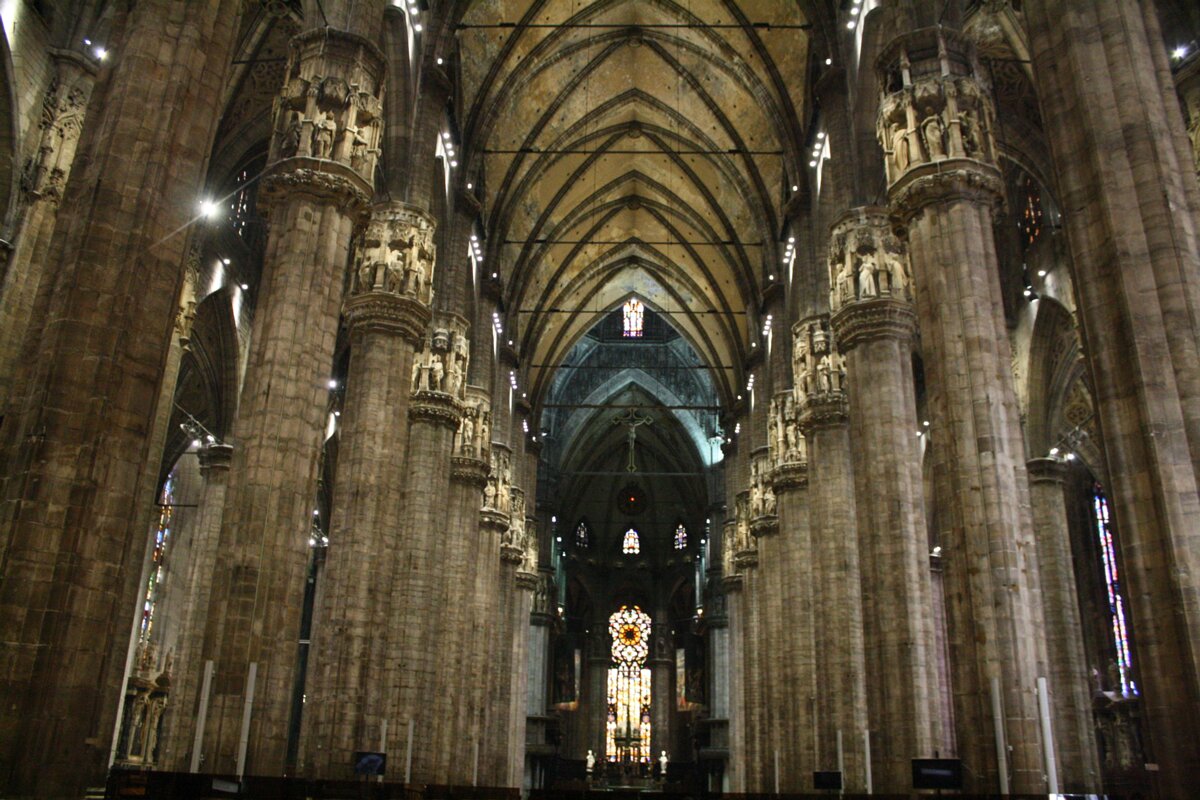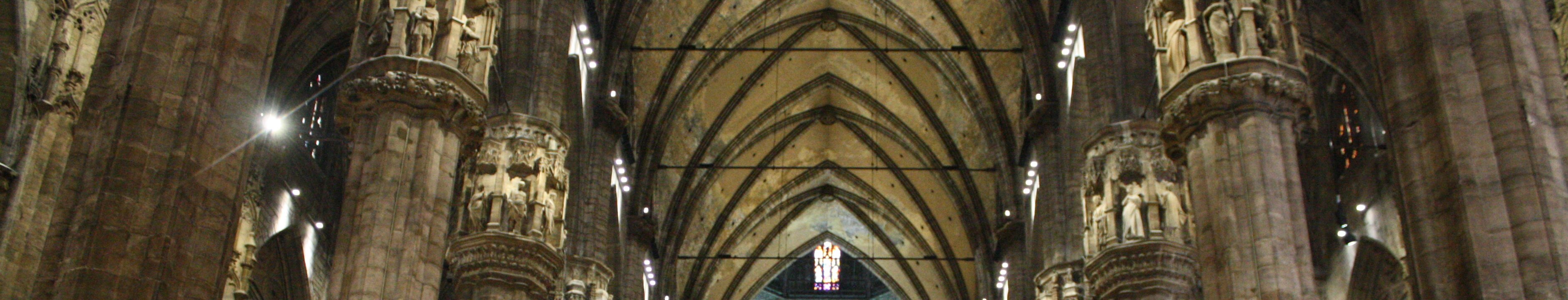 Stained glass windows14 images Central nave. With 45m, it is the highest Gothic nave of a complete church. The choir of the unfinished Beauvais cathedral is 3h higher. Central nave (right) and 2 side aisles (left). Side nave and central nave. Right nave. Capitals. Capitals. Capitals. Capitals. Capitals. Back of the duomo. Back of the duomo. Choir. Choir. Choir. Choir. Apse. A nail of the crucifixion cross is kept in the Duomo. A nail of the crucifixion cross is kept in the Duomo. Former BuildingsRoof Labels