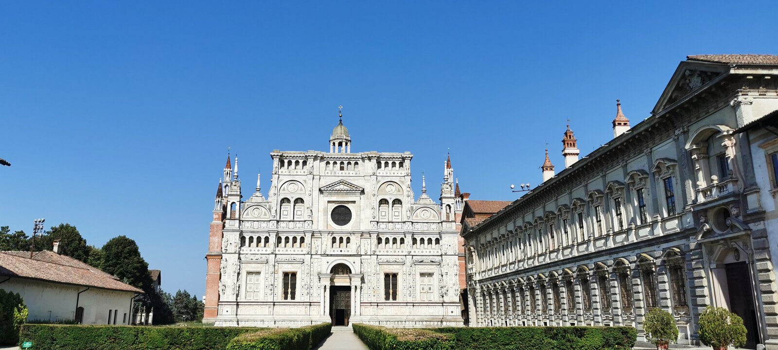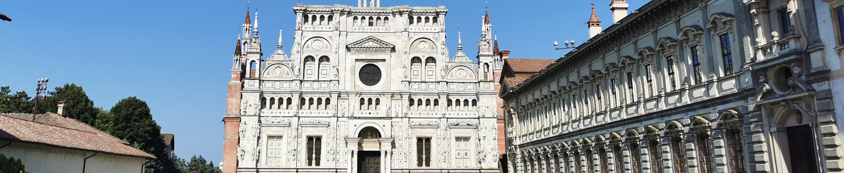 Charterhouse of Pavia, built starting from 1396. Facade of the church: 1473-1560. Larger cloister: 24 cells, 1472. Entrance to the charterhouse. Entrance to the charterhouse. Church facade. Ivory altarpiece. Cloister. Cloister. Cloister. ParmaPiacenza Labels