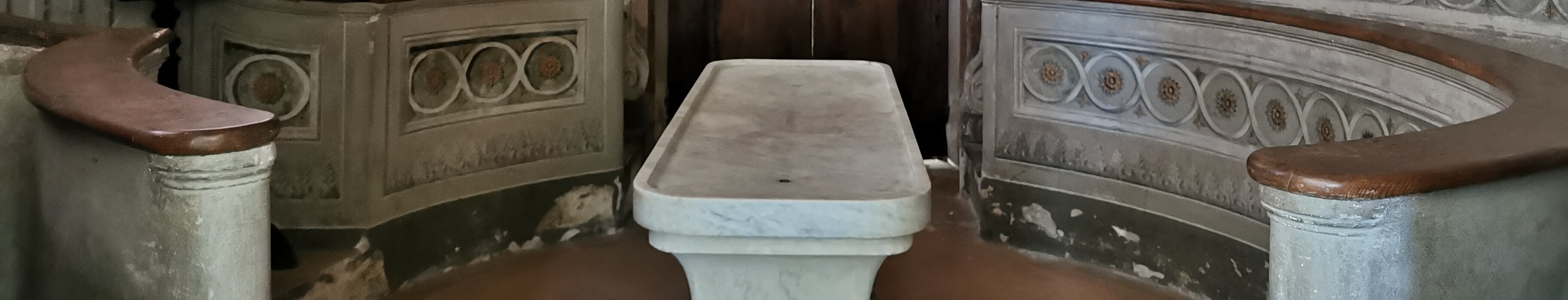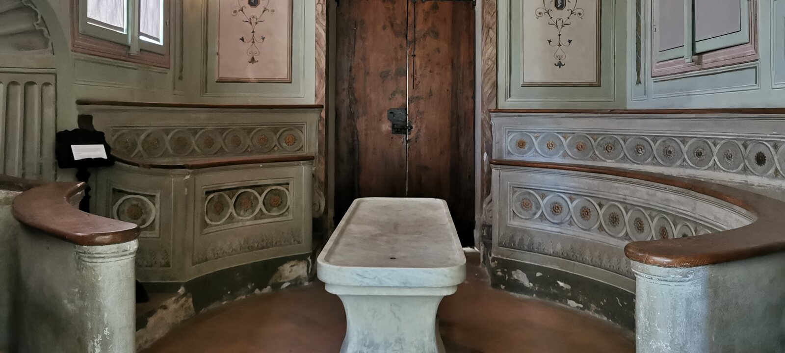 Anatomic theater, 1785, used to demonstrate dissections to medical students. High back chair used by the lecturer in the anatomic theater. Labels