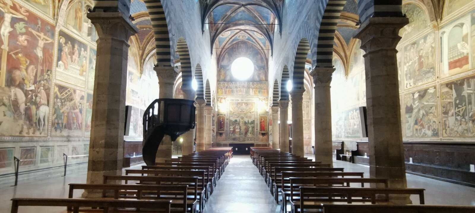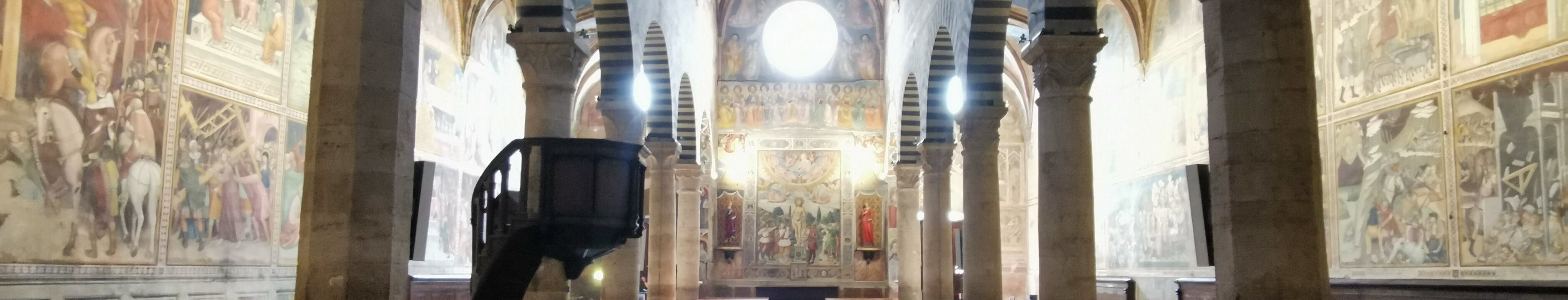Collegiata di Santa Maria Assunta or Duomo (cathedral), early 12th century. Baptismal font. Baptismal font. The Annunciation, by Sebastiano Mainardi, 1379. The church is covered by 14th century frescoes. The Last Supper from the New Testament cycle by Lippo Memmi. 1300Palazzo Communale Labels