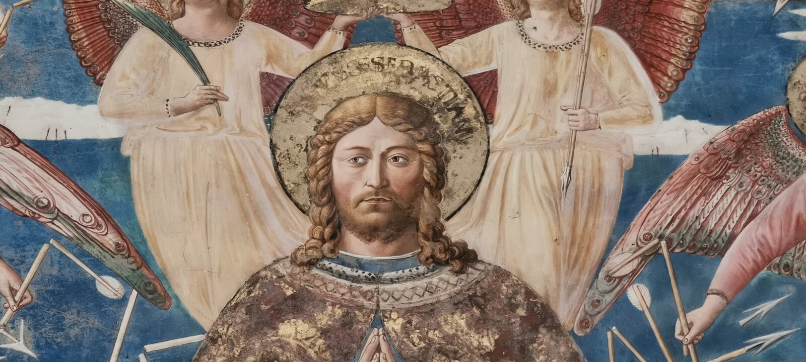 Benozzo Gozzoli, Votive fresco for San Sebastian, 1464. San Sebastian protects the people of San Gimignano from the arrows of God's anger (a symbol of the…