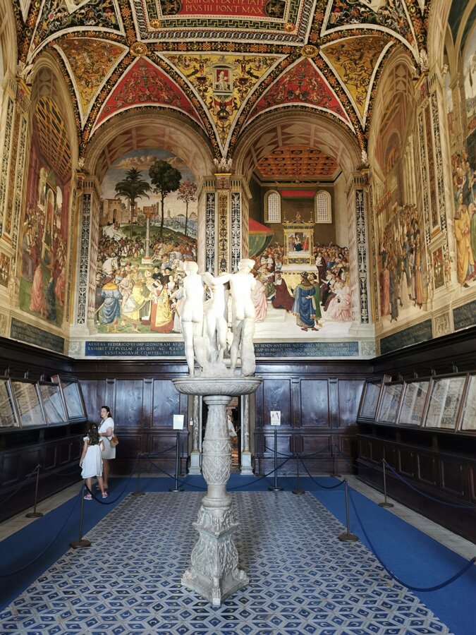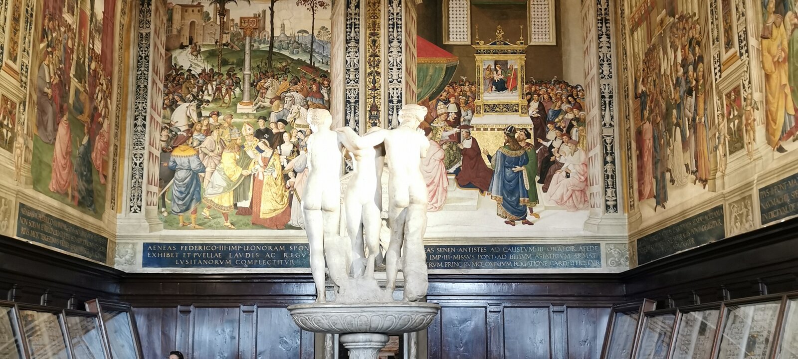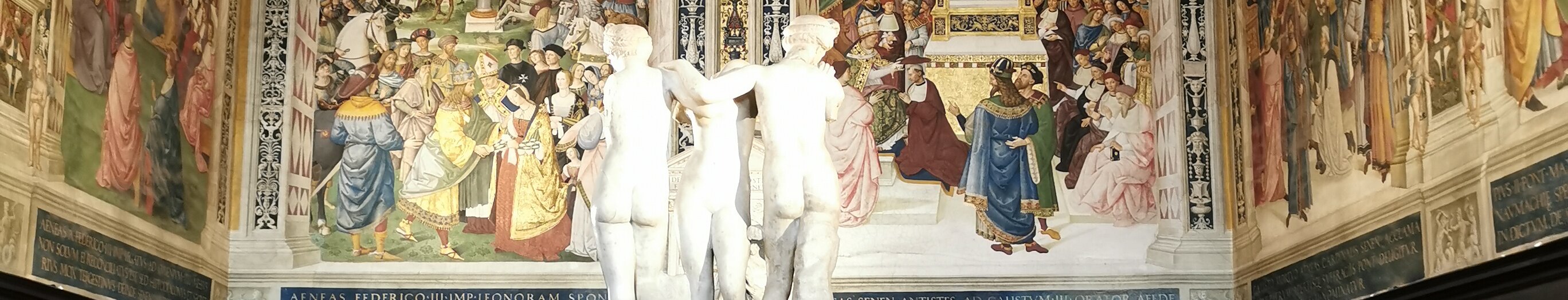 Frescoes painted by the Umbrian Bernardino di Betto, early 16th century. The frescoes tell the story of the life of Siena's favorite son, cardinal Enea Silvio… Three graces, Roman era. Book, 1473. Book, 1481. Book, third quarter of the 15th century. Labels