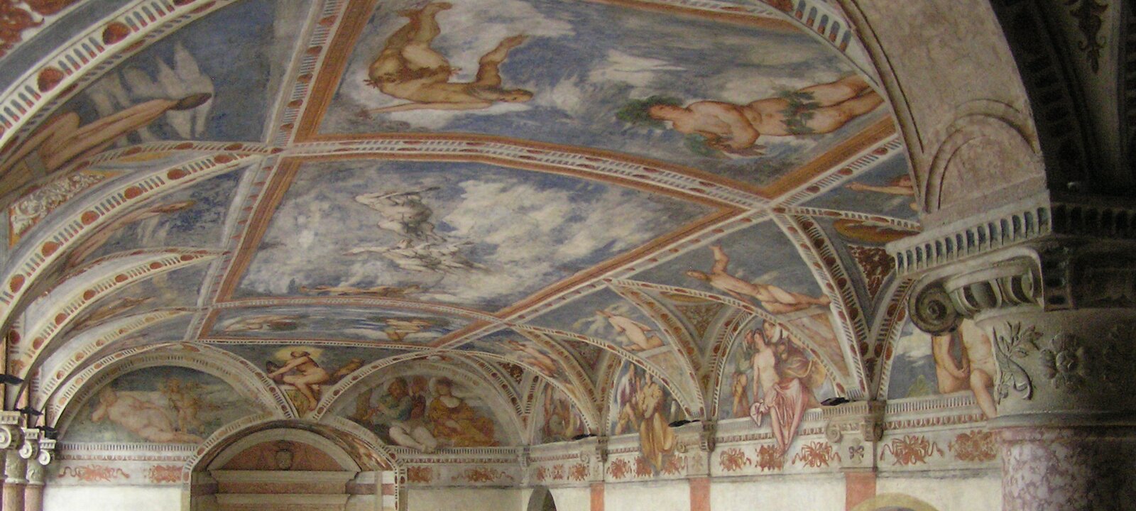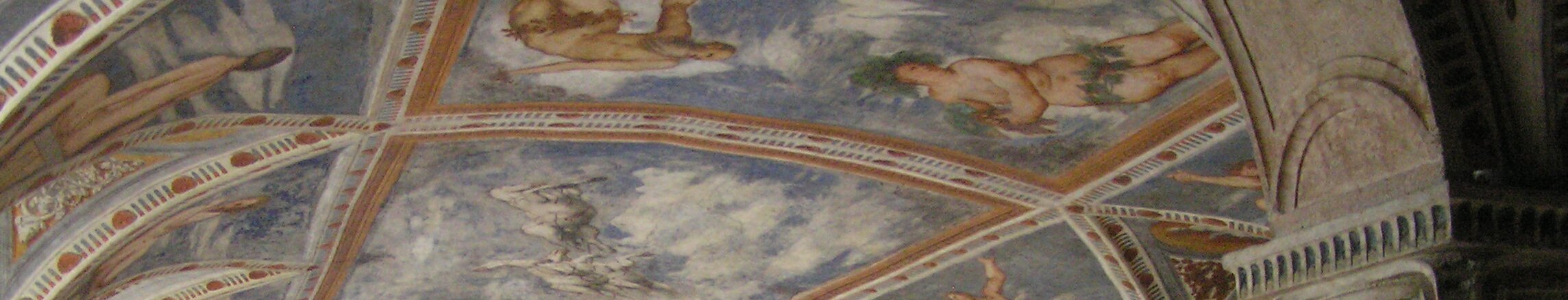 Indoor fresco: more Trento bishops (bottom) with matching ruling emperor and pope. Painted 15-18th centuries.