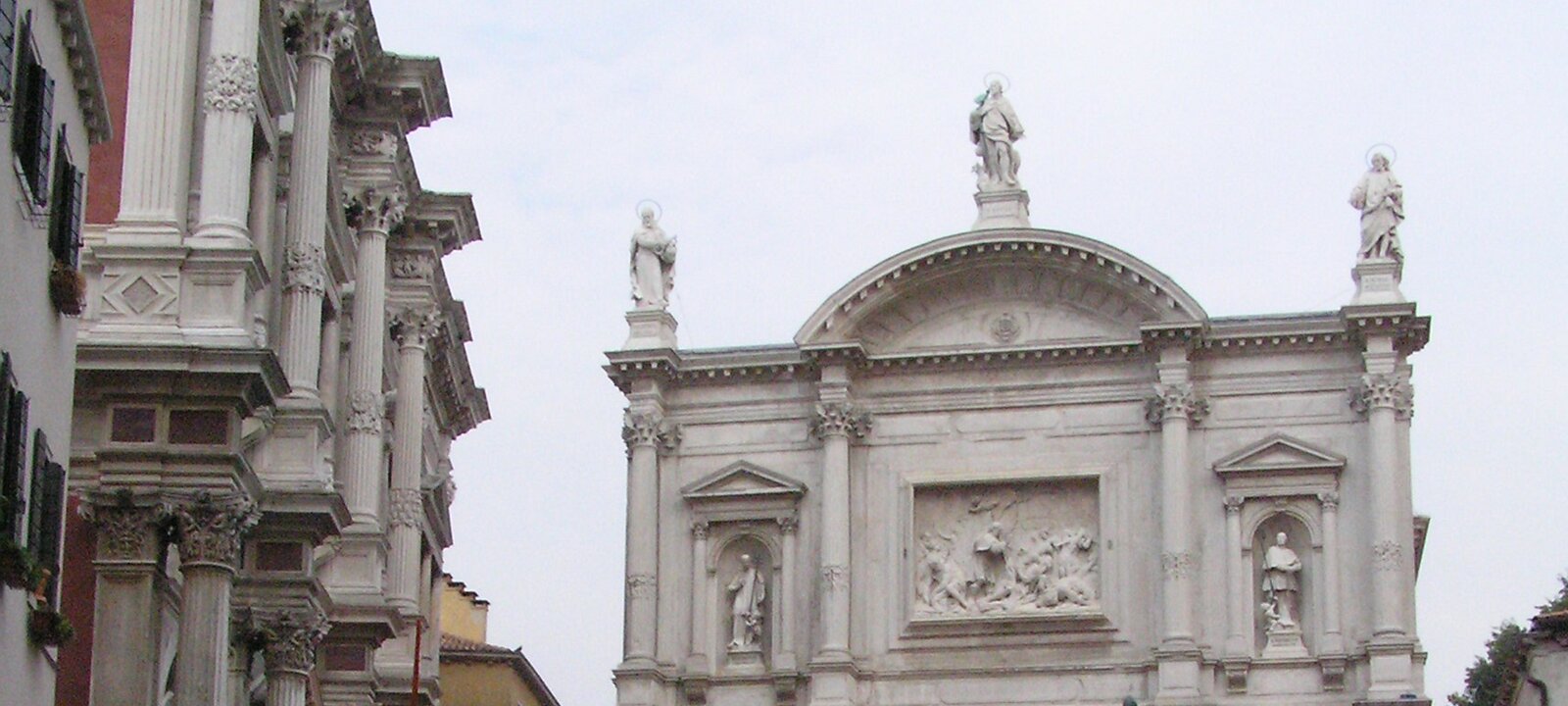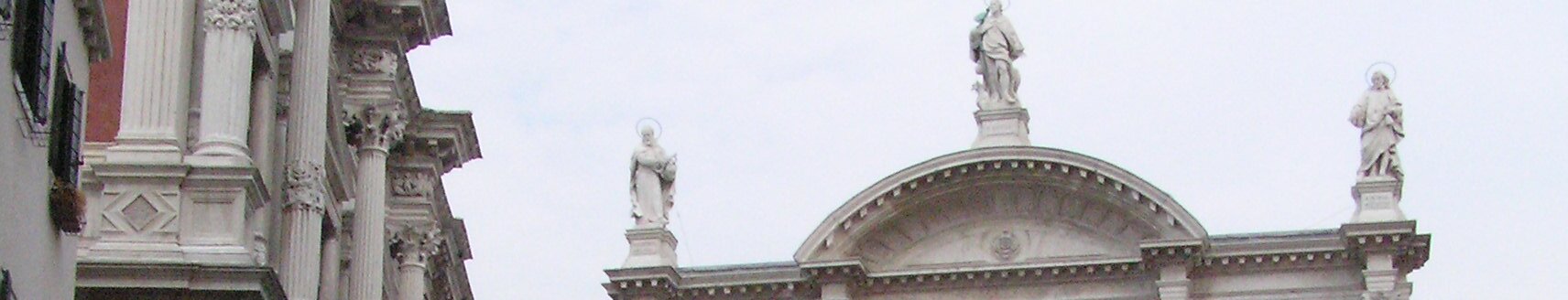 San Rocco (St Roch) church, 1489-1508, facade from 18th century. The altar holds the relics of San Rocco. Ceiling frescoes by Giuseppe Angeli. Top: St Roch captured at the battle of Montpellier, Tintoretto. Bottom: St Roch heals the plague stricken, Tintoretto. Top: Doge and patriarch's wish to St Roch in 1576, Giuseppe Angeli. Bottom: St Roch presented to the pope, Tintoretto. MuranoPiazza San Marco Labels