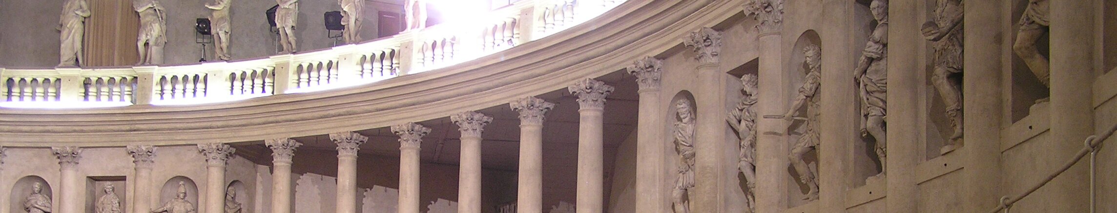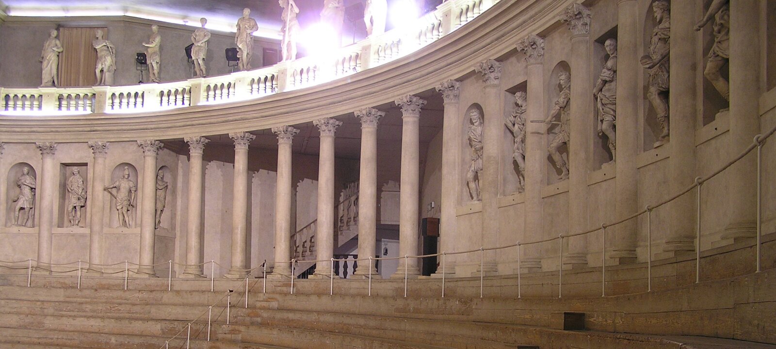 Teatro olimpico, 1585, the first example of a modern covered theater, designed by Palladio, but built after his death. The teatro itself, still used for representations. Inside the teatro. Scene with lavish classical adornment. VillasChurches Labels