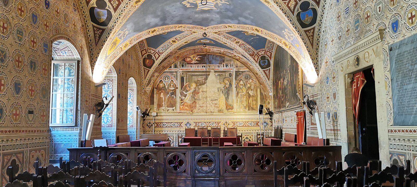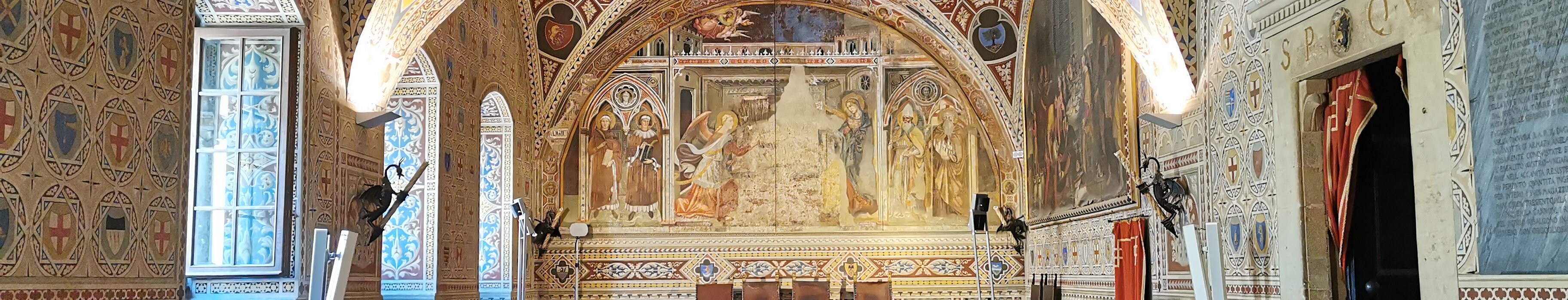 On the main wall there is a fresco depicting the Annunciation and Saints stemma del Comune. Giusto, "Ottaviano, Cosmas and Damian", painted in 1383 by Niccold…
