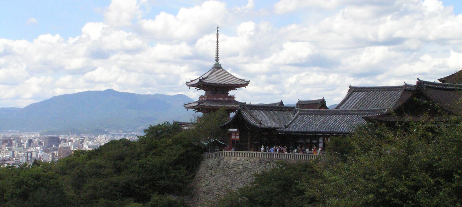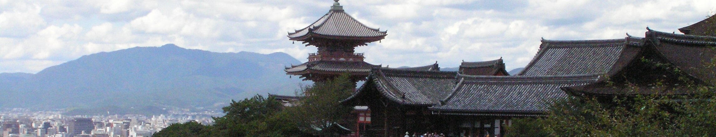 Kiyomizu-dera Buddhist temple, originally built in 798, current structure built in 1633, no nail used. Three-storey pagoda. Closer view of the pagoda. Jishu shrine, dedicated to a god of Love. Close-up of the Jishu shrine. View of Kyoto from the temple. Heian ShrineGinkaku-ji Temple Labels