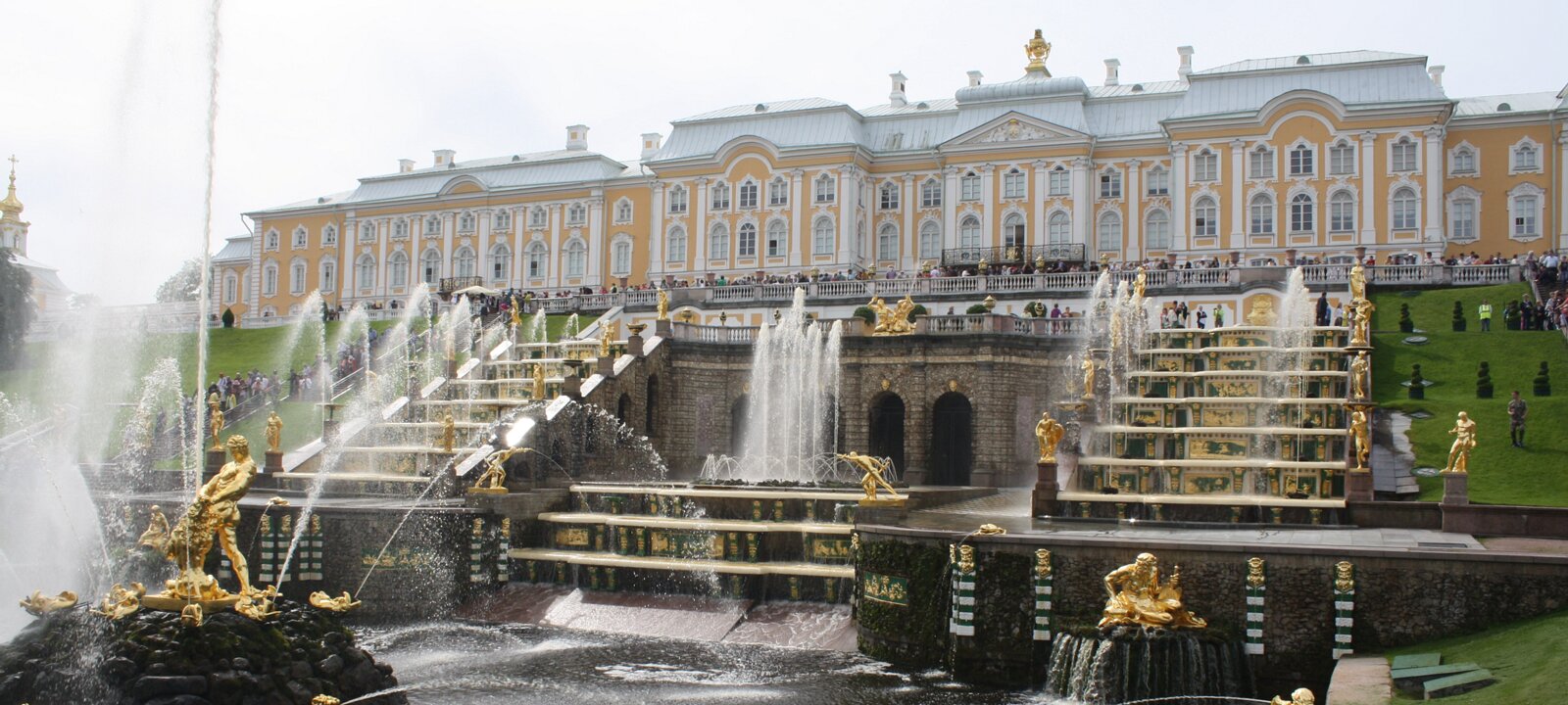 Great cascade, commissioned by Peter I the Great, 37 gilt bronze statues, Samson tears open the jaws of a lion, a metaphore for the victory of Russia over Sweden. Samson tears open the jaws of a lion, a metaphore for the victory of Russia over Sweden. Samson tears open the jaws of a lion, a metaphore for the victory of Russia over Sweden. Samson tears open the jaws of a lion, a metaphore for the victory of Russia over Sweden. Samson tears open the jaws of a lion, a metaphore for the victory of Russia over Sweden. Lower park Labels