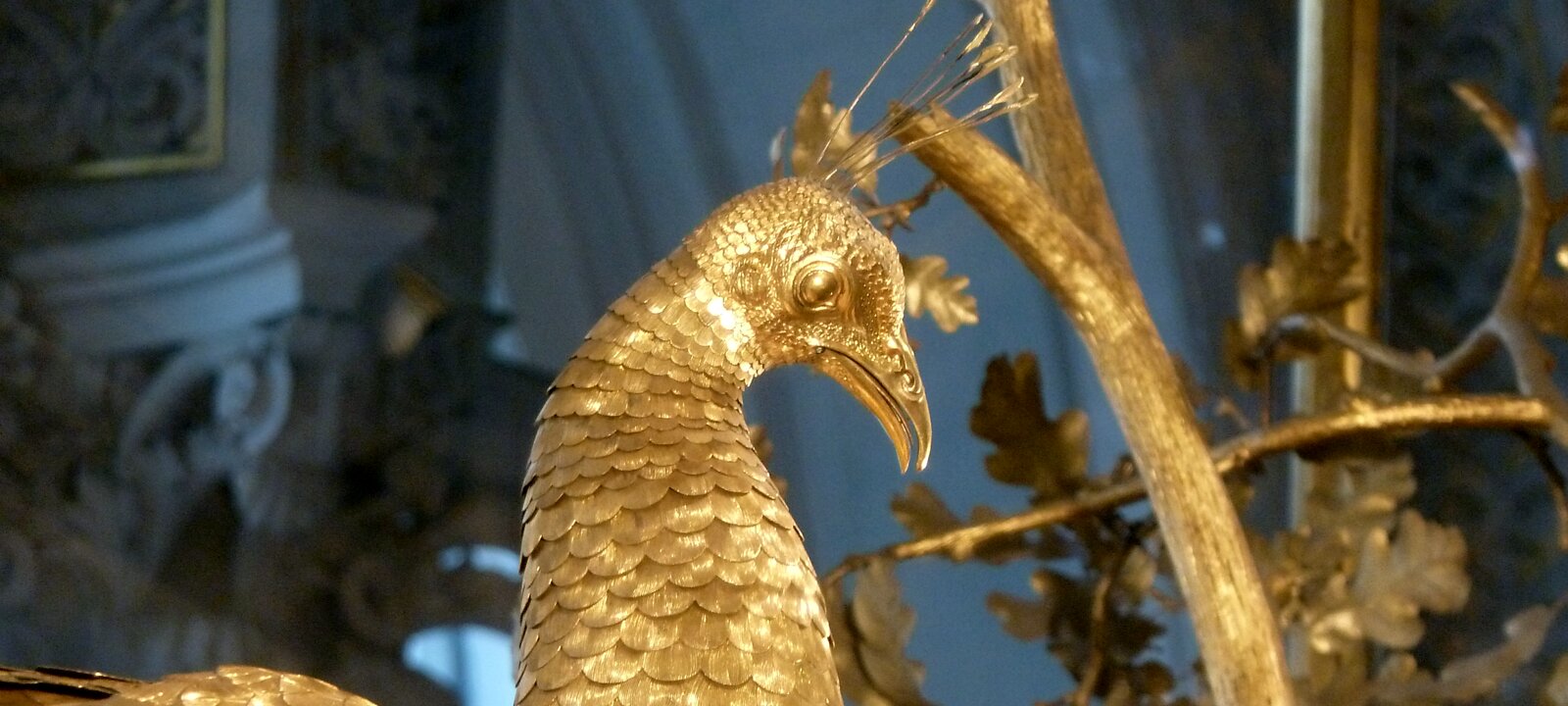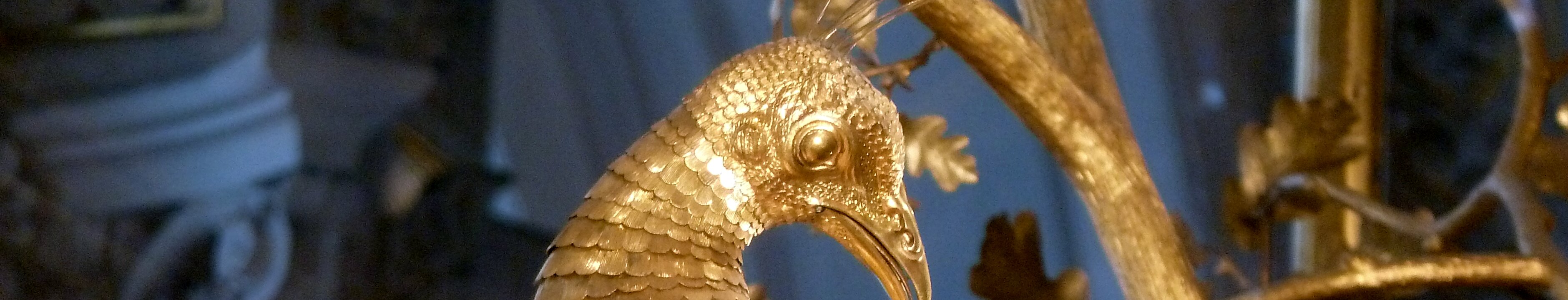 Peacock clock, attributed to James Cox, an English mechanic, clockmaker and jeweller in the 18th century. The central mushroom displays the time. Malachite roomThrone room Labels
