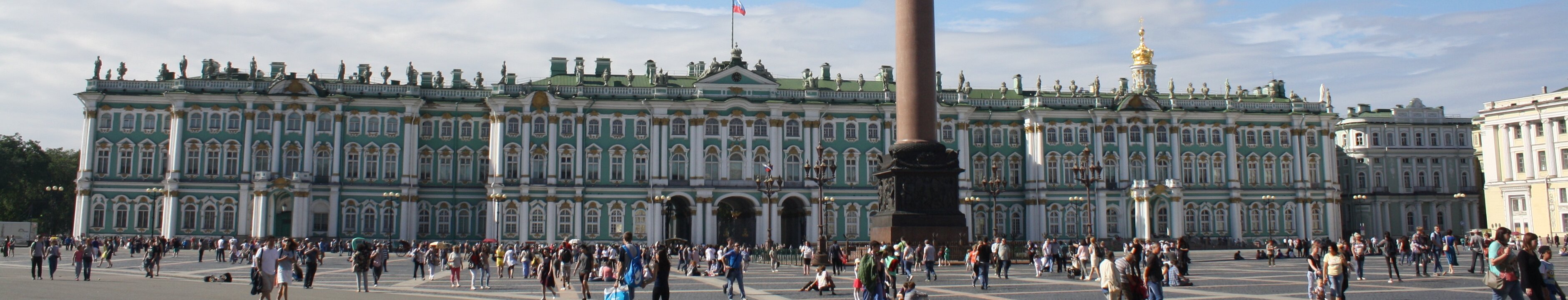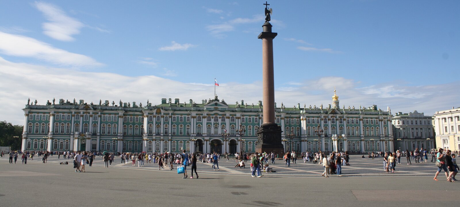 Palace square, designed by Carlo Rossi, between the Winter palace, the entrance of the Hermitage museum , and the General Staff building (photo).
