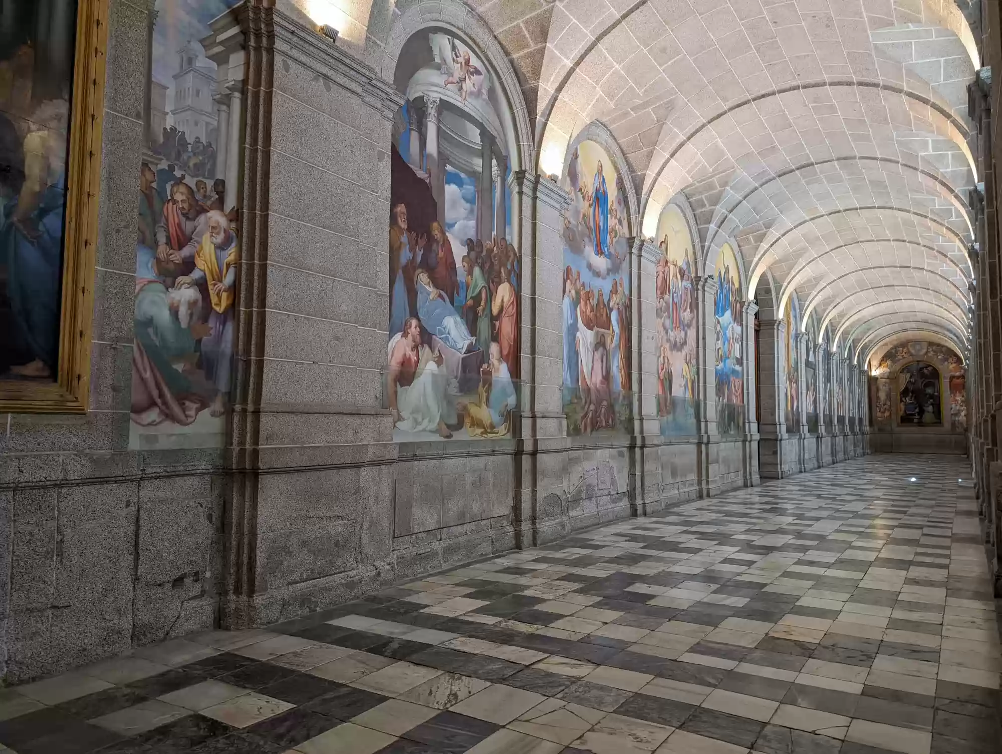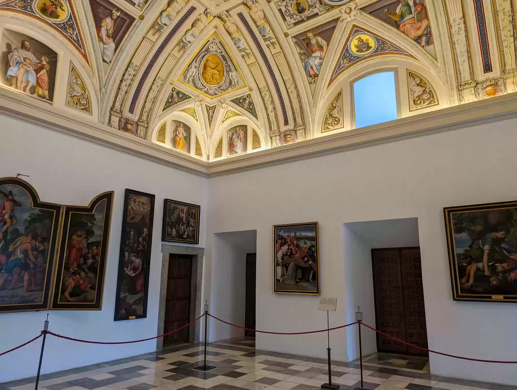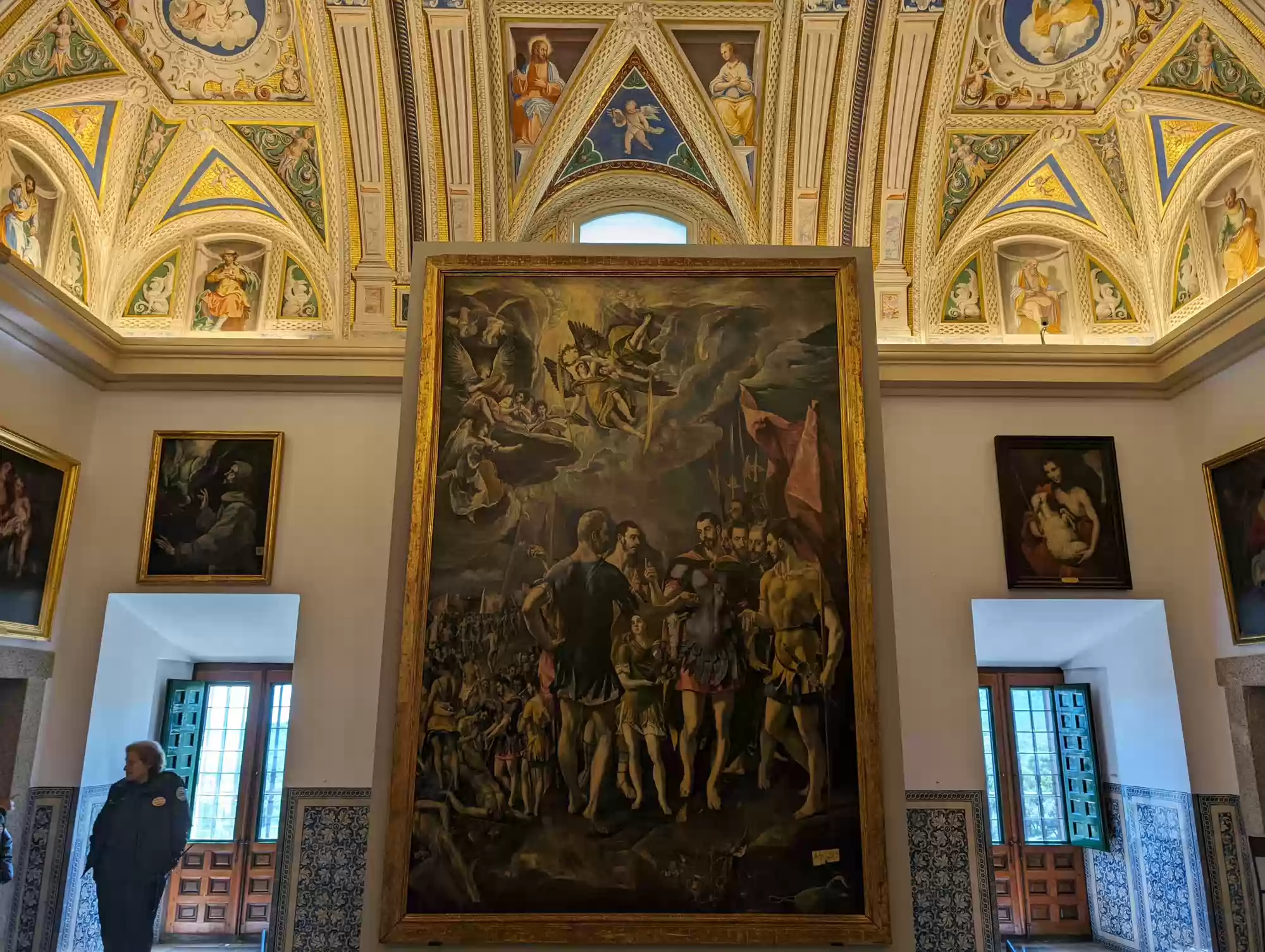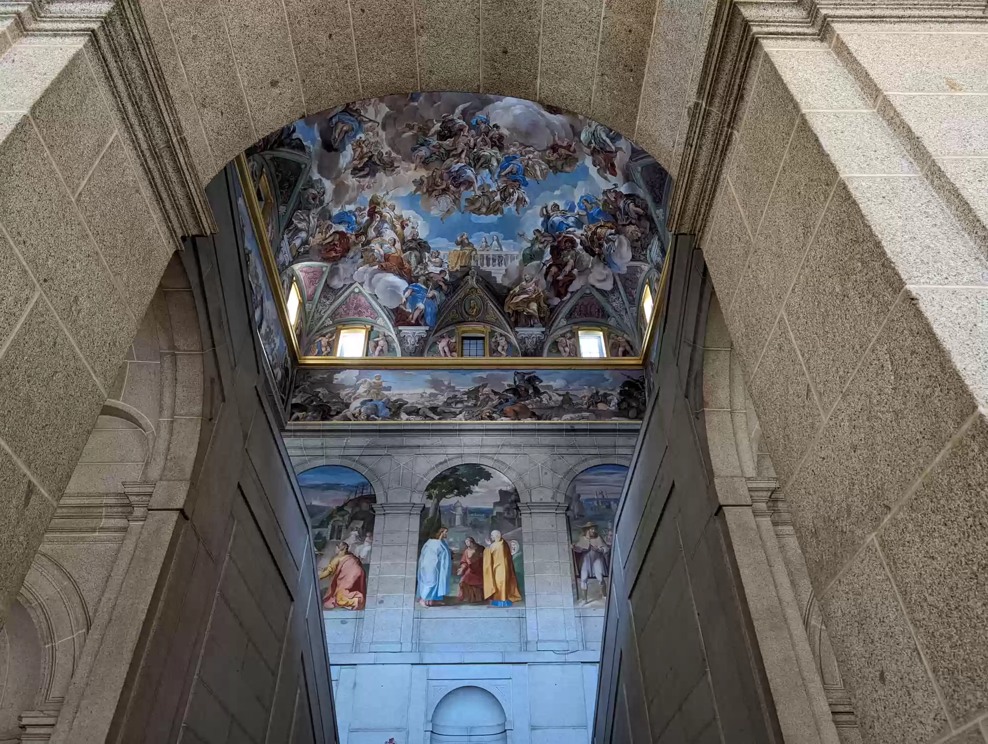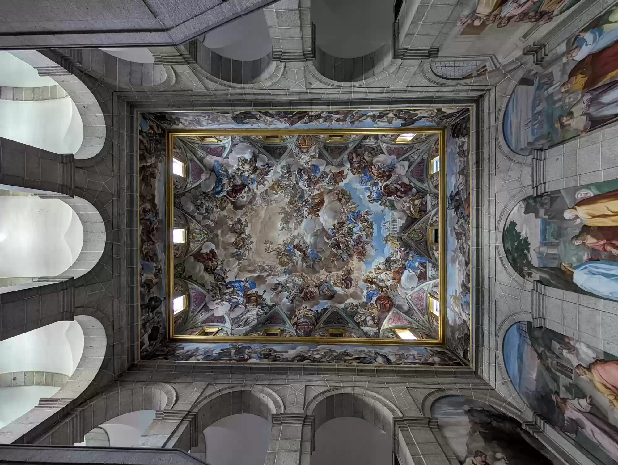 Former lobby of the monastery. Staircase. Staircase; vaulted ceiling by Luca Giordano (Naples), 1692-1693: The triumph of the house of Austria. Staircase; vaulted ceiling by Luca Giordano (Naples), 1692-1693: The triumph of the house of Austria. Staircase; vaulted ceiling by Luca Giordano (Naples), 1692-1693: The triumph of the house of Austria. Cloister. Fresco, 1586-1591. Life of the Virgin and Christ, Provisional church, used during the construction of the monastery. Titian, The martyrdom of Saint Lawrence, 1564-1567. Chapter rooms: vestibule. Entrance to the two side chapter rooms. Chapter rooms: vestibule. Entrance to the two side chapter rooms. El Greco, The martyrdom of Saint Maurice and the Theban Legion. Titian, The last supper, 16th century. Chapter rooms. Chapter rooms. Chapter rooms. Chapter rooms. Chapter rooms. LibraryPantheon Labels