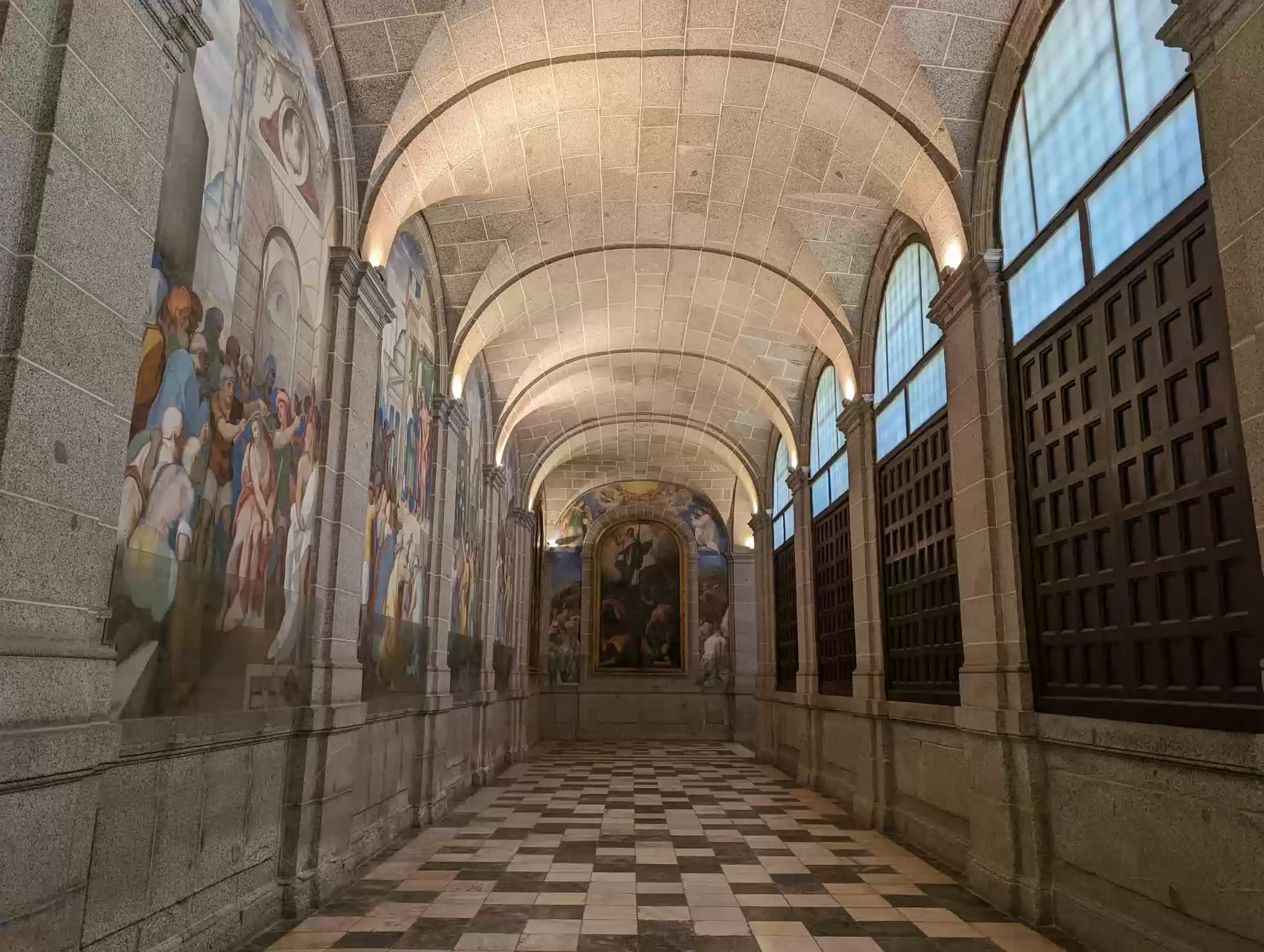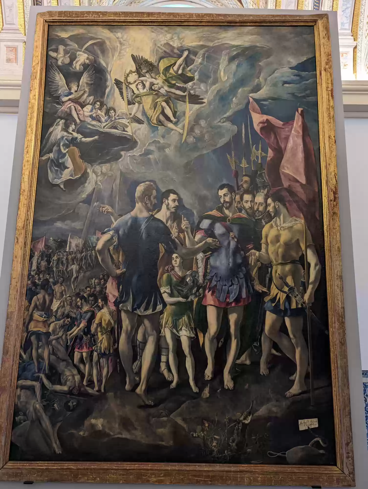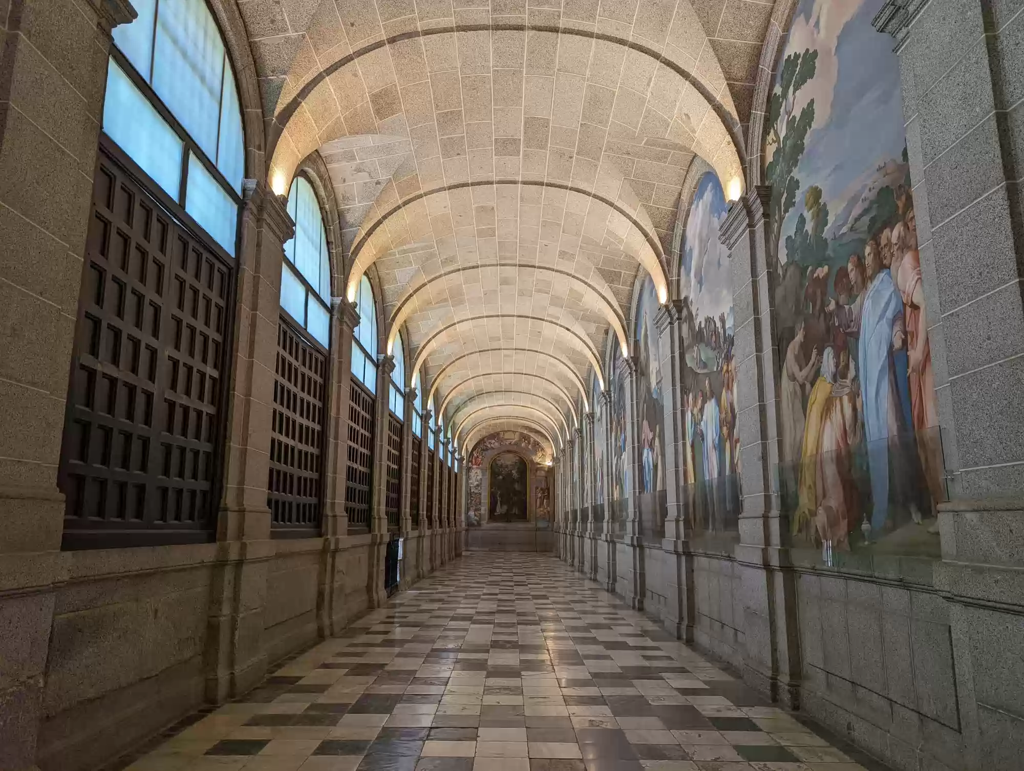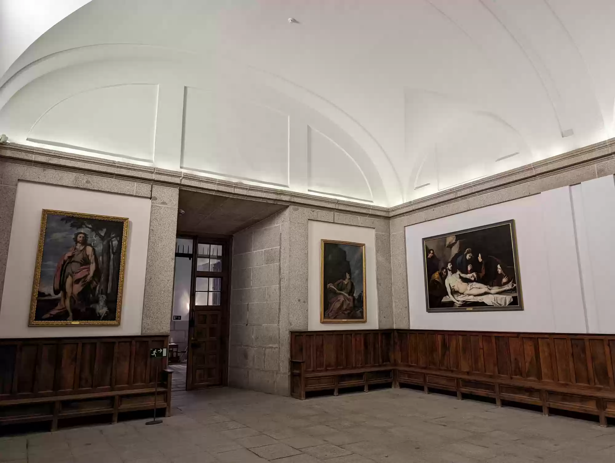 Former lobby of the monastery. Staircase. Staircase; vaulted ceiling by Luca Giordano (Naples), 1692-1693: The triumph of the house of Austria. Staircase; vaulted ceiling by Luca Giordano (Naples), 1692-1693: The triumph of the house of Austria. Staircase; vaulted ceiling by Luca Giordano (Naples), 1692-1693: The triumph of the house of Austria. Cloister. Fresco, 1586-1591. Life of the Virgin and Christ, Provisional church, used during the construction of the monastery. Titian, The martyrdom of Saint Lawrence, 1564-1567. Chapter rooms: vestibule. Entrance to the two side chapter rooms. Chapter rooms: vestibule. Entrance to the two side chapter rooms. El Greco, The martyrdom of Saint Maurice and the Theban Legion. Titian, The last supper, 16th century. Chapter rooms. Chapter rooms. Chapter rooms. Chapter rooms. Chapter rooms. LibraryPantheon Labels