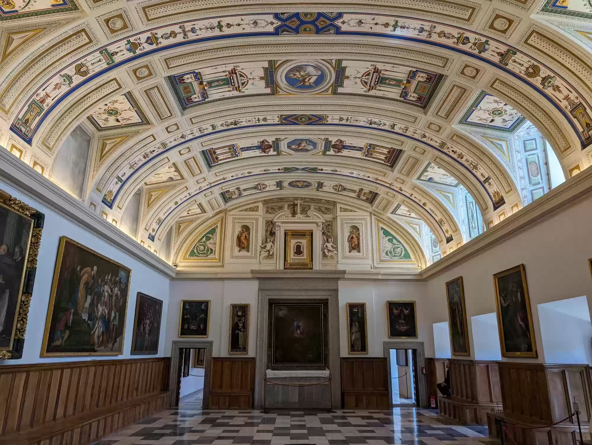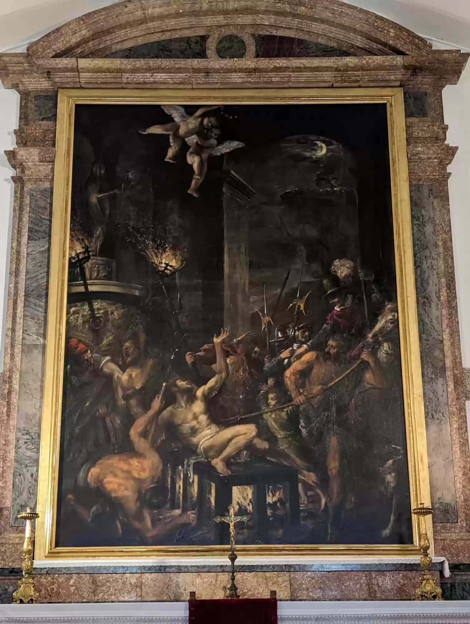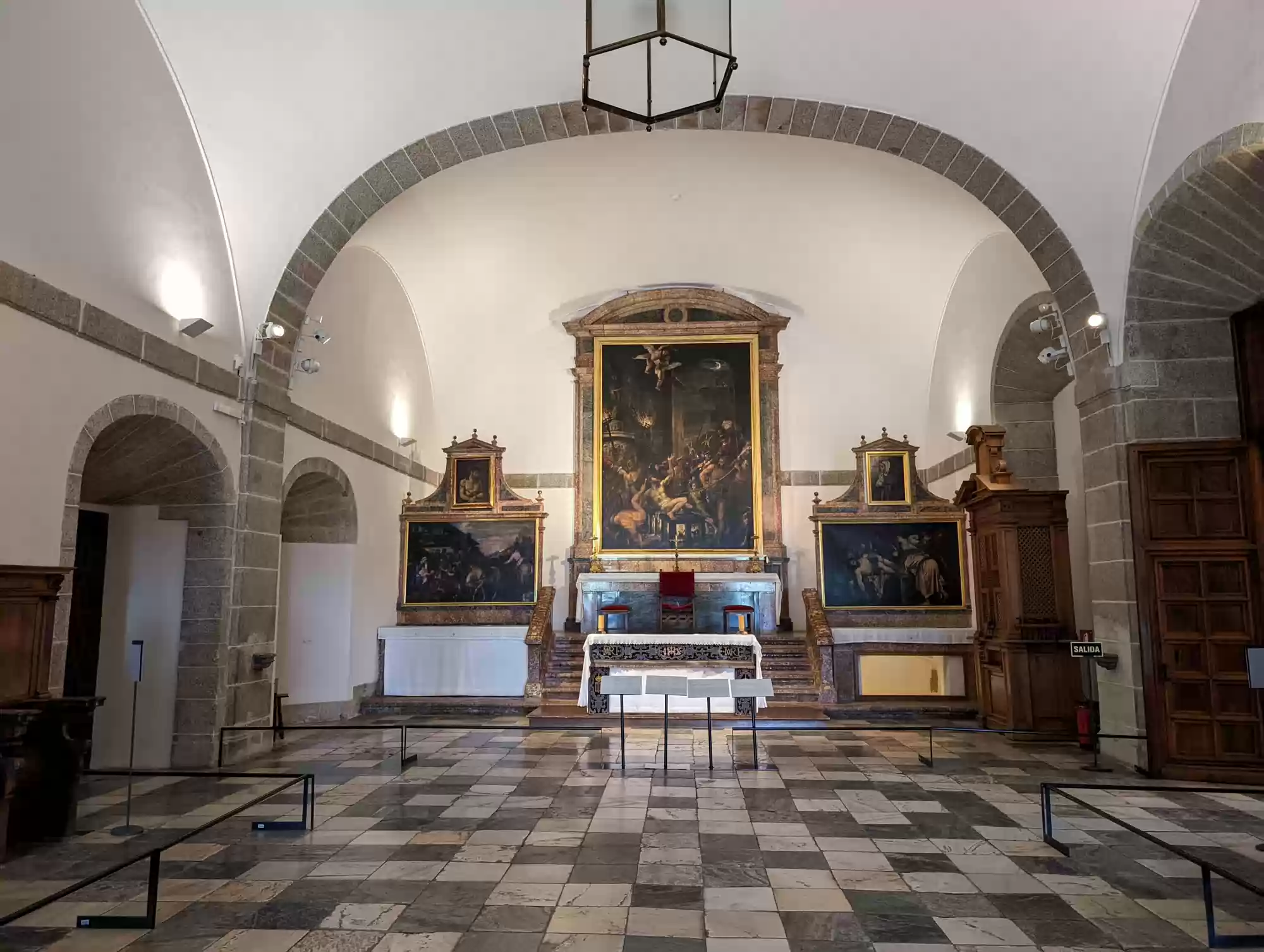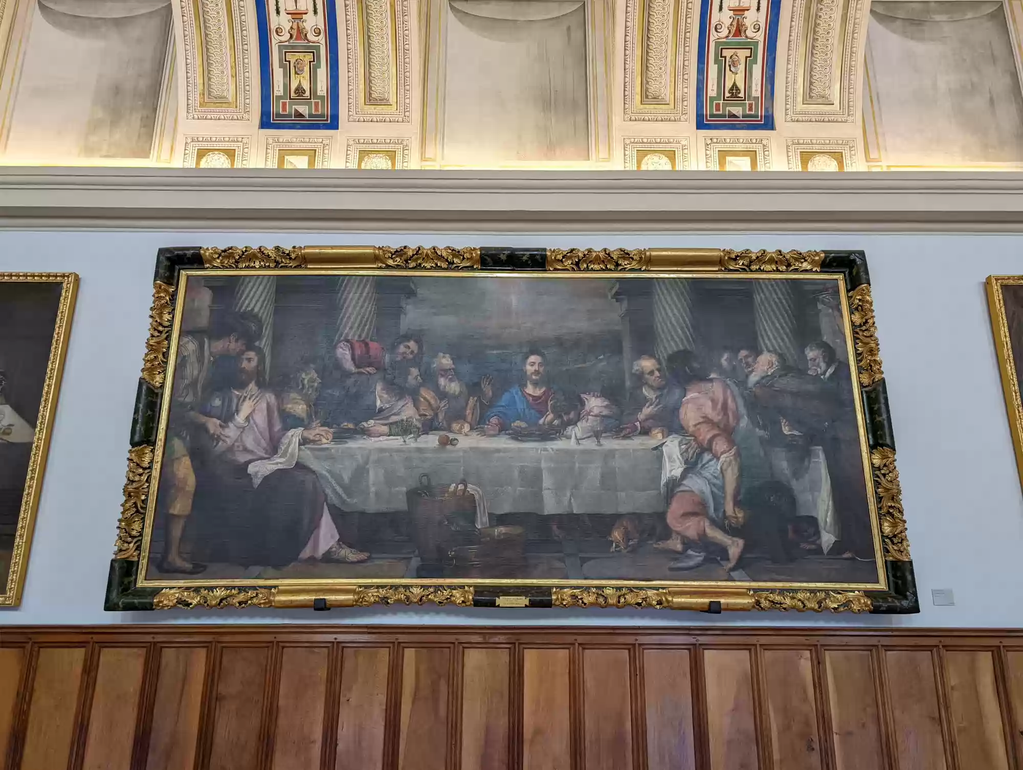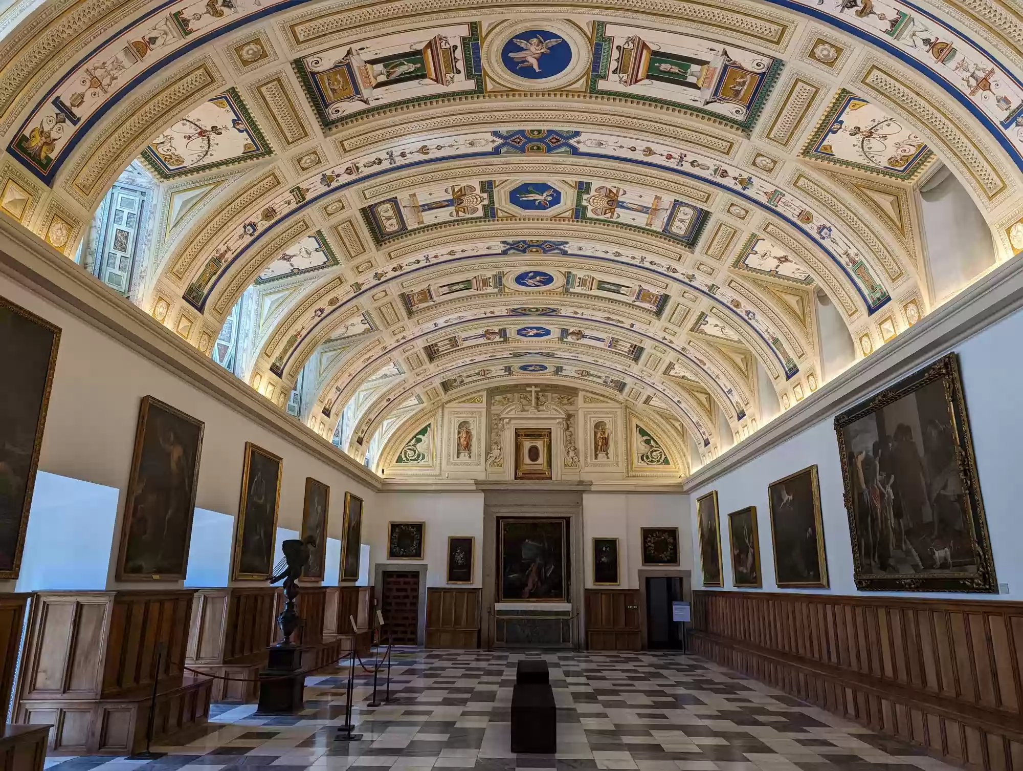 Former lobby of the monastery. Staircase. Staircase; vaulted ceiling by Luca Giordano (Naples), 1692-1693: The triumph of the house of Austria. Staircase; vaulted ceiling by Luca Giordano (Naples), 1692-1693: The triumph of the house of Austria. Staircase; vaulted ceiling by Luca Giordano (Naples), 1692-1693: The triumph of the house of Austria. Cloister. Fresco, 1586-1591. Life of the Virgin and Christ, Provisional church, used during the construction of the monastery. Titian, The martyrdom of Saint Lawrence, 1564-1567. Chapter rooms: vestibule. Entrance to the two side chapter rooms. Chapter rooms: vestibule. Entrance to the two side chapter rooms. El Greco, The martyrdom of Saint Maurice and the Theban Legion. Titian, The last supper, 16th century. Chapter rooms. Chapter rooms. Chapter rooms. Chapter rooms. Chapter rooms. LibraryPantheon Labels