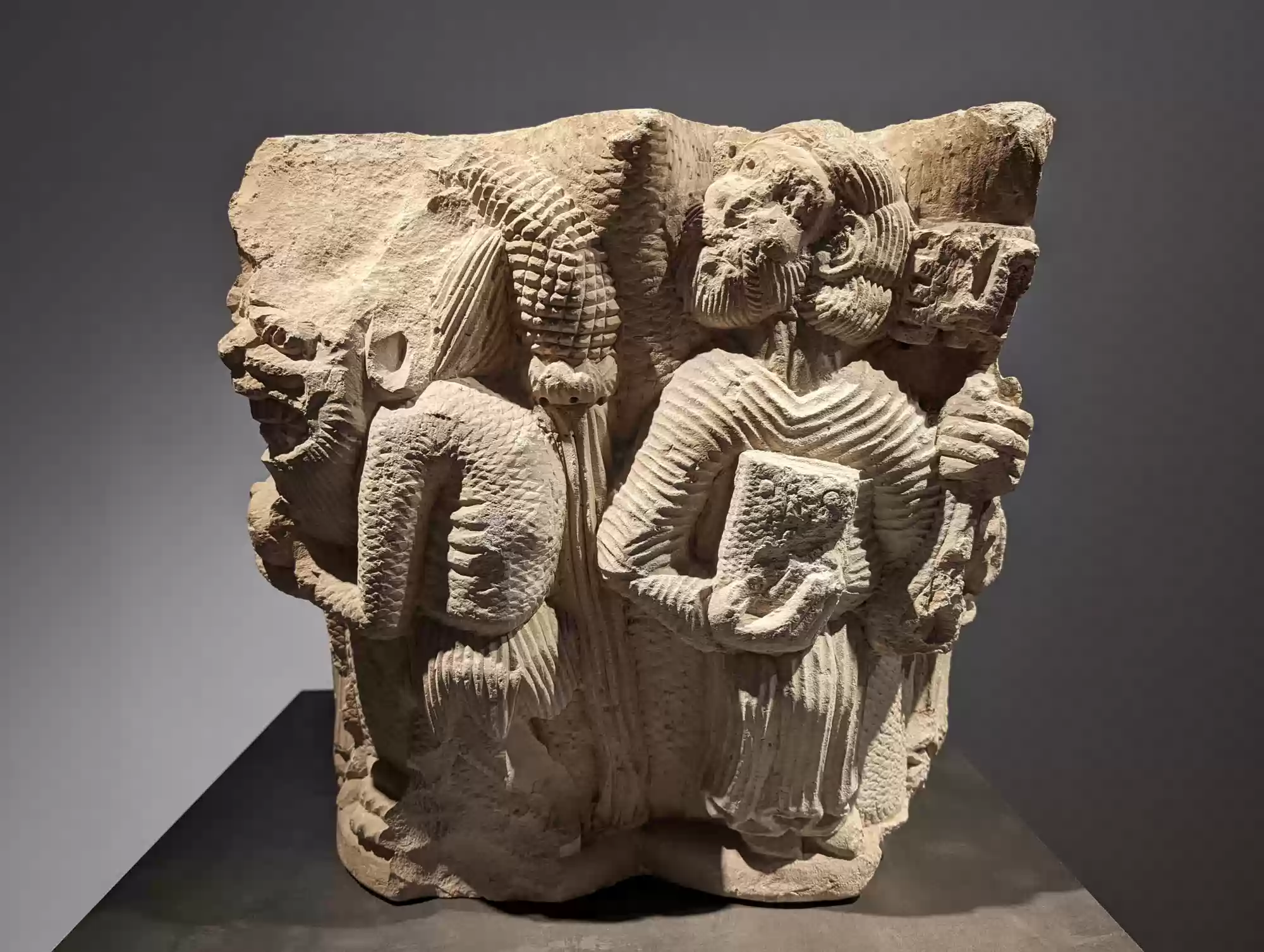 Romanesque capital representing the temptation of Christ, early 13th century.