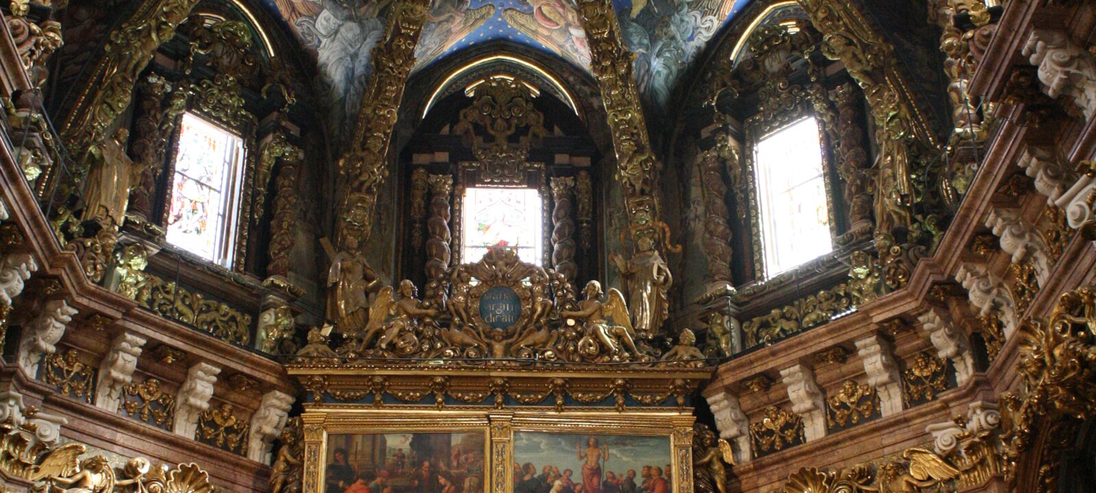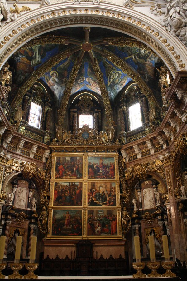 Main nave. Left aisle. Main tower with alabaster windows. Main tower with alabaster windows. Main tower with alabaster windows. Main tower with alabaster windows. Alabaster windows. Alabaster windows. Choir and main tower. Altarpiece, Italian renaissance influence, 16th century. Each painting is around 4 square meters. Altarpiece. Altarpiece. Altarpiece. Altarpiece. Altarpiece. ExteriorChapels Labels