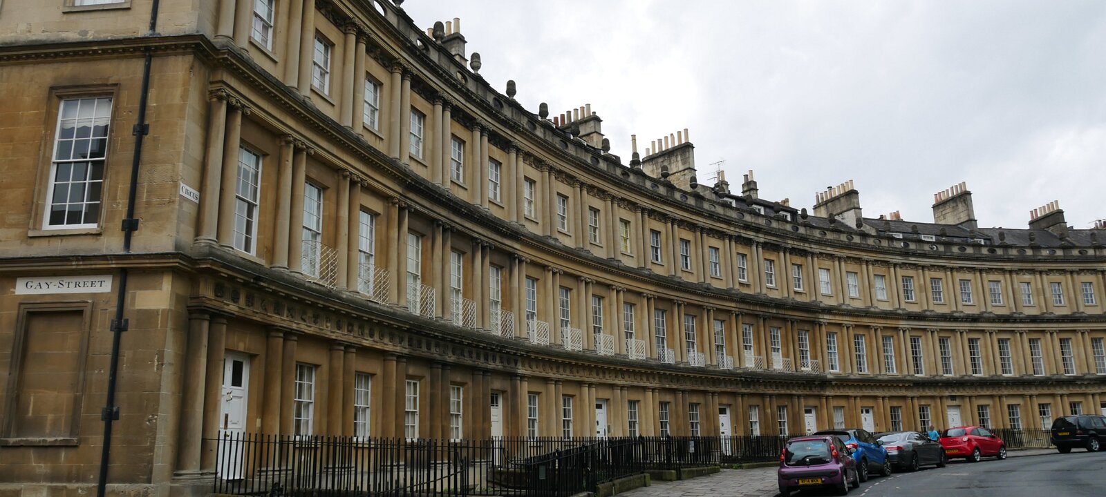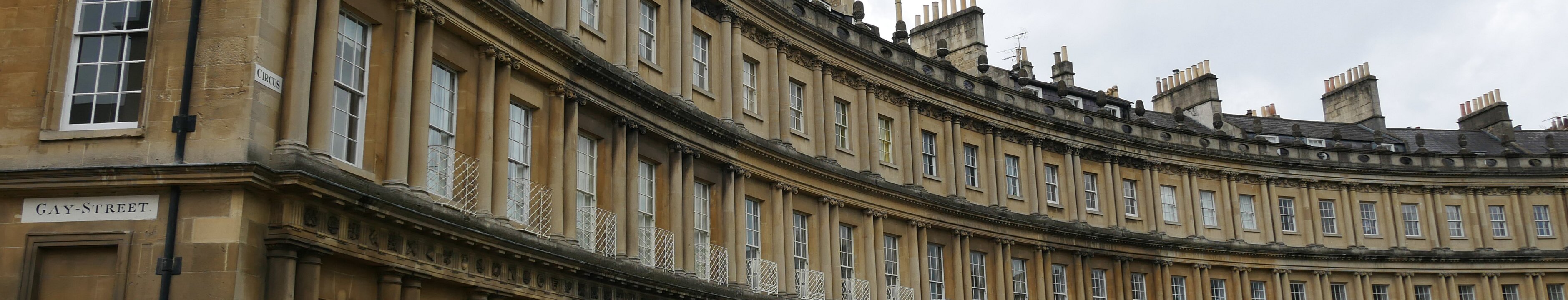 17th century houses, arranged around a full circle with diameter 100m. The frieze consists of more than 500 different pictures. Plane trees sit in the middle of the circus. Gay street, one of the 3 streets leading to the circus. Abbey churchBridge Pulteney Labels