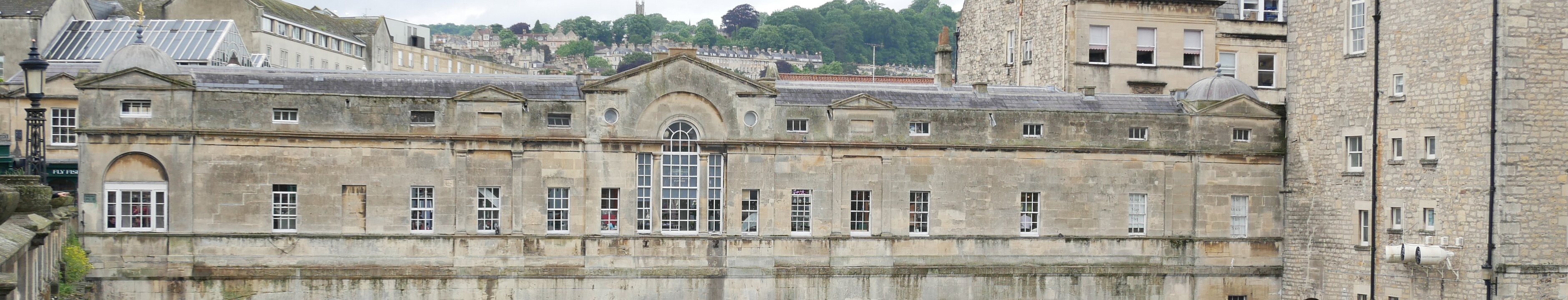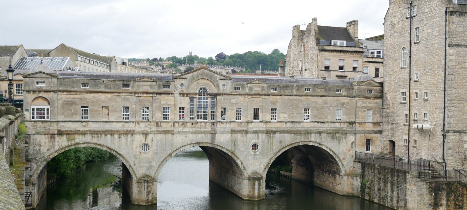 Pulteney bridge, the old toll bridge, fully covered on both sides by stores. Over the bridge. Over the bridge. CircusRoman Baths Labels