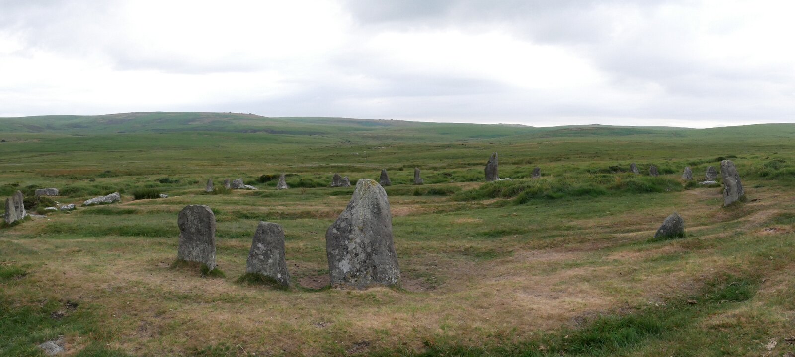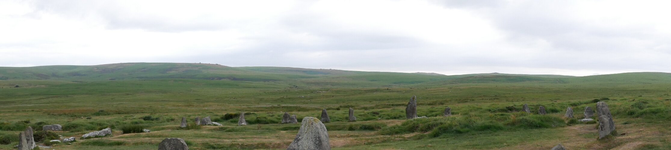 Scorhill stone circle, bronze age (2100-750 BCE), diameter: 27 meters. Scorhill stone circle. Scorhill stone circle. 360 degrees panorama from the center of the circle. Scorhill stone circle. OkehamptonTavistock Labels