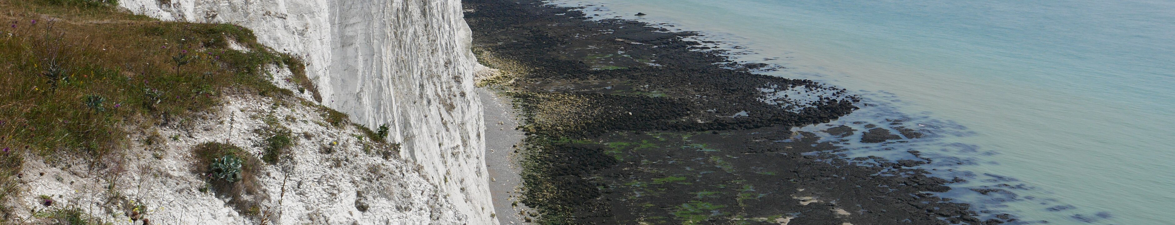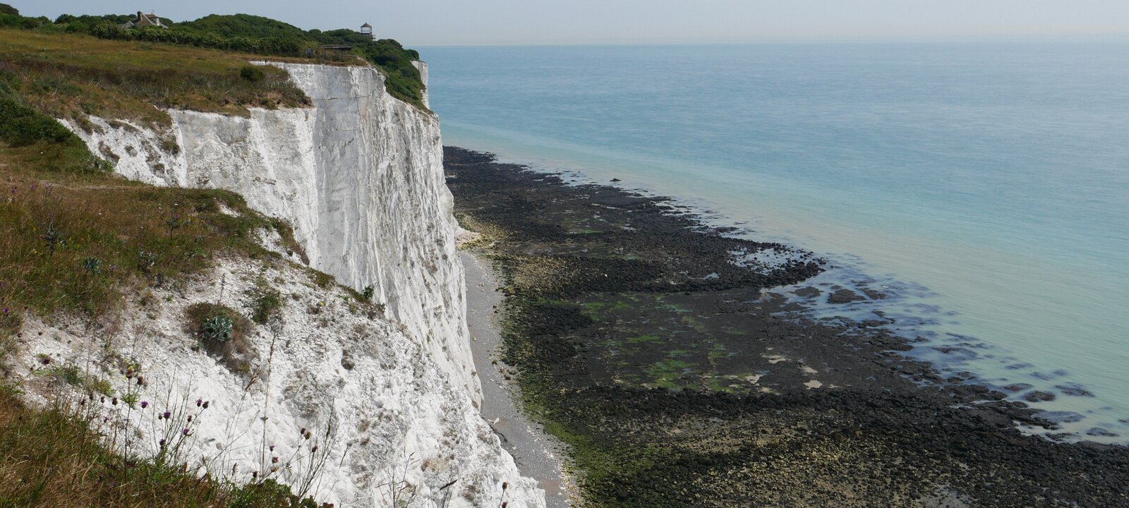 Chalk cliffs in Dover. The maximum height of the 13km long cliffs is 110m. They form a natural barrier against invasion from mainland Europe. The Romans were…