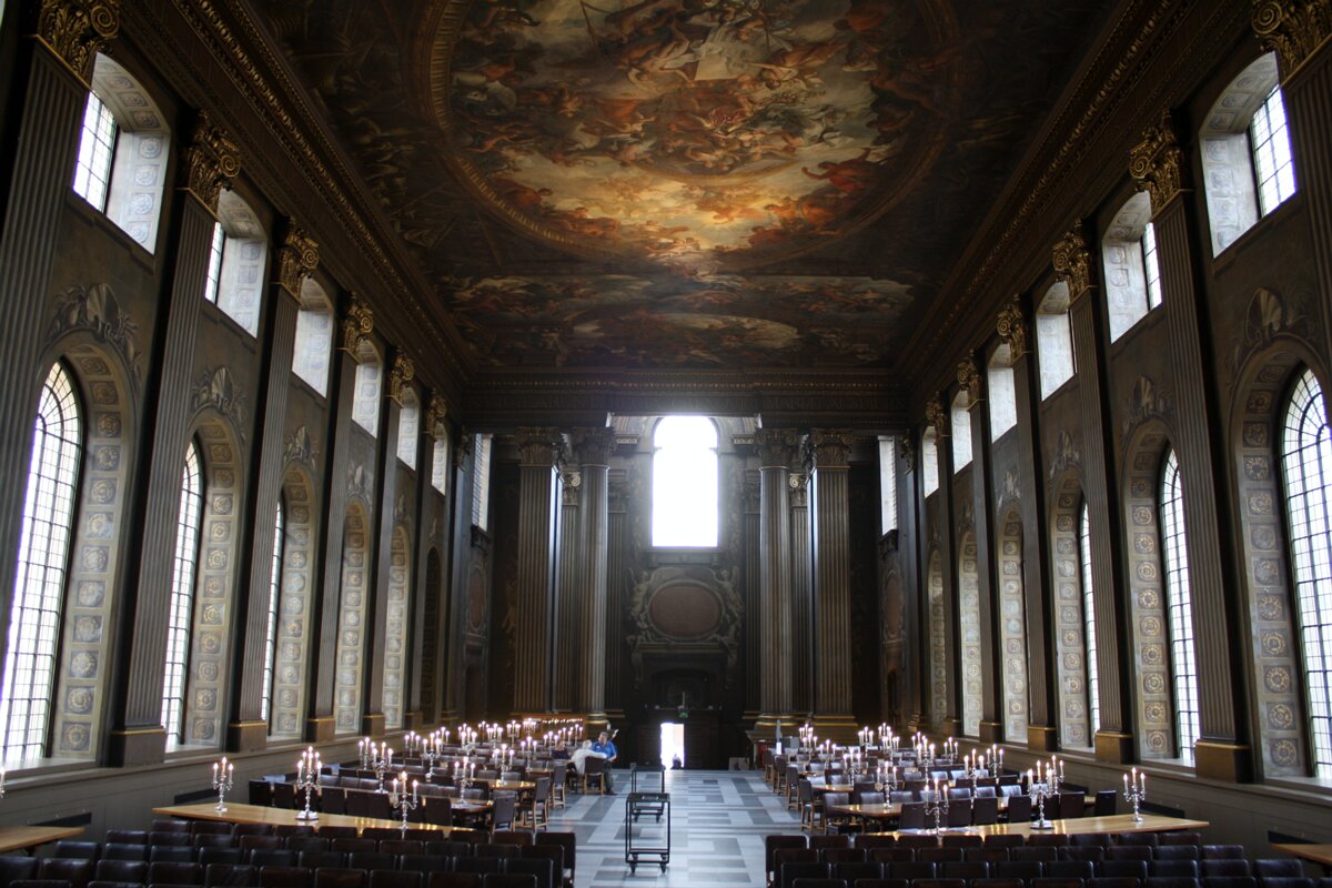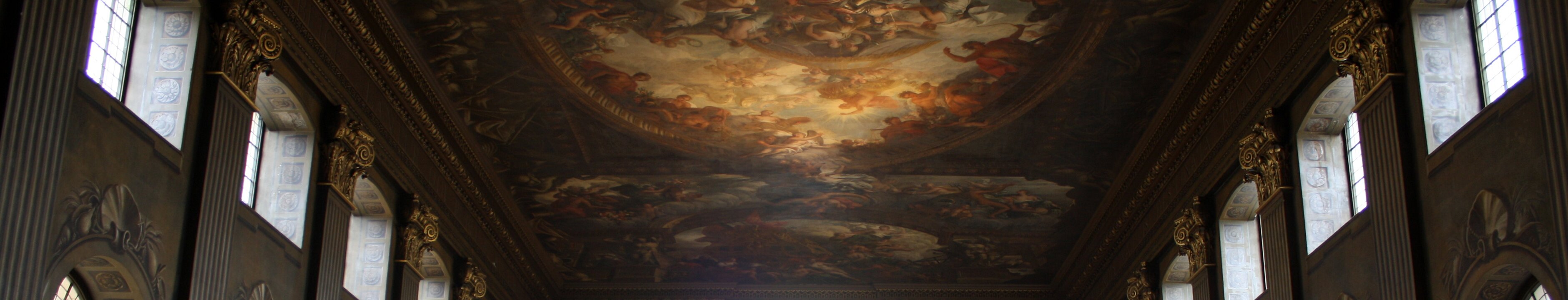 Painted hall was built in the first half of the 18th century and painted in 1779-1789. George I, his family and his virtues. Europe. America. Africa. Asia. Labels