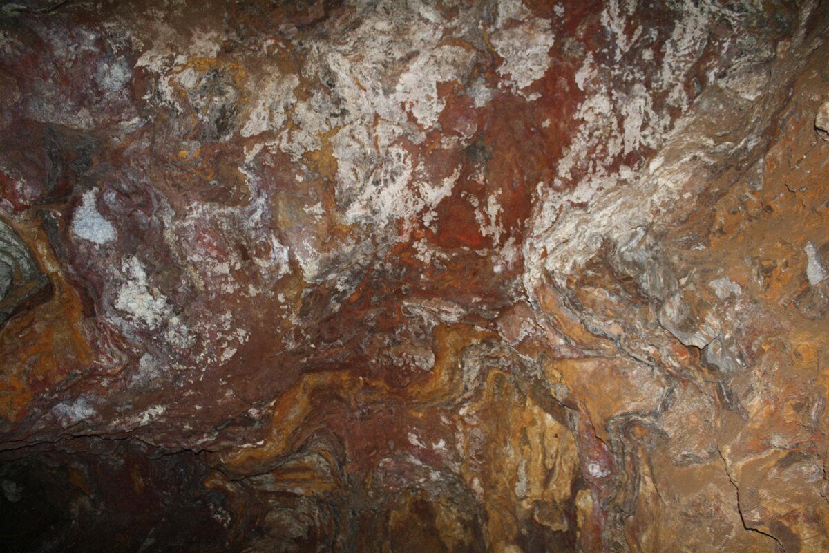Queen's mine operated between 1877 and 1975. Copper, silver, lead, and gold was extracted from the mine's ore. A crack in the mine. Holes, dynamite and leads. Mobile bathroom. Pneumatic tools. Labels