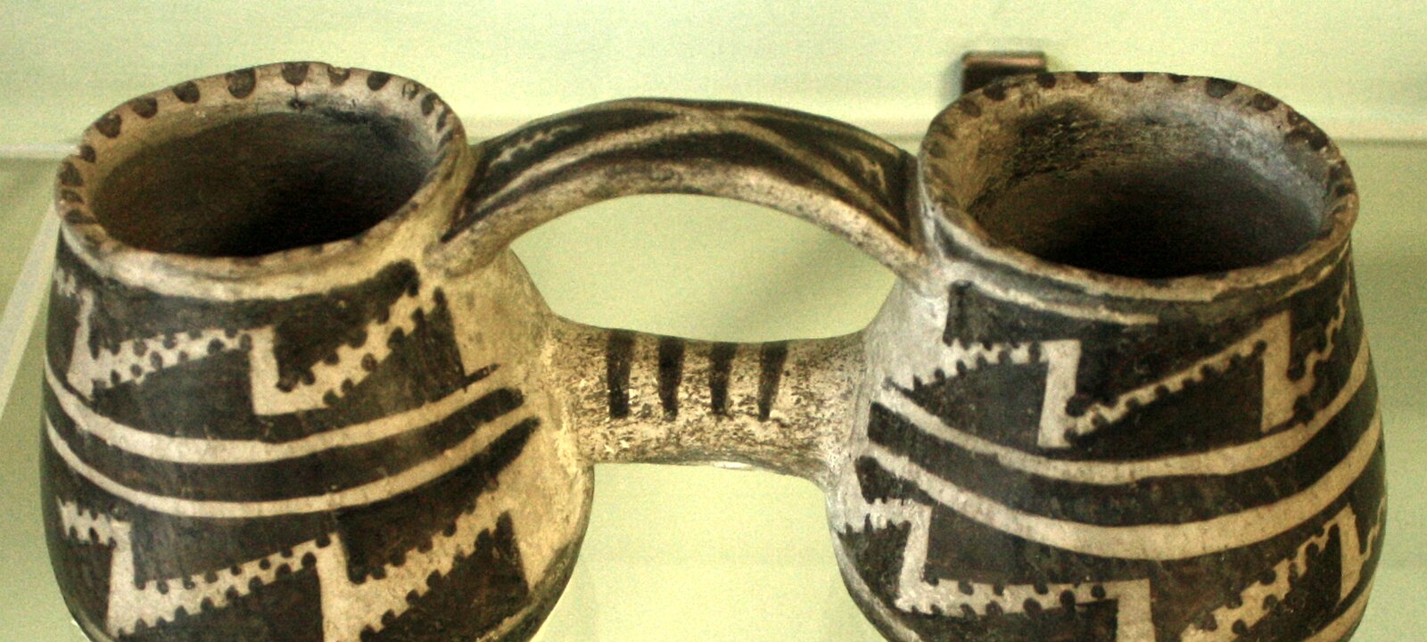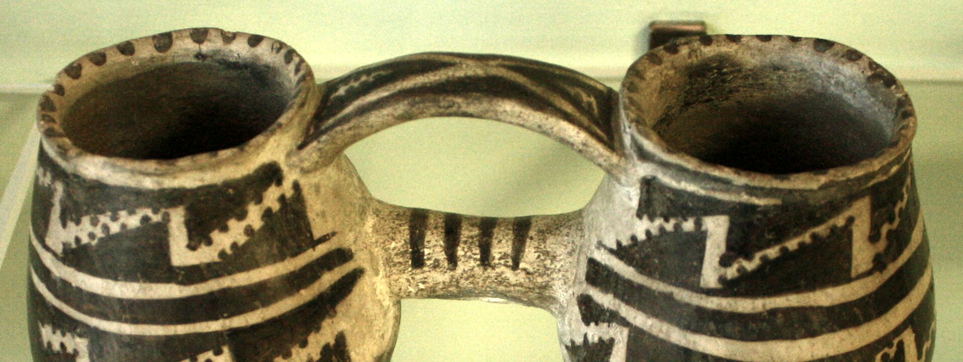 Basketmaker period (1-450 AD). Bag made of mountain sheep hide. Gourd vessel suspended in a net of yucca fiber and human hair. Gourd-form pitcher. Pipe with animal head. Animal effigy pottery, unusual in Mesa Verde. Sandals. Mimbres classic bowl. Double mug. 2969 beads, pendants and inlay pieces. Necklace. Cliff Palace Labels