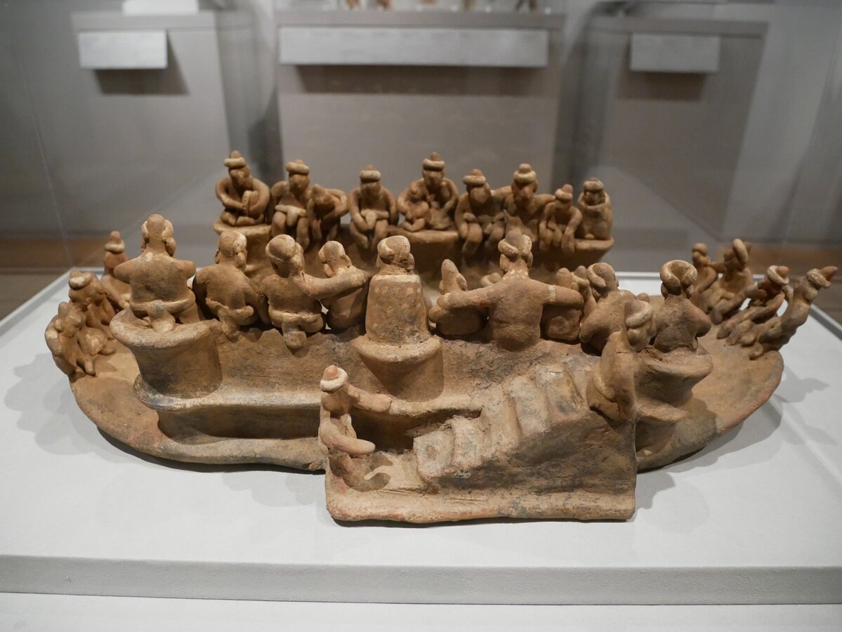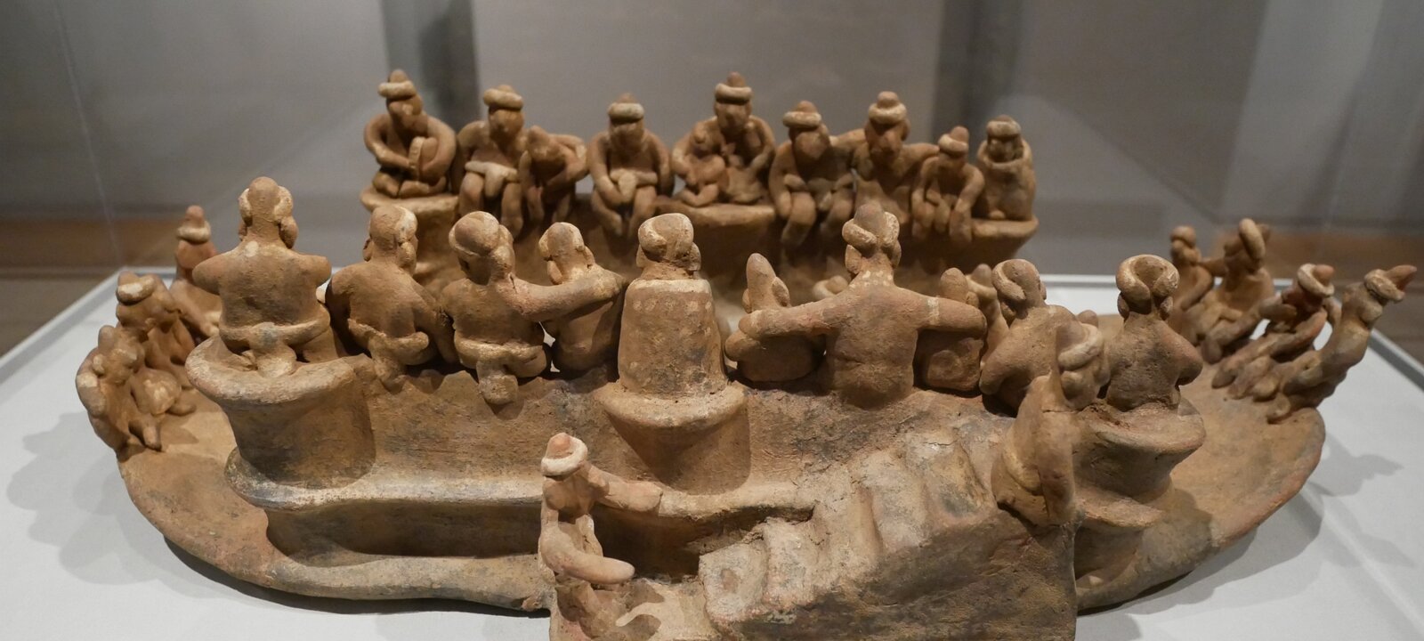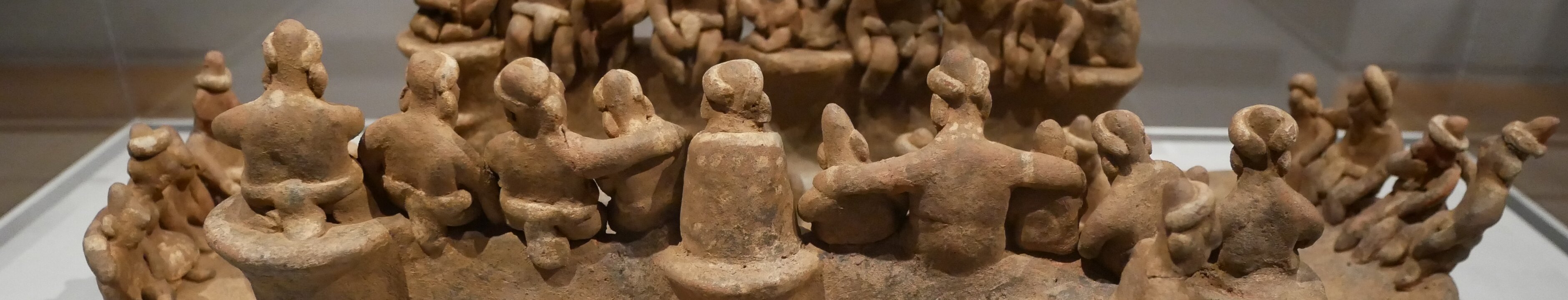 Censer lid with a figure in a bird costume, Mexicp or Guatemala, ceramic with pigment and mica, Teotihuacan, 400-650 AD. Mexico. Model of a ballgame with spectators, Mexico, Nayarit, 100-250 AD. Model of a ballgame with spectators, Mexico, Nayarit, 100-250 AD. Panel with a figure holding a staff and a bag, Mexico, Veracruz, volcanic stone, 500-700 AD. Mexico and Guatemala, before the 9th century AD. Brazier in the shape of a deity with elements of Tlaloc (rain god) and Chicomecoatl (maize goddess), Mexico, Aztec, 1325-1521 AD. Central Andes, Moche and Nasca, 100-700 AD. Beakers, Central Andes, Lambayeque, 1100-1350 AD. Ritual objects made of a single sheet of gold. Crown, Central Andes, Lambayeque, gold, 1100-1350 AD. Dura-EuroposPaintings Labels
