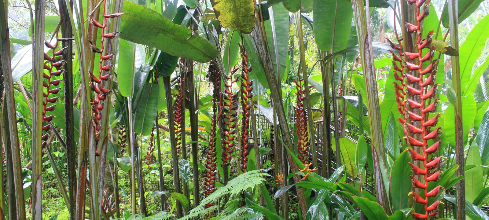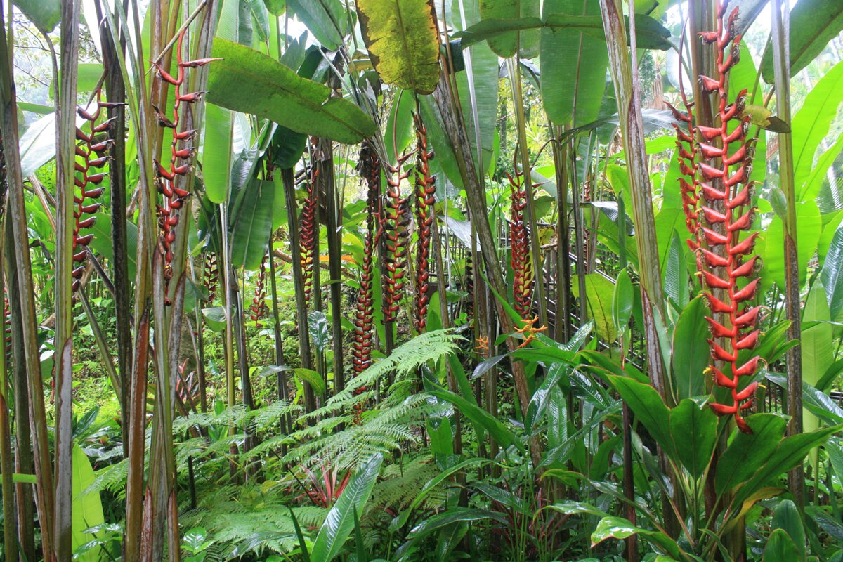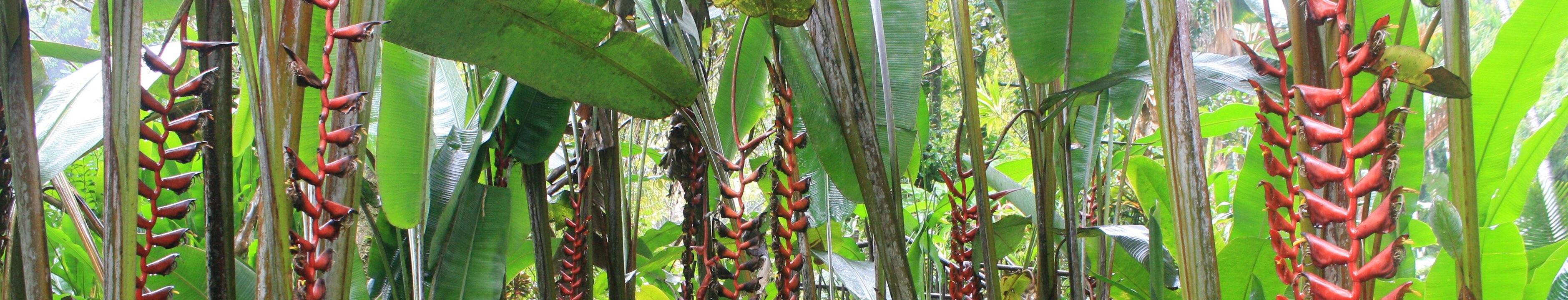 Alexandra palm, Australia. Heliconia "Eden Pink", Colombia, Ecuador, Peru. Pink maracas. Common guava, central America. Akaka FallsHonomu Labels