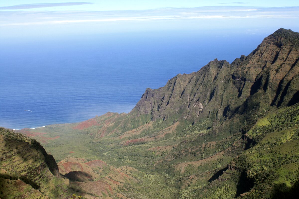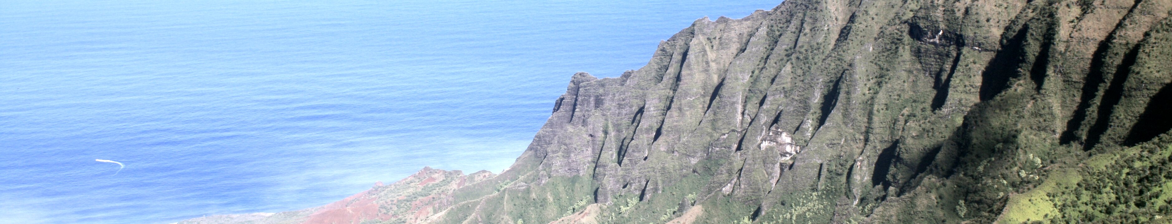 Kalalau valley, along the Na Pali coast. Fluted ridges are made by water running down the slopes during heavy rains and cutting through the softer basalt…