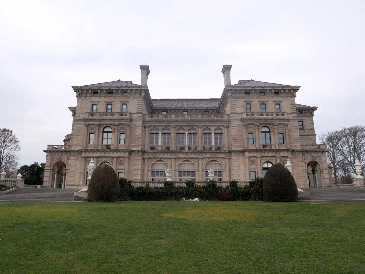 The Breakers, built by Richard Morris Hunt for Cornelius Vanderbilt II in 1893. 70 rooms, 5800 sqm living area, estate: 5.7 ha. Side. Rear. Fountain modeled after the entrance of Opera Garnier in Paris. Breakfast room. RosecliffThe Elms Labels