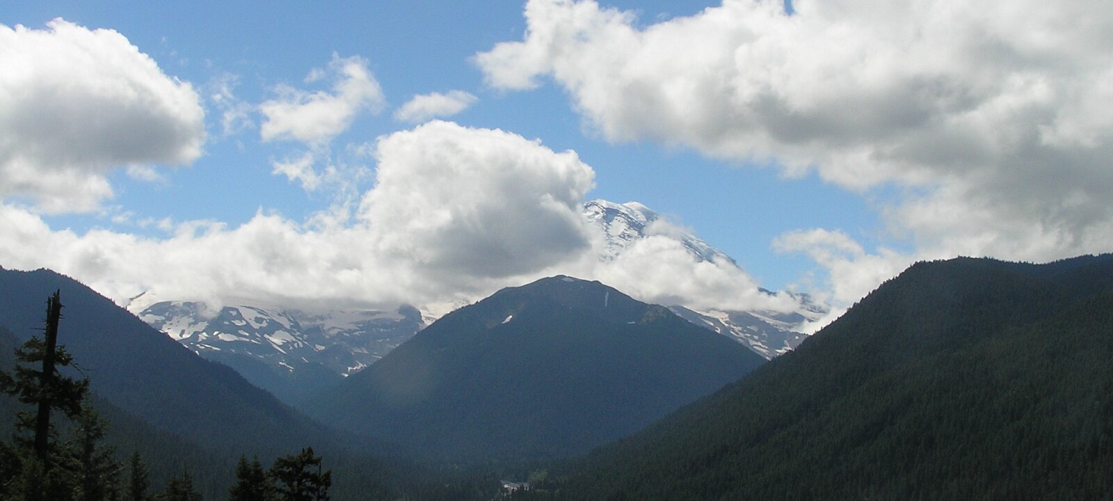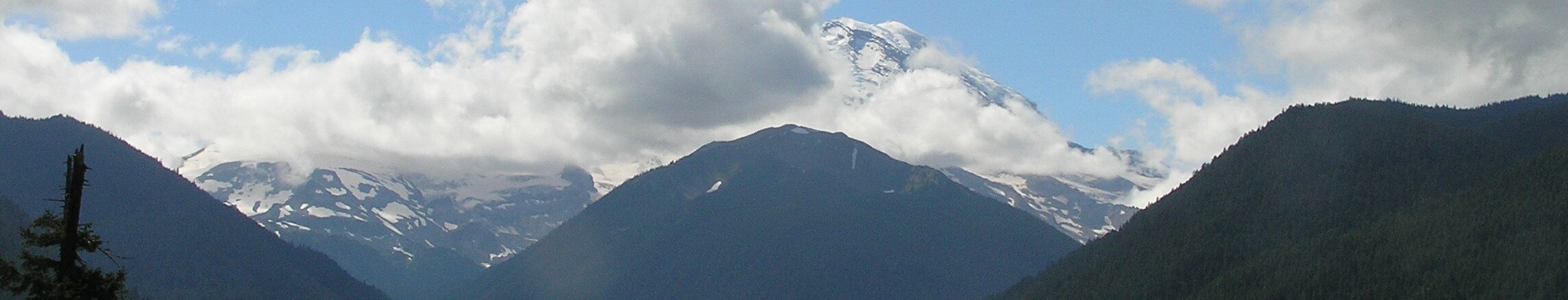 The national park culminates with Mount Rainier, 4392m. It also comprehends many streams and glaciers, and rain forests. Mount Rainier is often hidden behind clouds. The area is also subject to large amounts of precipitations. Visitor center and hotel. A narrow but deep canyon. Mount BakerOlympic Peninsula Labels
