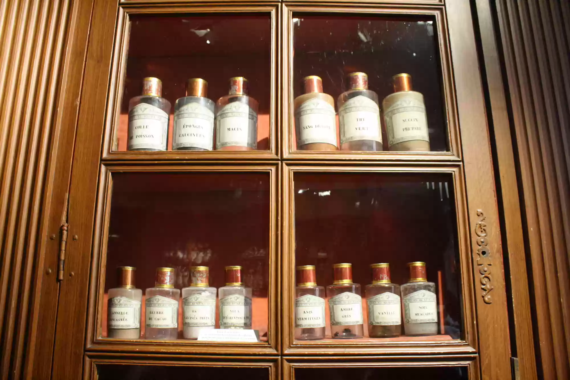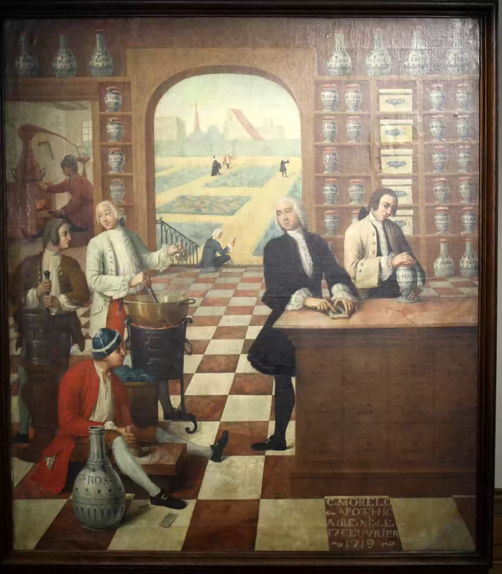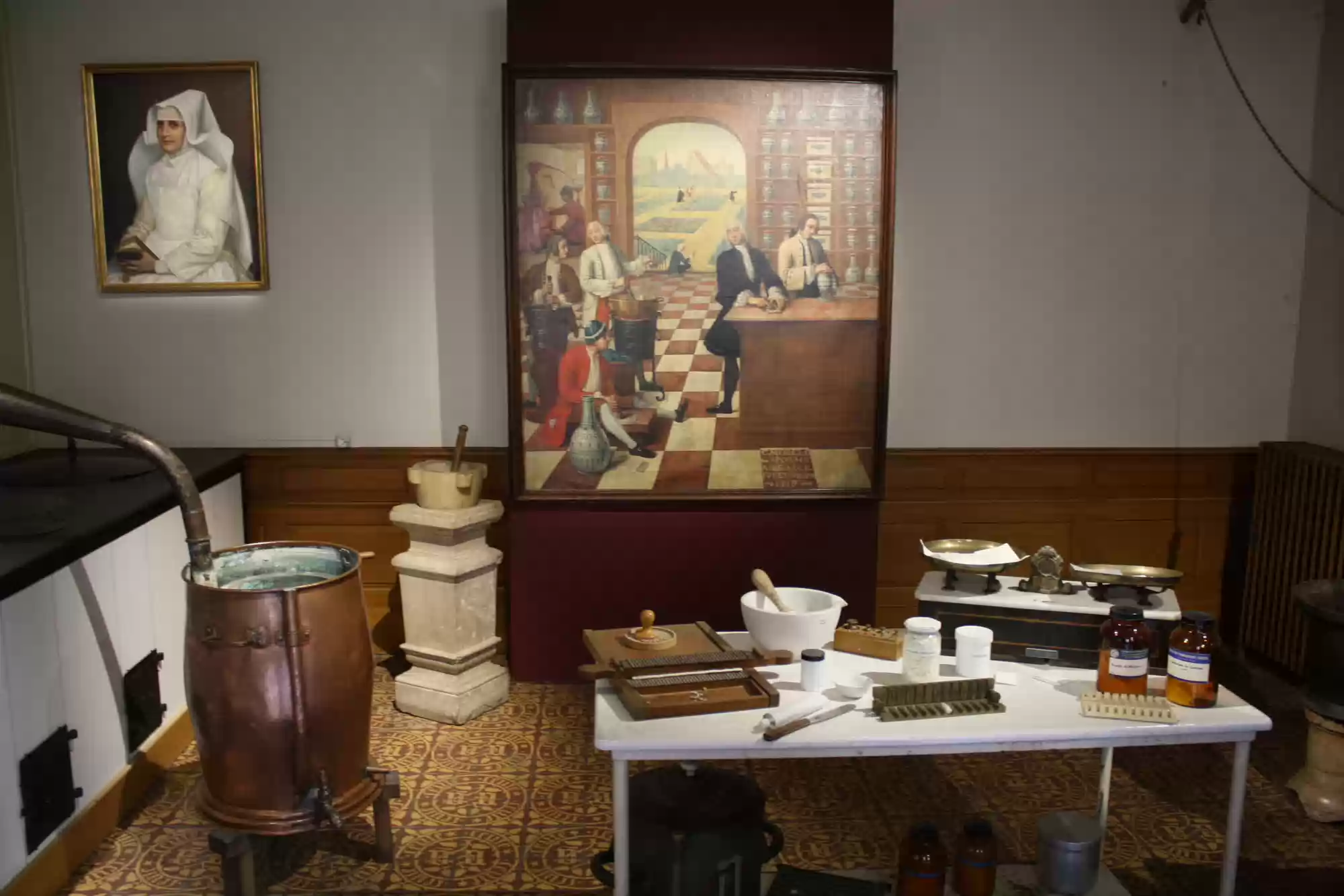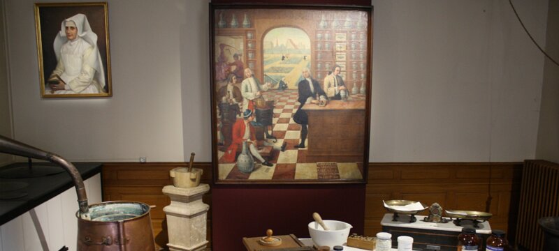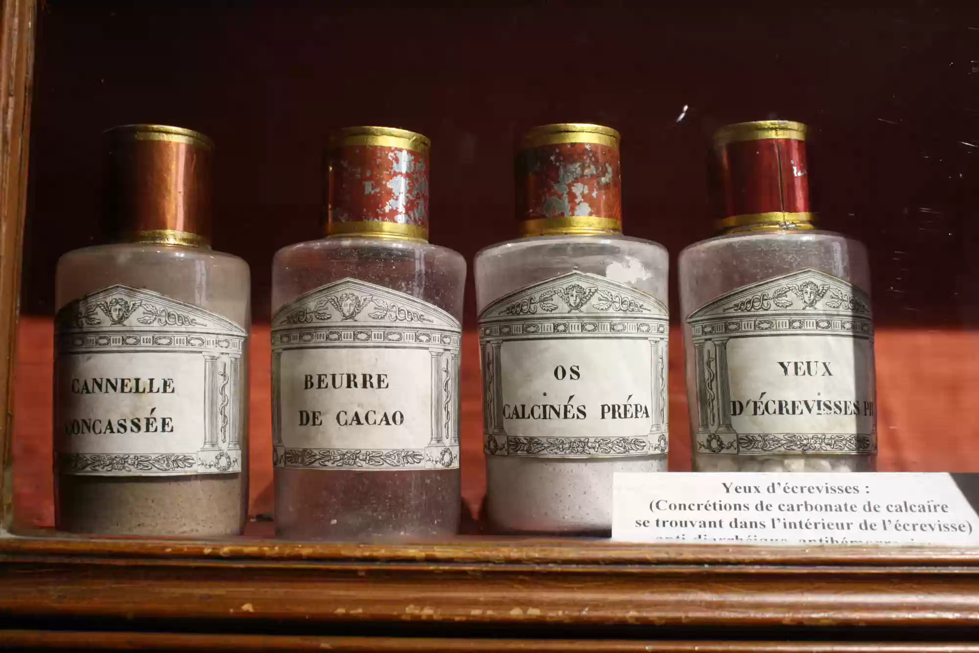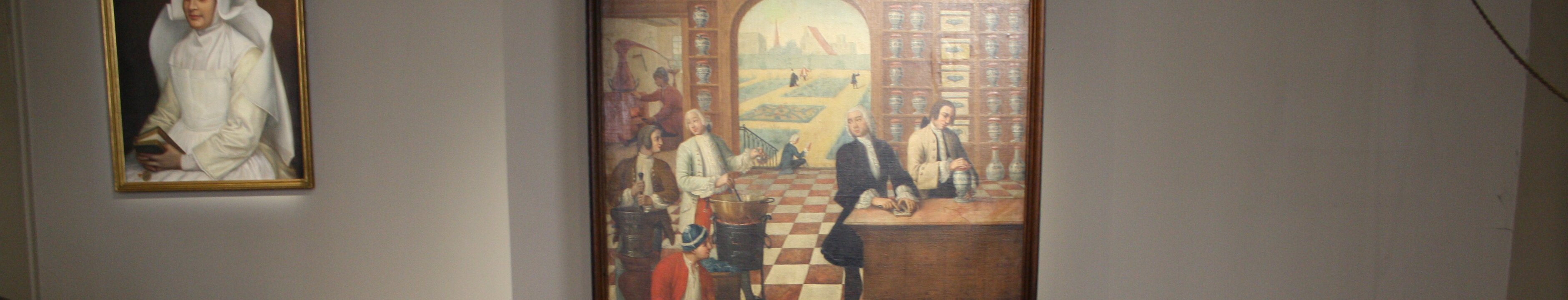 A pharmacy has existed in the Hotel-Dieu since at least 1501; it was enlarged several times. The wood panels were made in 1787. Claude Morelot, in charge of the pharmacy until his death in 1776, depicted by Michel Charles Coquelet Souville in 1751. Pierrette Monnet (1557-1628) was in charge of the pharmacy (top left). 18th century containers. 18th century containers. 18th century containers. 18th century containers. 18th century container. 18th century container. Medications: cinnamon, cocoa butter, calcinated bones, lobster eyes (pieces of limestone naturally found within lobsters). KitchenSaint Louis room Labels