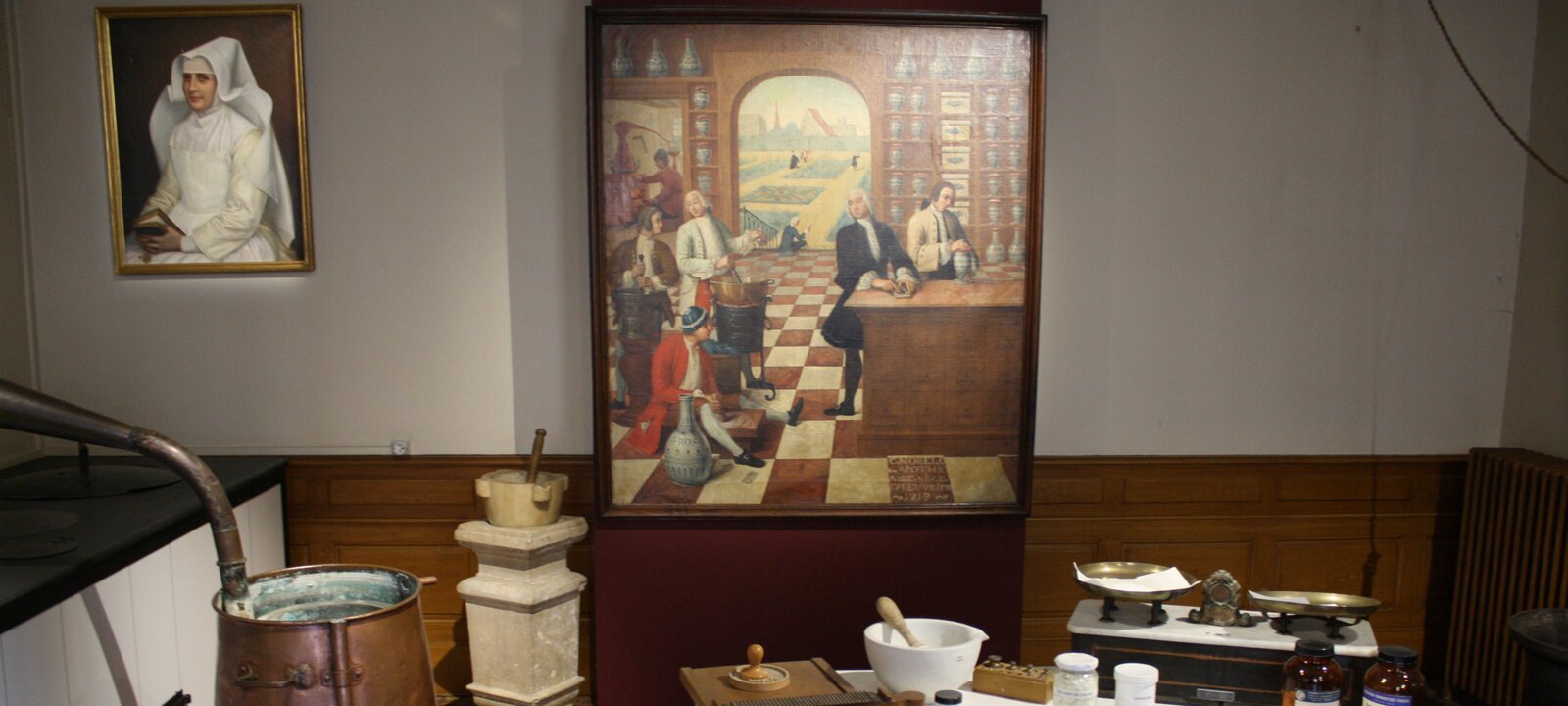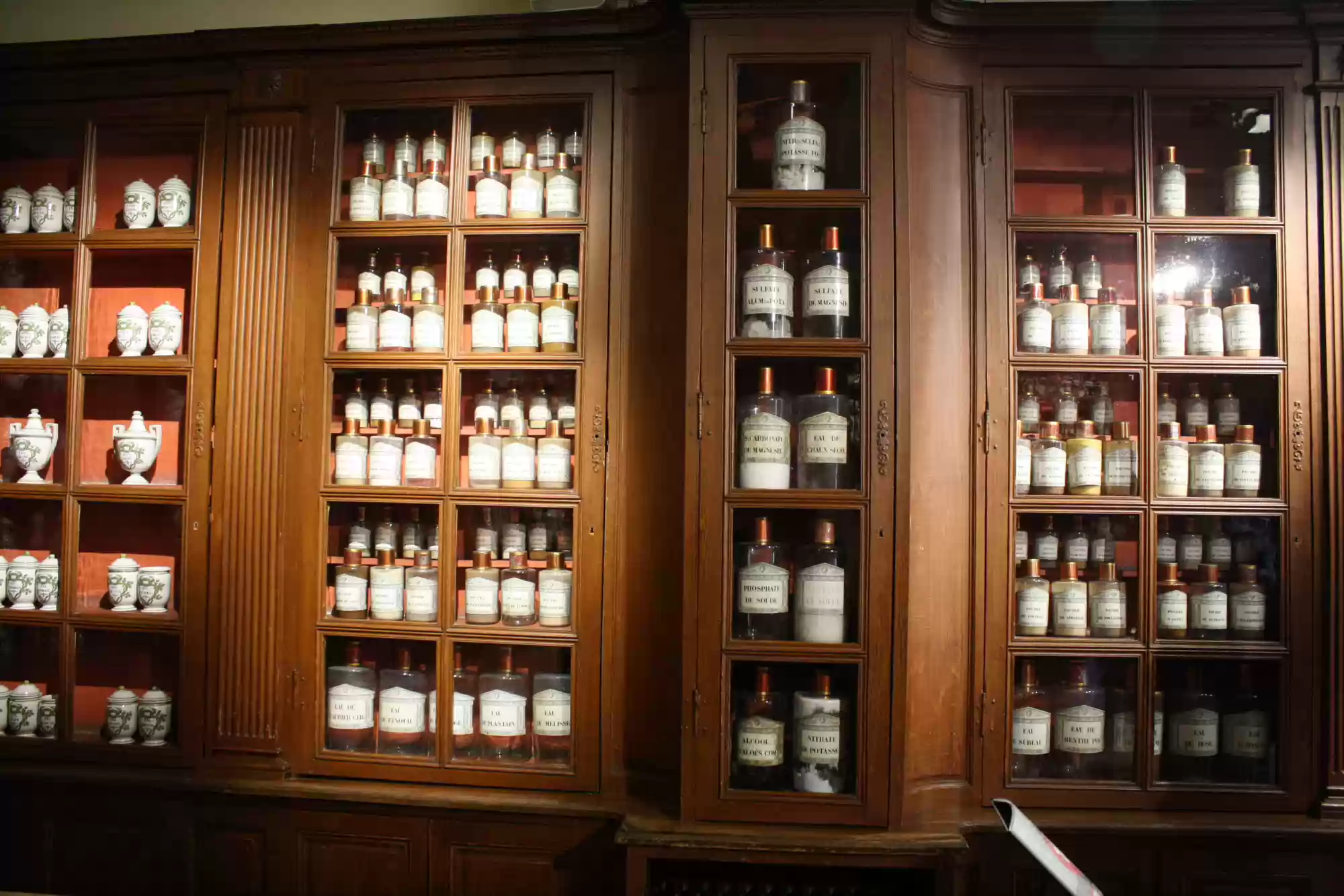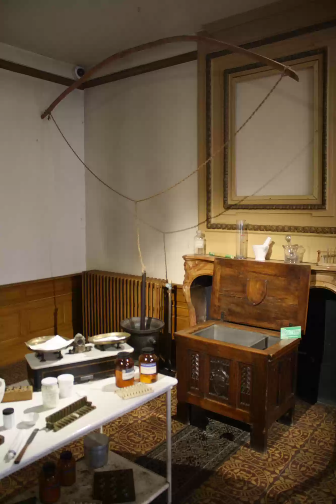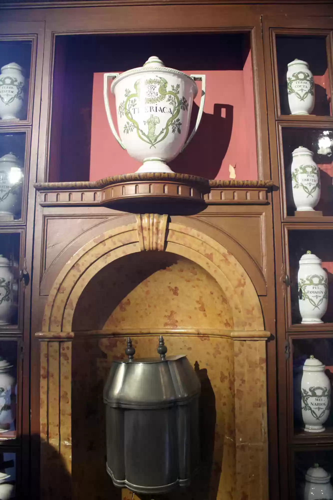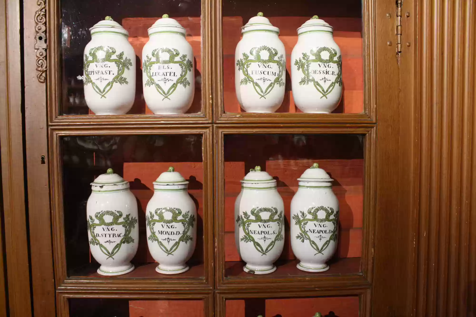 A pharmacy has existed in the Hotel-Dieu since at least 1501; it was enlarged several times. The wood panels were made in 1787. Claude Morelot, in charge of the pharmacy until his death in 1776, depicted by Michel Charles Coquelet Souville in 1751. Pierrette Monnet (1557-1628) was in charge of the pharmacy (top left). 18th century containers. 18th century containers. 18th century containers. 18th century containers. 18th century container. 18th century container. Medications: cinnamon, cocoa butter, calcinated bones, lobster eyes (pieces of limestone naturally found within lobsters). KitchenSaint Louis room Labels