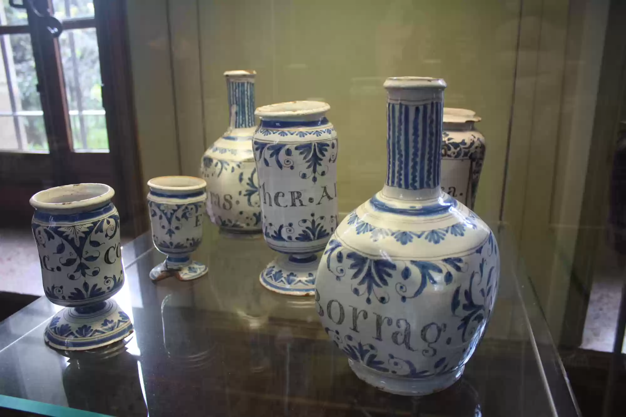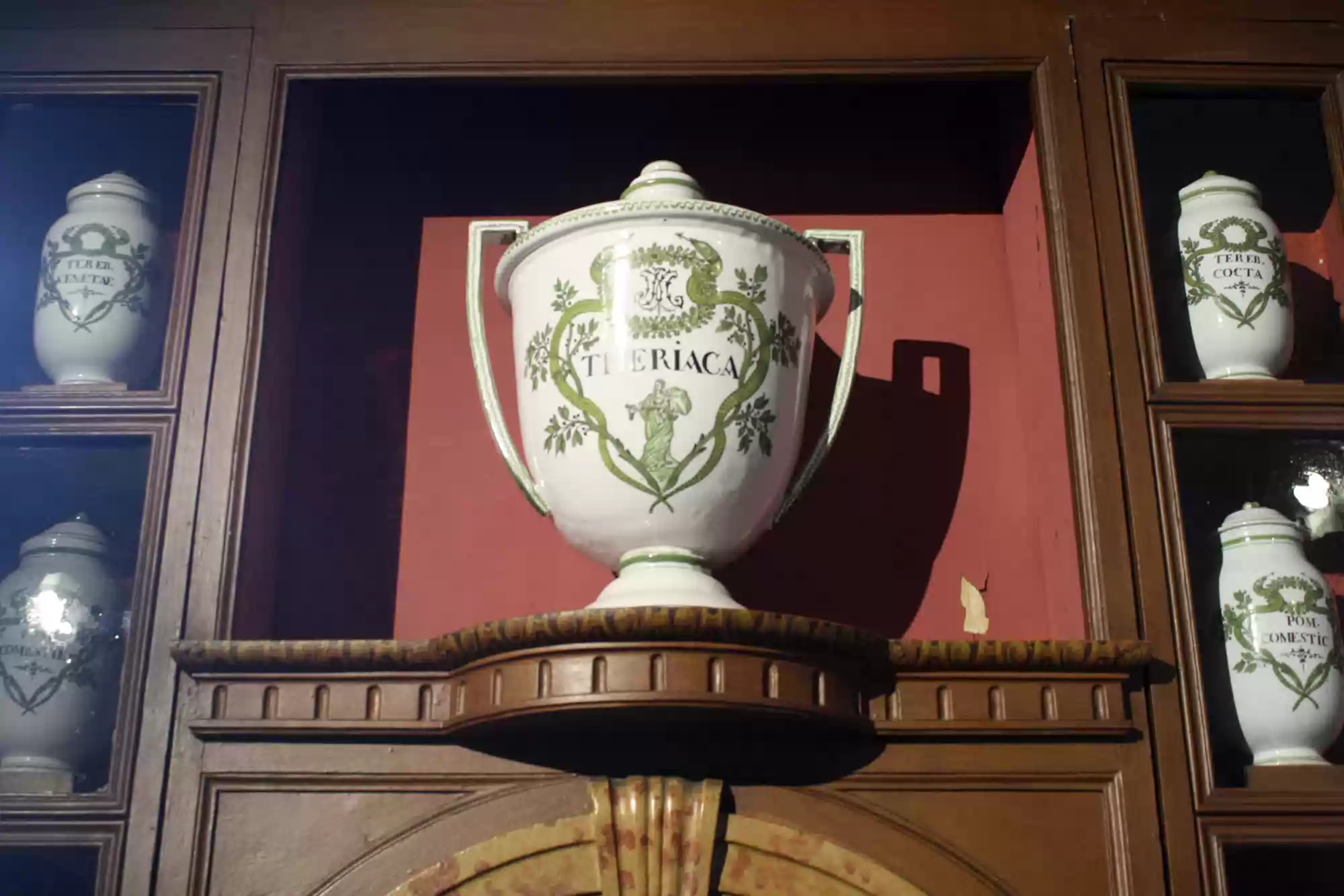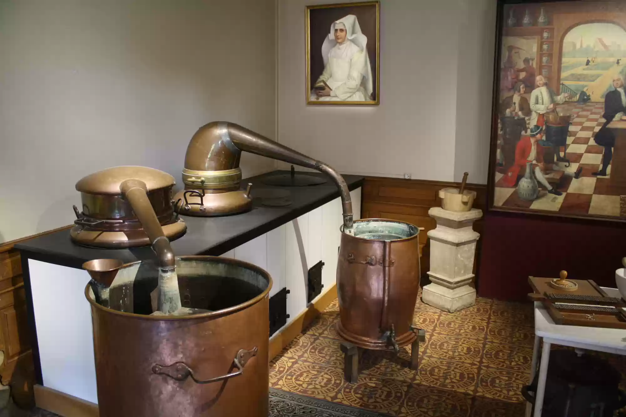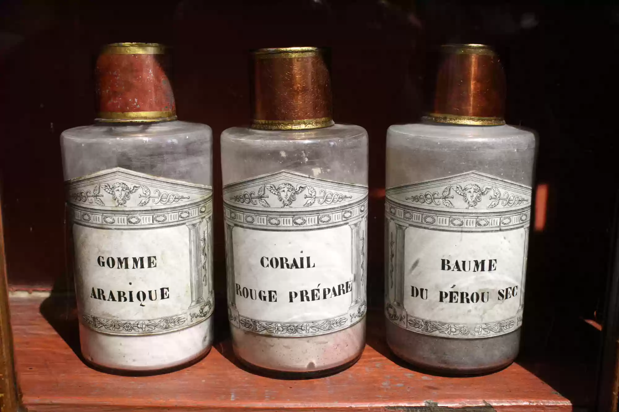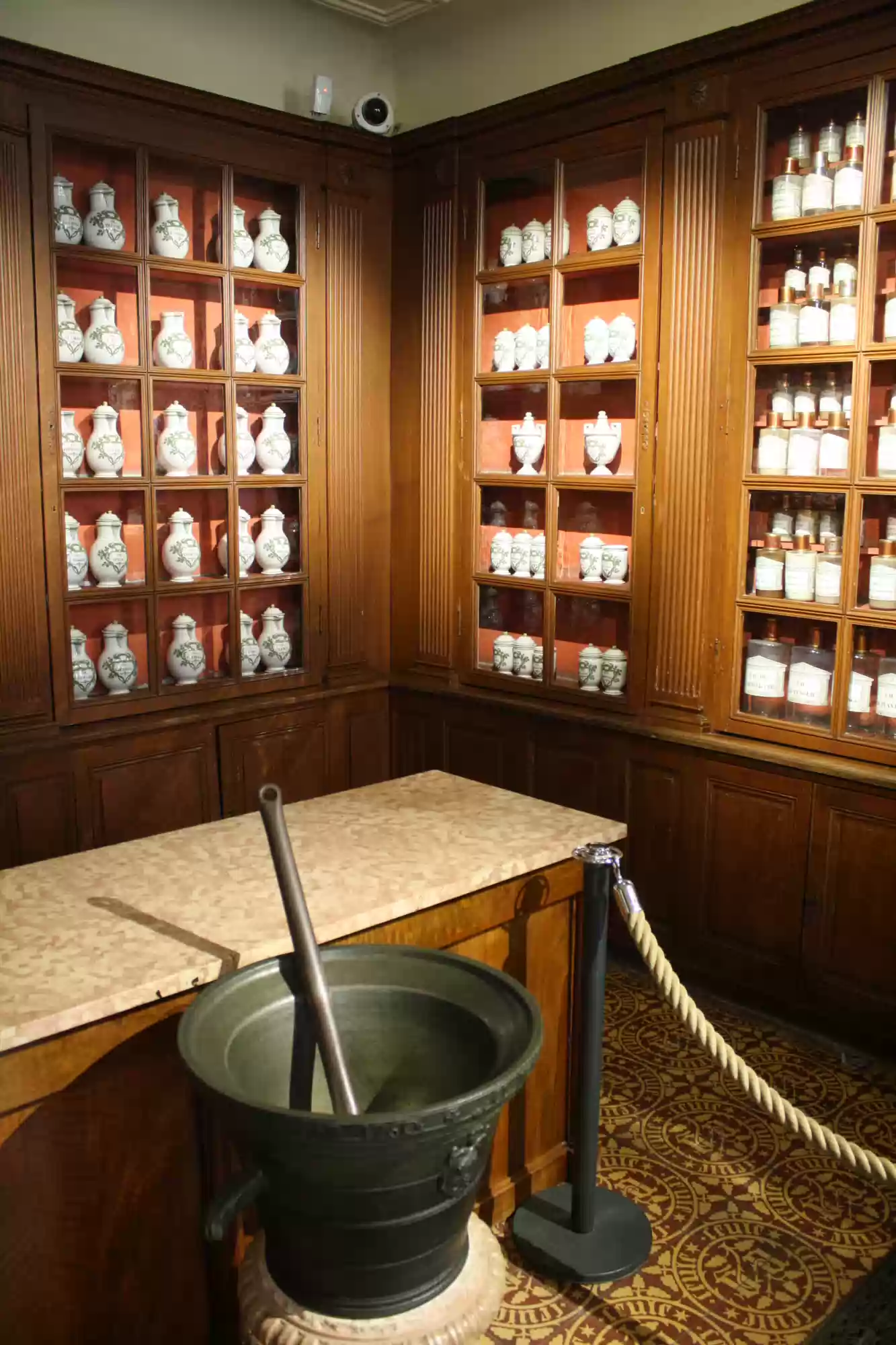 A pharmacy has existed in the Hotel-Dieu since at least 1501; it was enlarged several times. The wood panels were made in 1787. Claude Morelot, in charge of the pharmacy until his death in 1776, depicted by Michel Charles Coquelet Souville in 1751. Pierrette Monnet (1557-1628) was in charge of the pharmacy (top left). 18th century containers. 18th century containers. 18th century containers. 18th century containers. 18th century container. 18th century container. Medications: cinnamon, cocoa butter, calcinated bones, lobster eyes (pieces of limestone naturally found within lobsters). KitchenSaint Louis room Labels