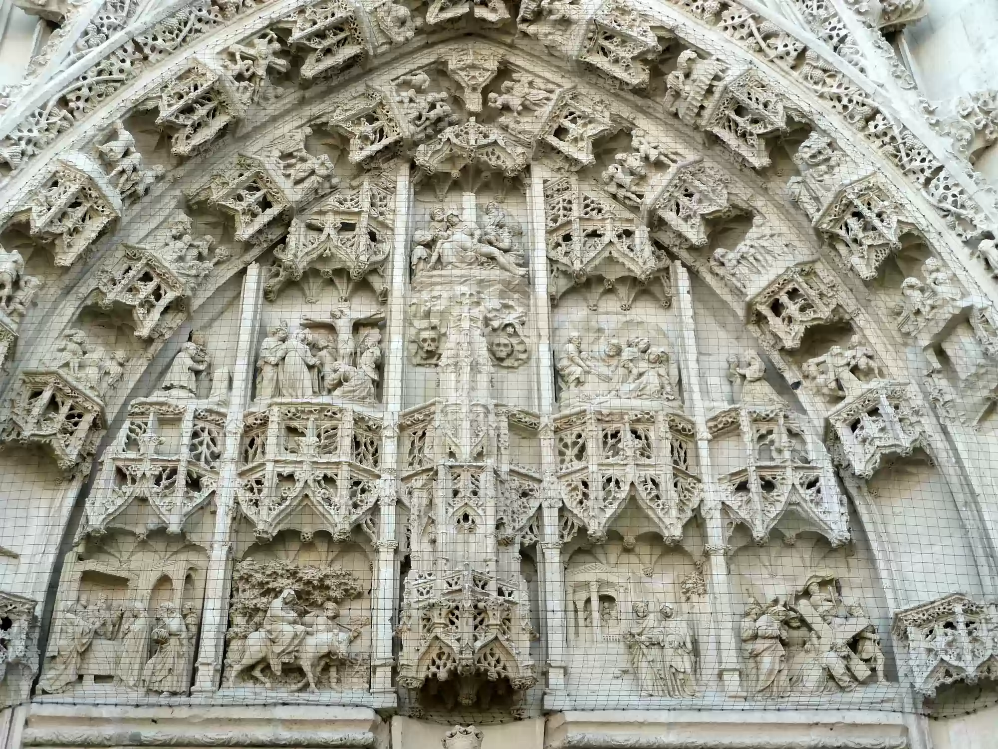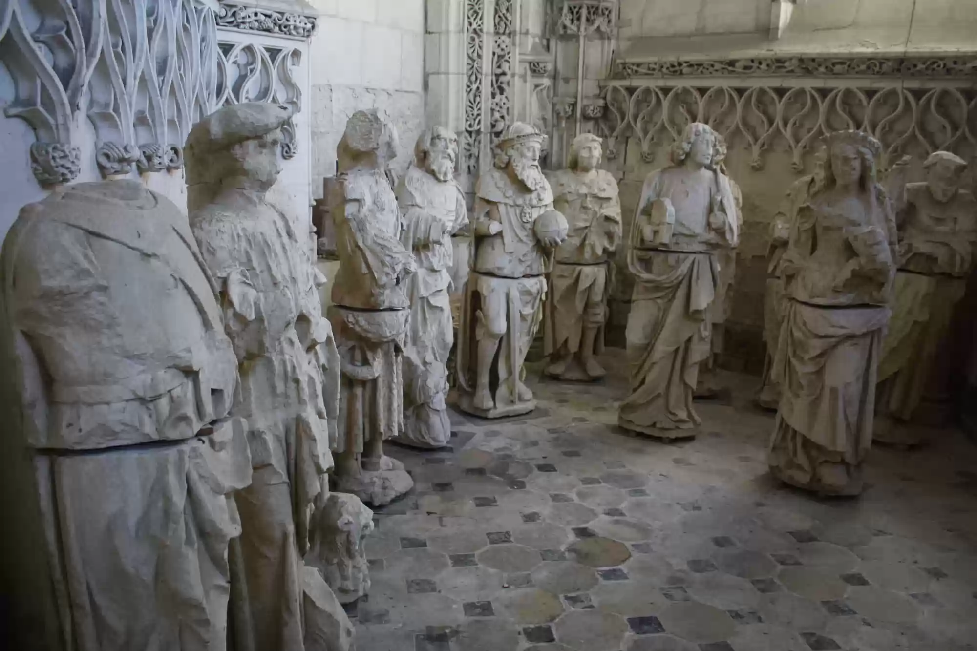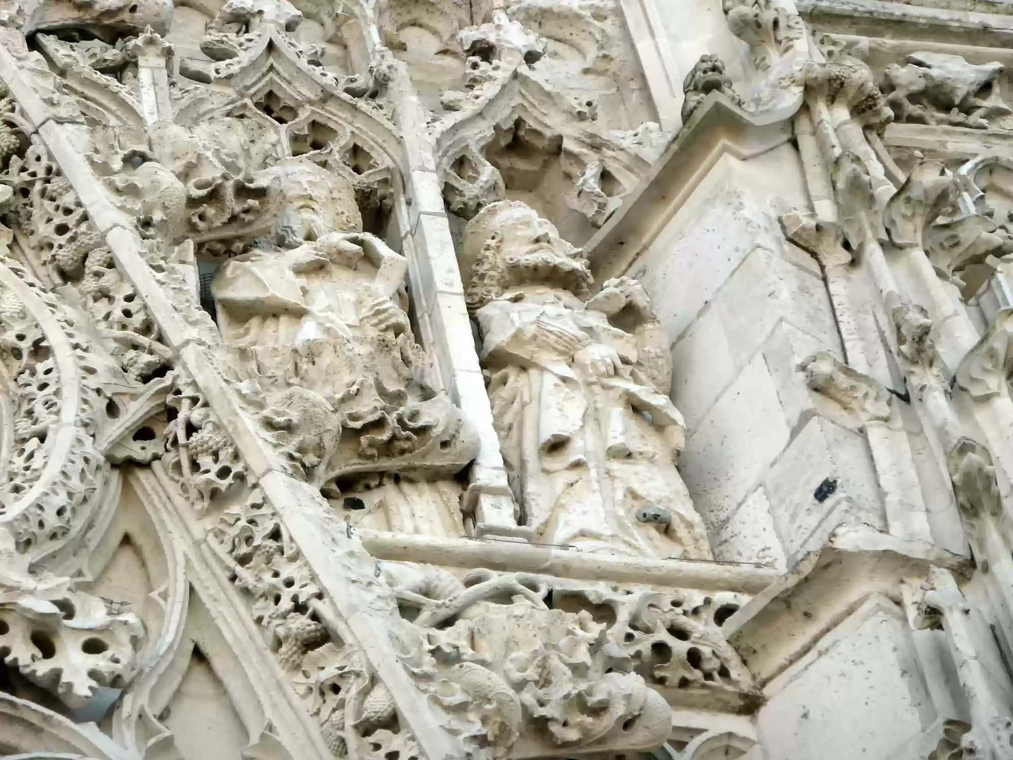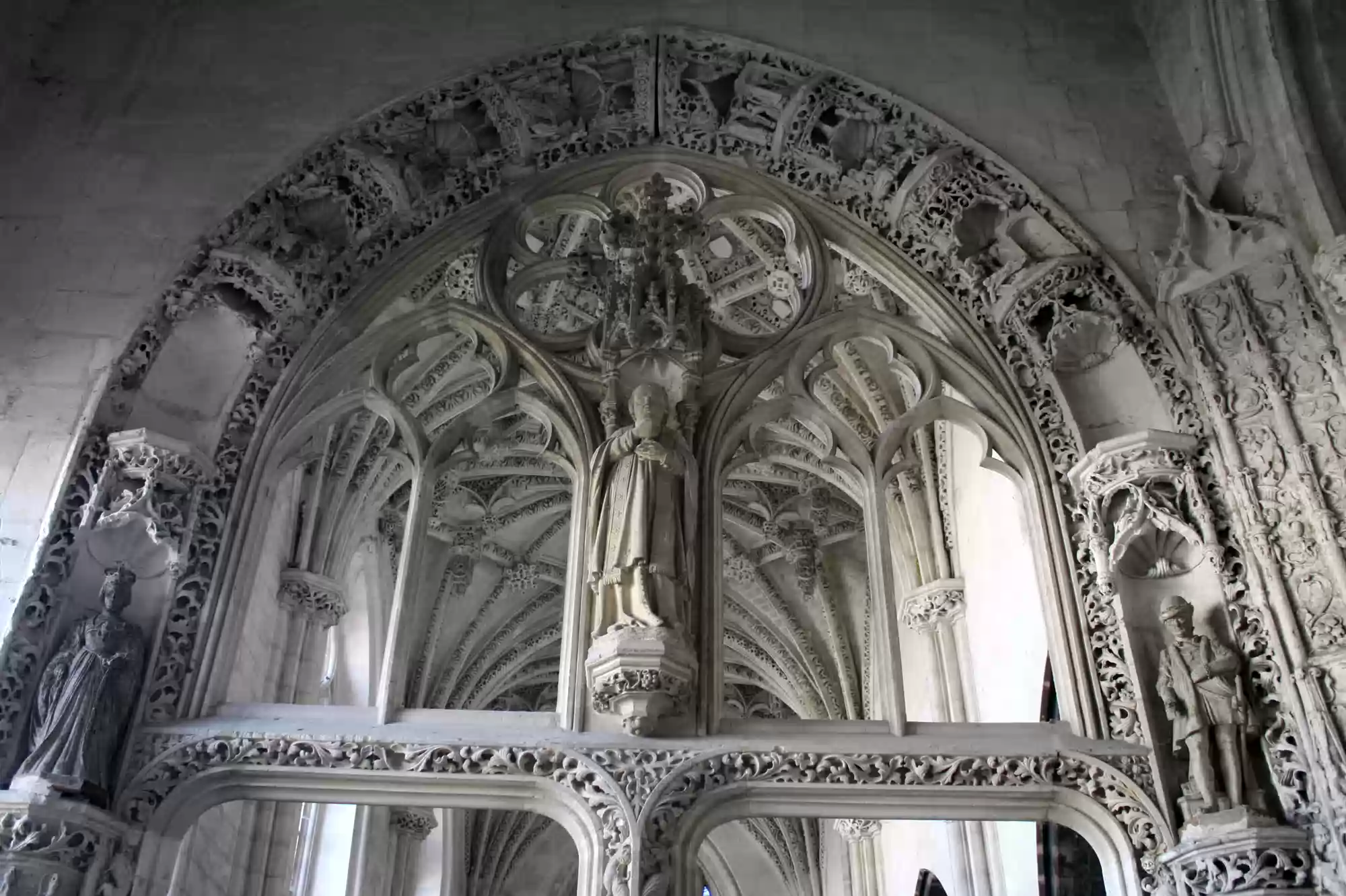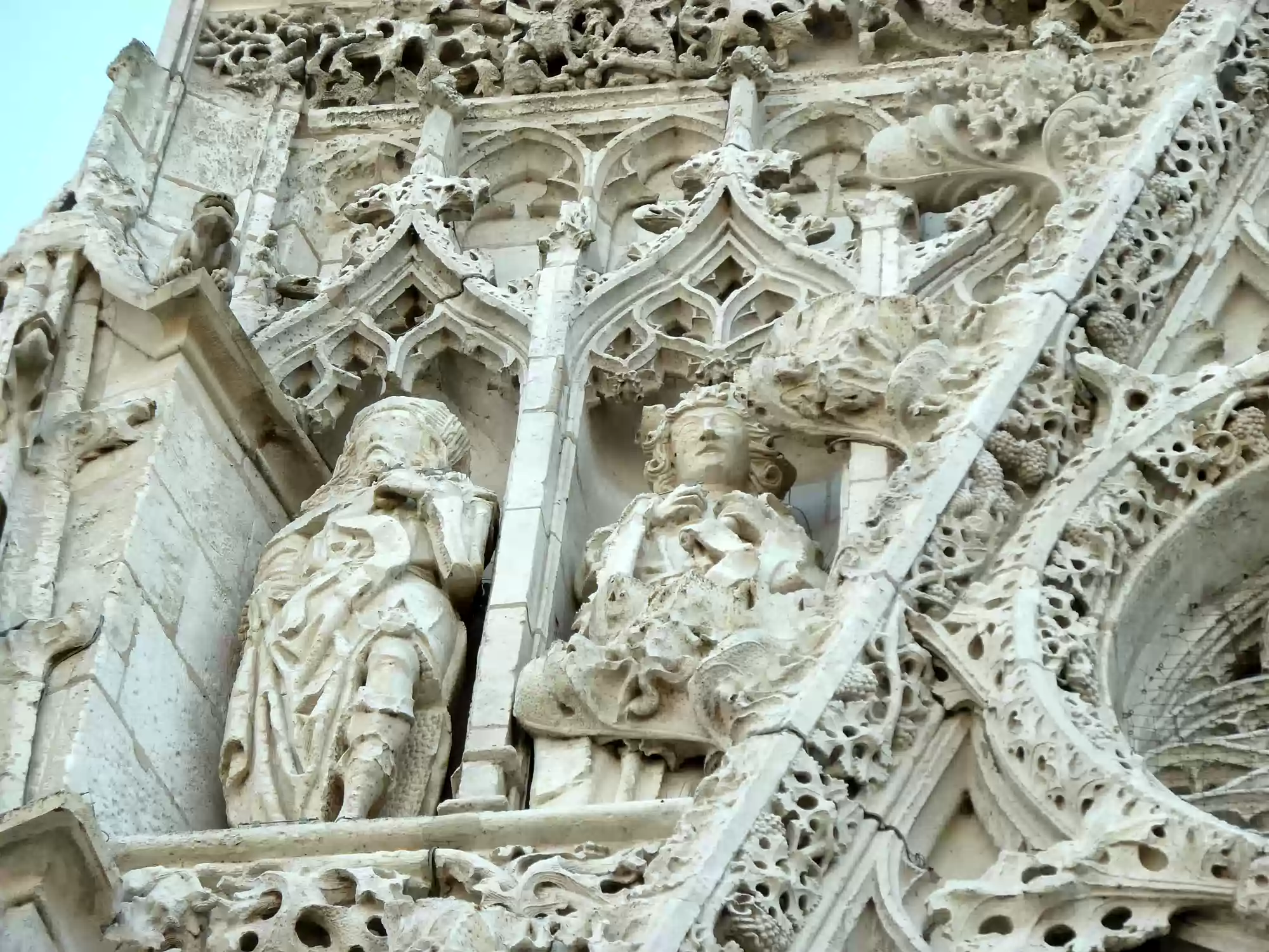 Chapel of the Holy Spirit, 1440-1515. Flamboyant gothic style. Blblic and royal statues. King Charlemagne is holding a sphere. Mary and child are visible on the right side. Belfry Labels