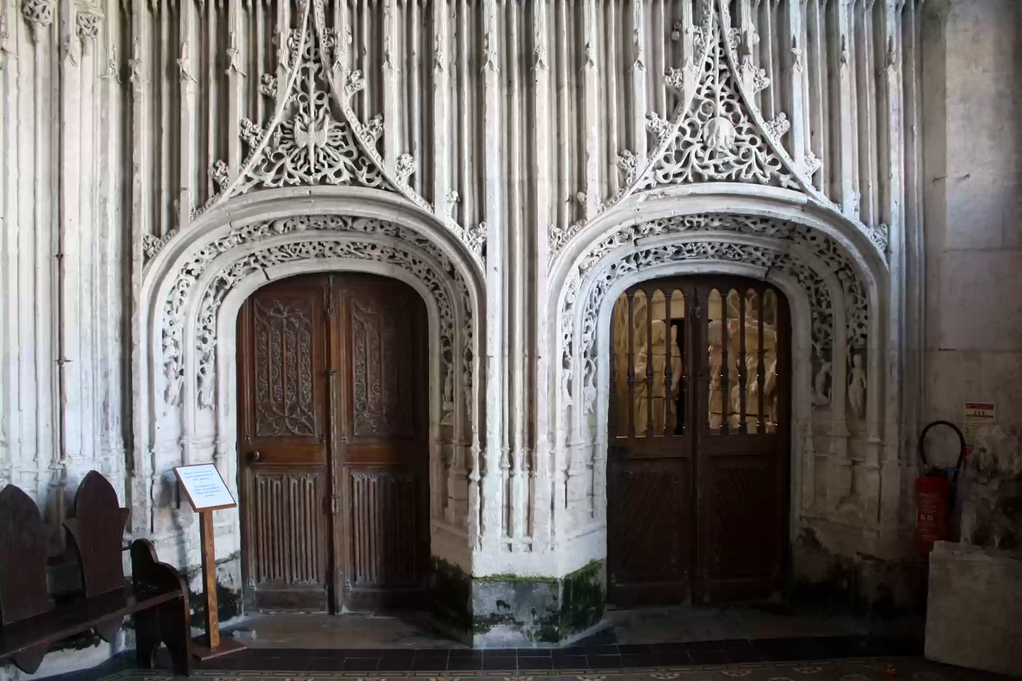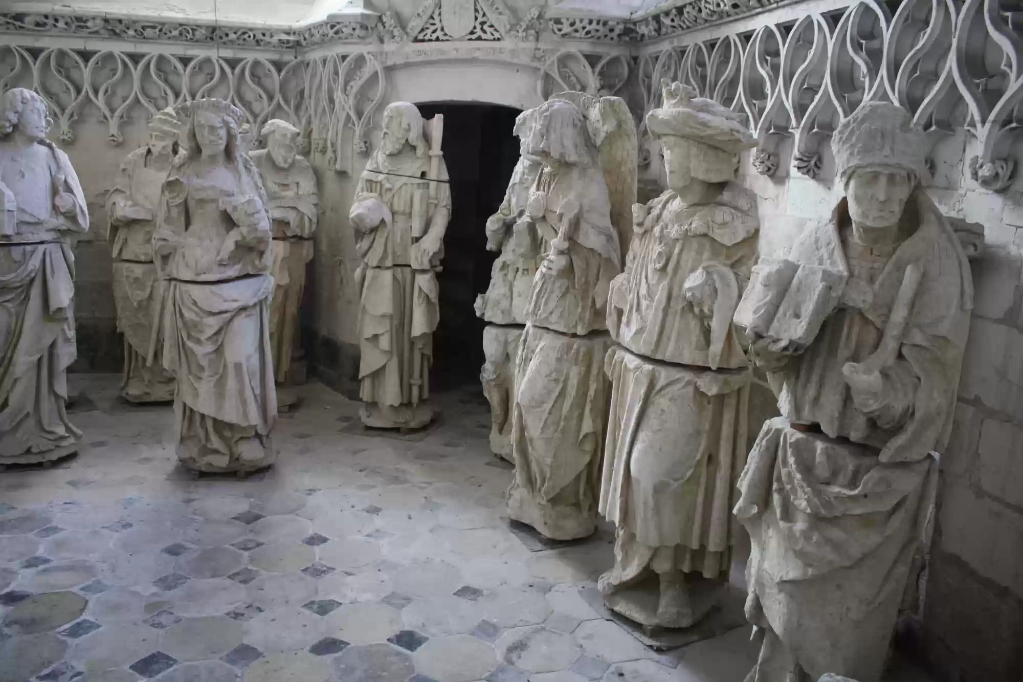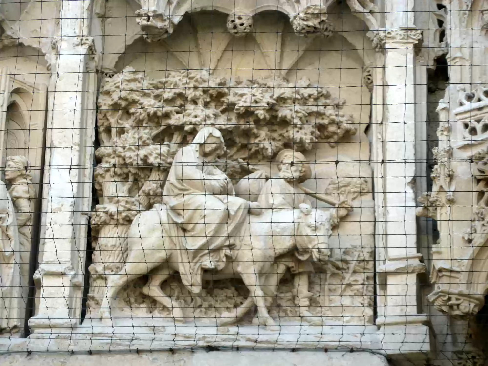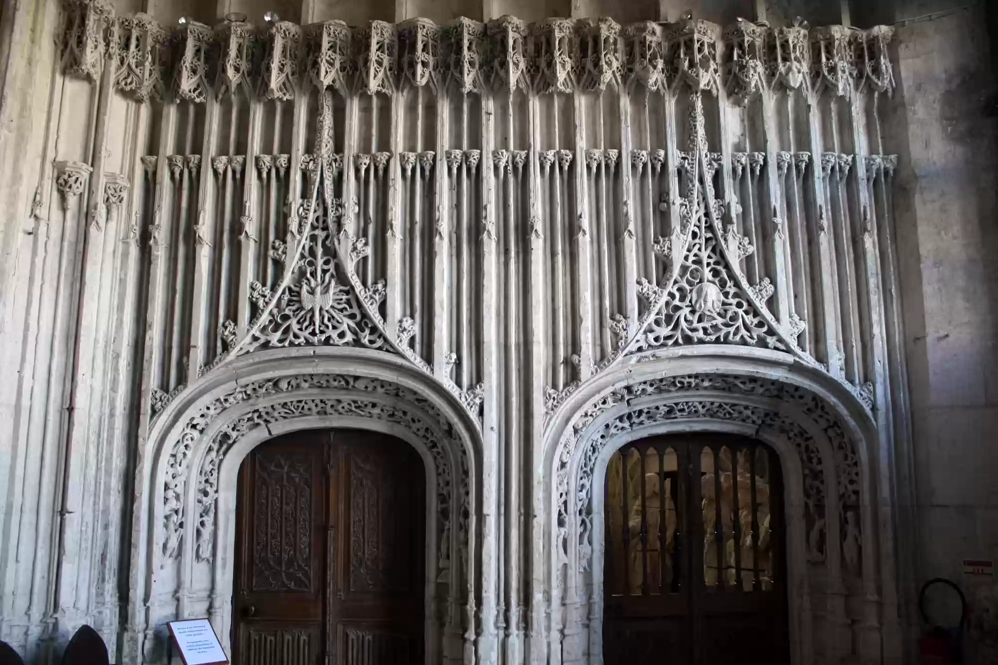 Chapel of the Holy Spirit, 1440-1515. Flamboyant gothic style. Blblic and royal statues. King Charlemagne is holding a sphere. Mary and child are visible on the right side. Belfry Labels