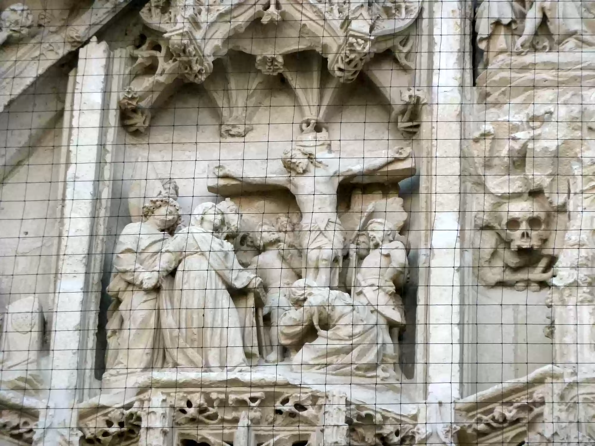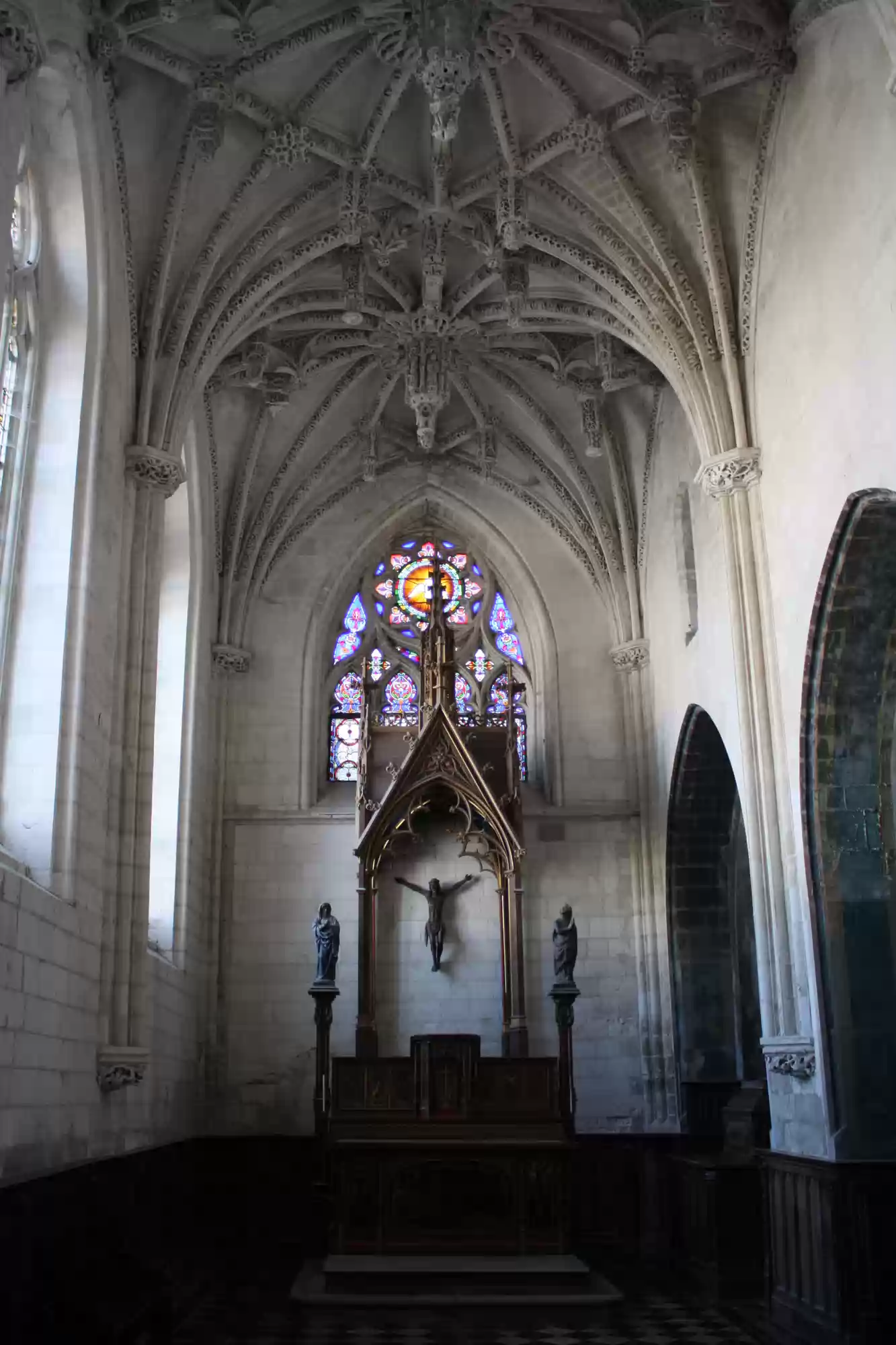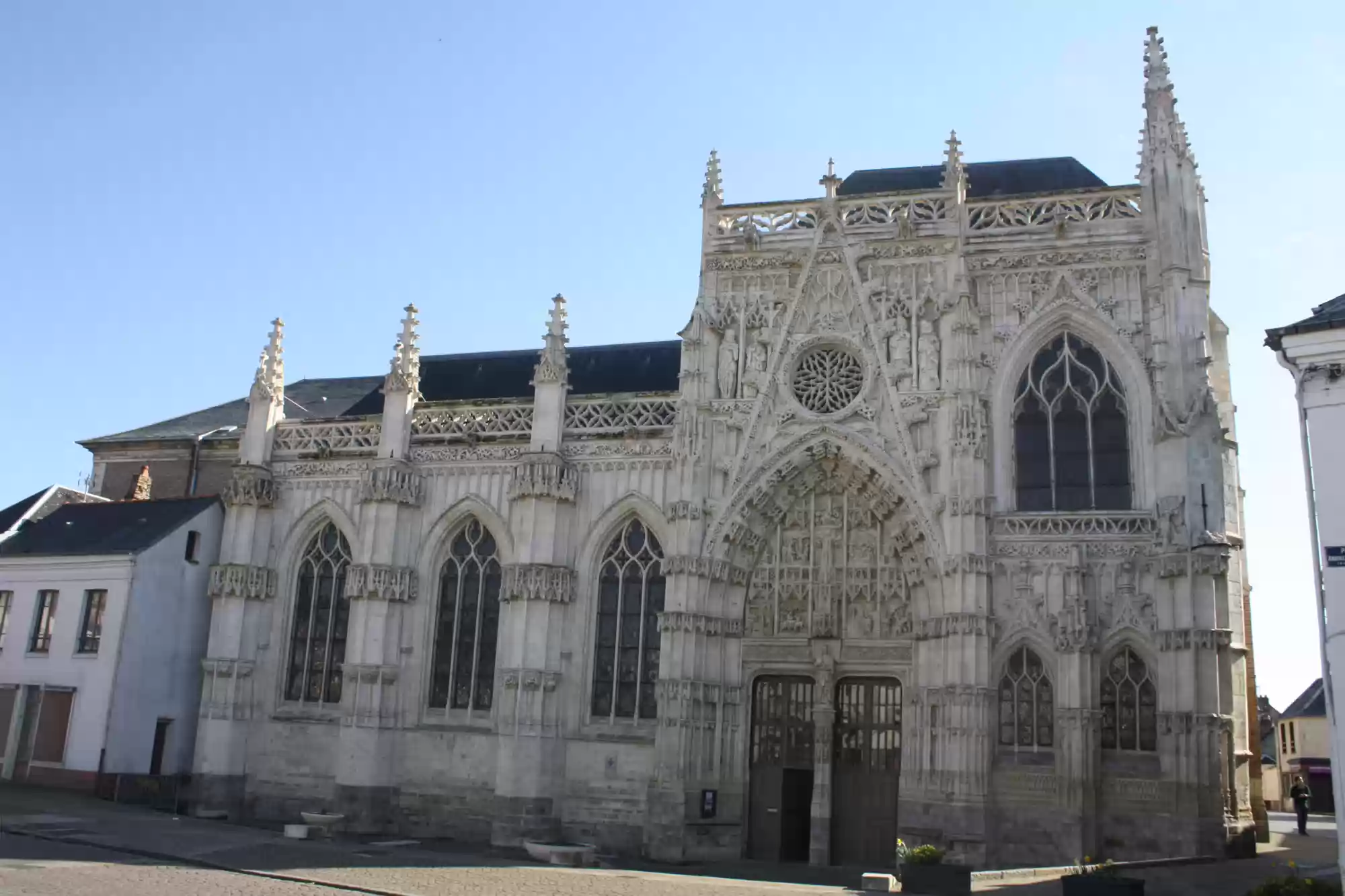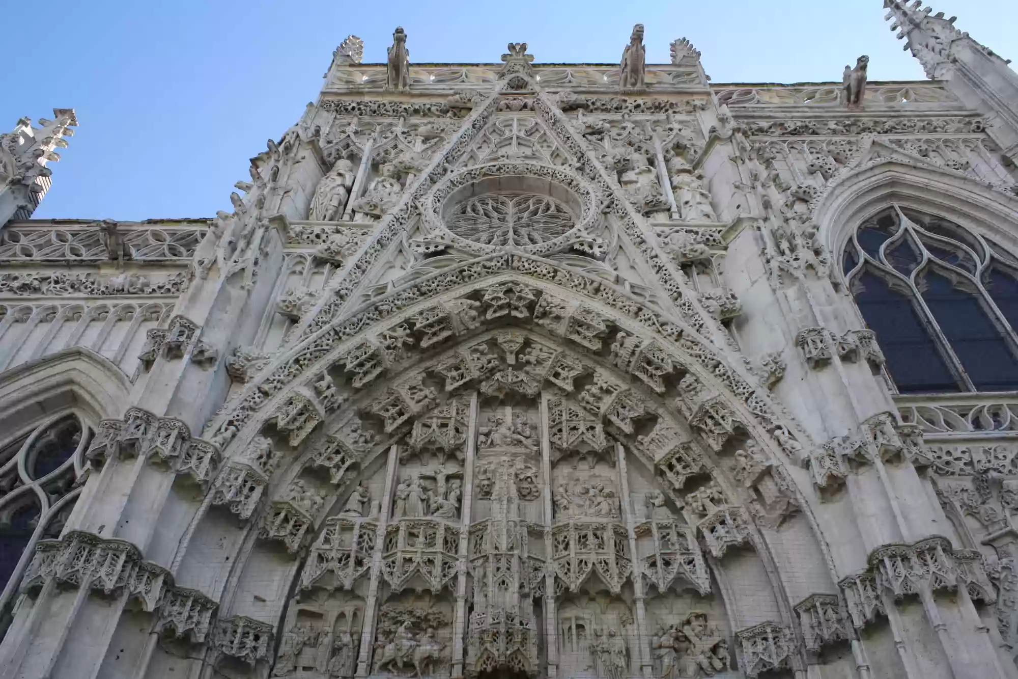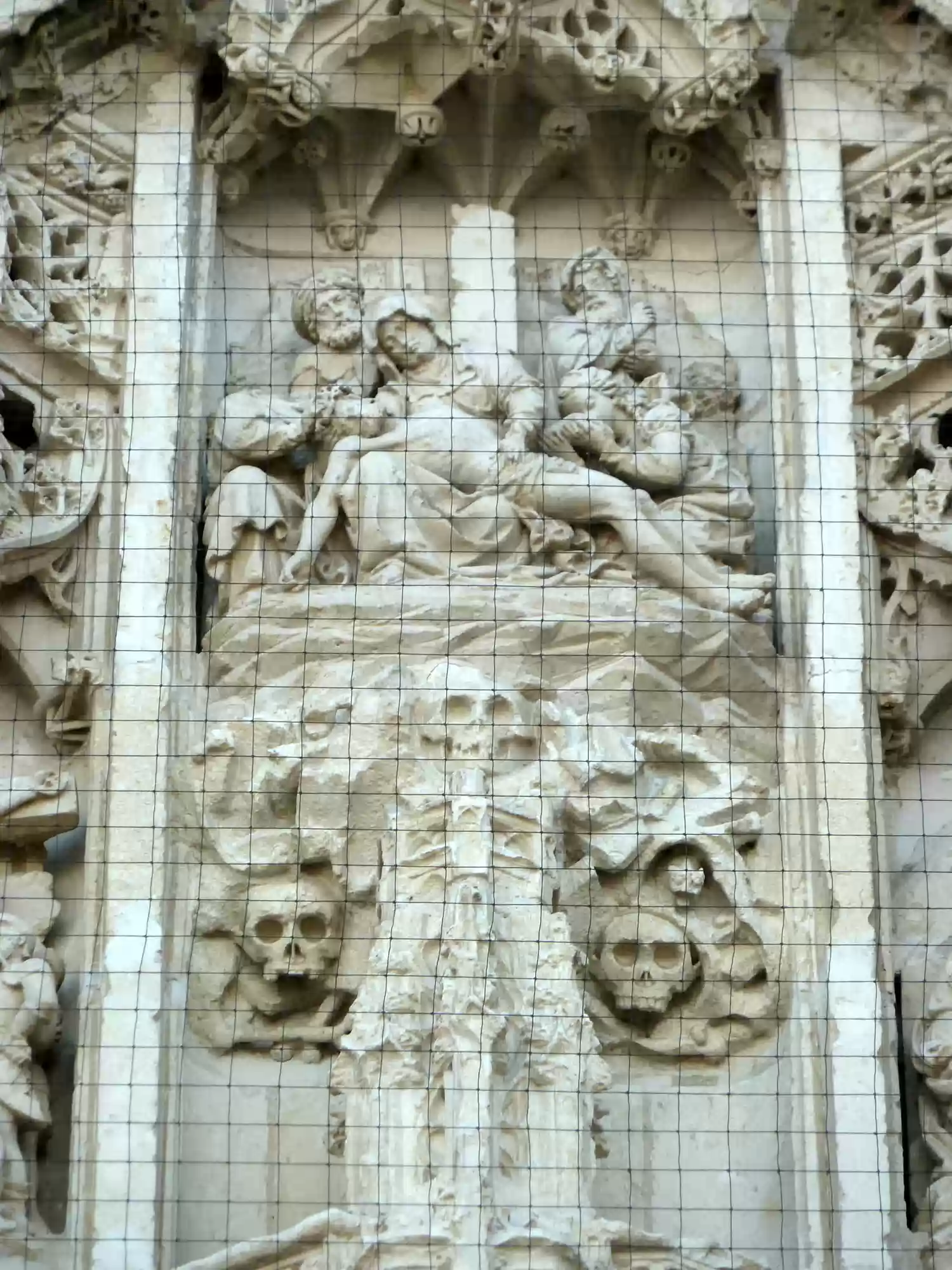 Chapel of the Holy Spirit, 1440-1515. Flamboyant gothic style. Blblic and royal statues. King Charlemagne is holding a sphere. Mary and child are visible on the right side. Belfry Labels