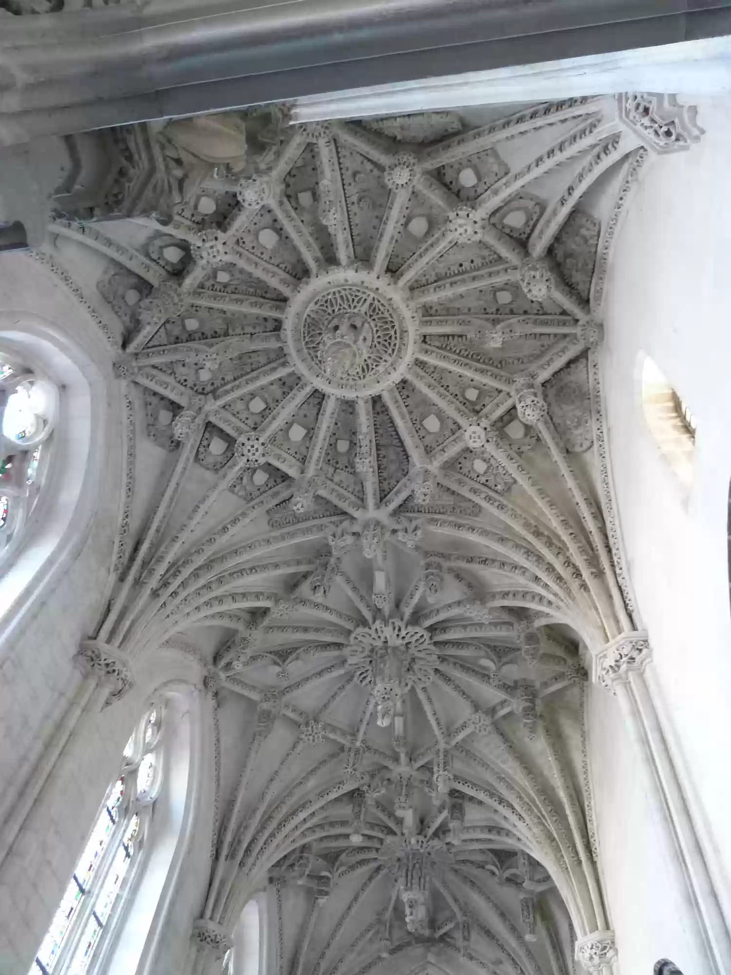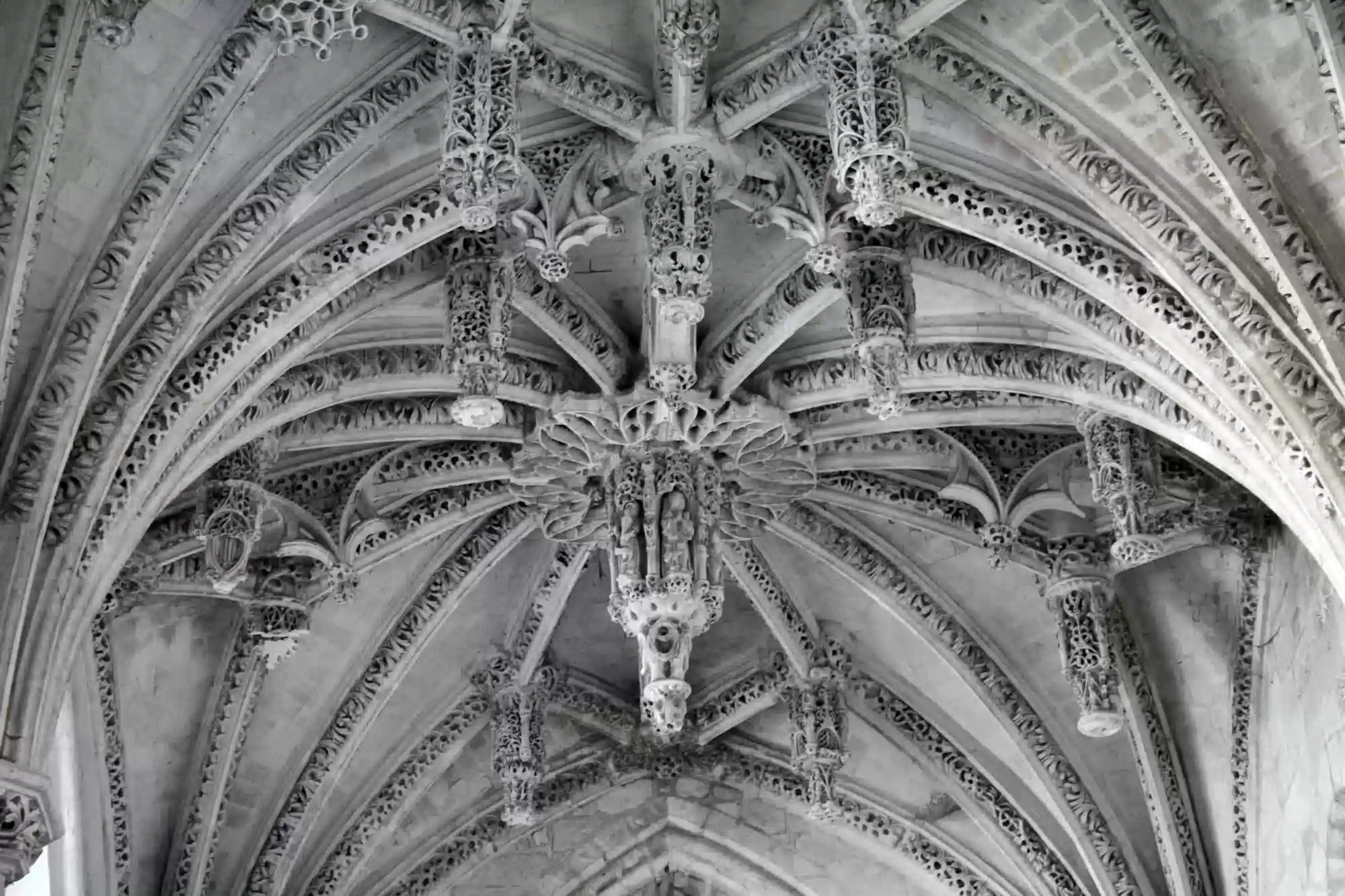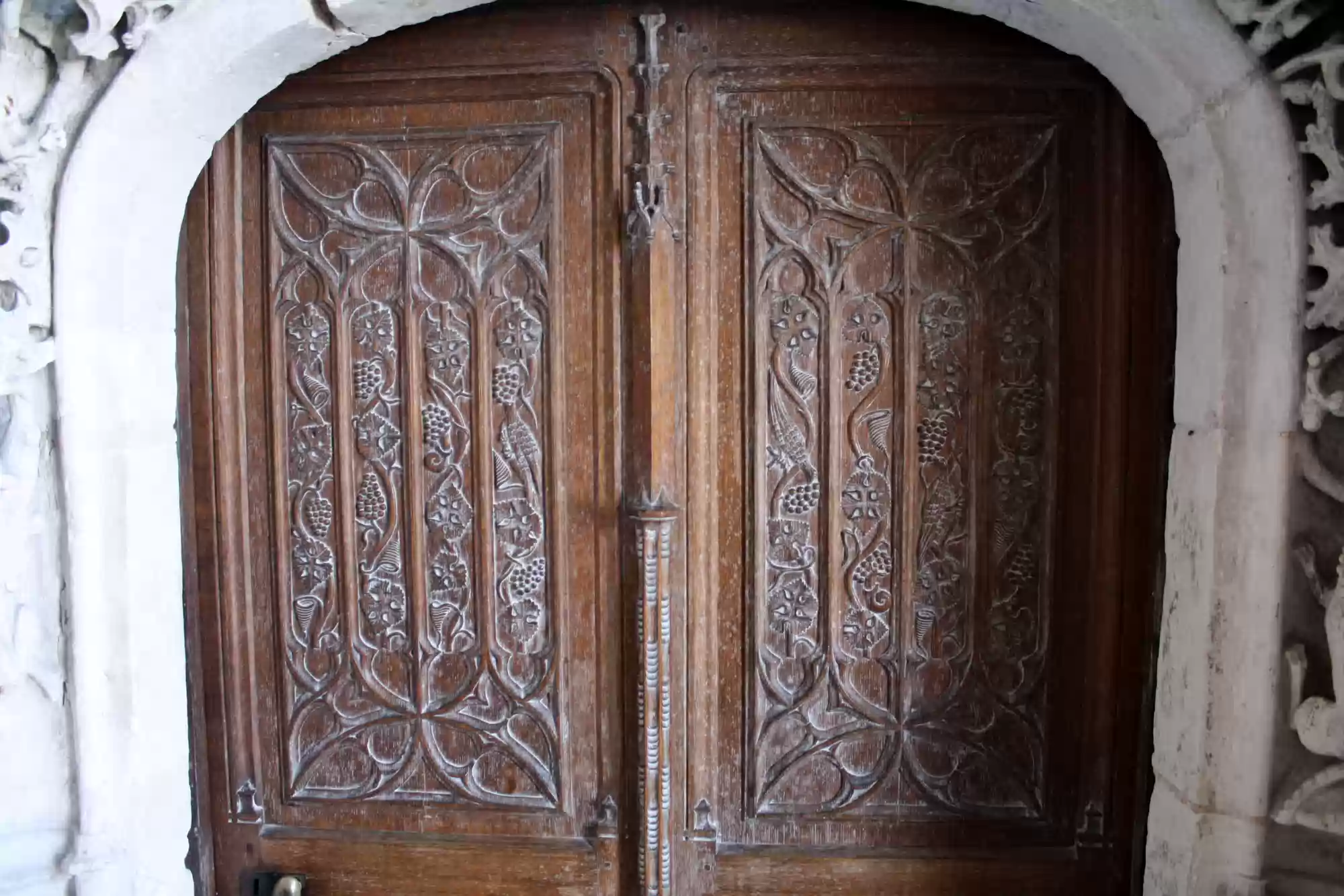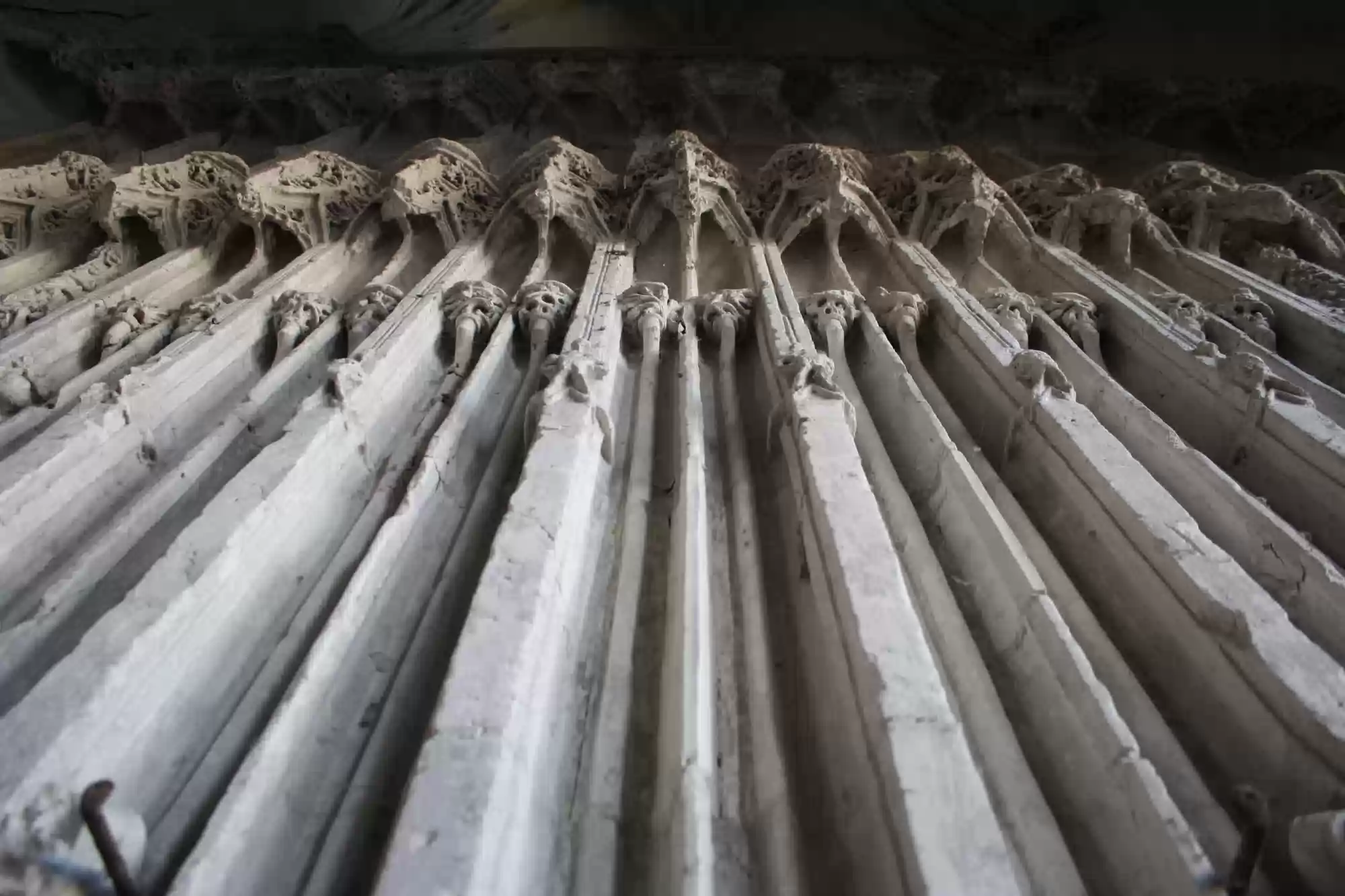Chapel of the Holy Spirit, 1440-1515. Flamboyant gothic style. Blblic and royal statues. King Charlemagne is holding a sphere. Mary and child are visible on the right side. Belfry Labels