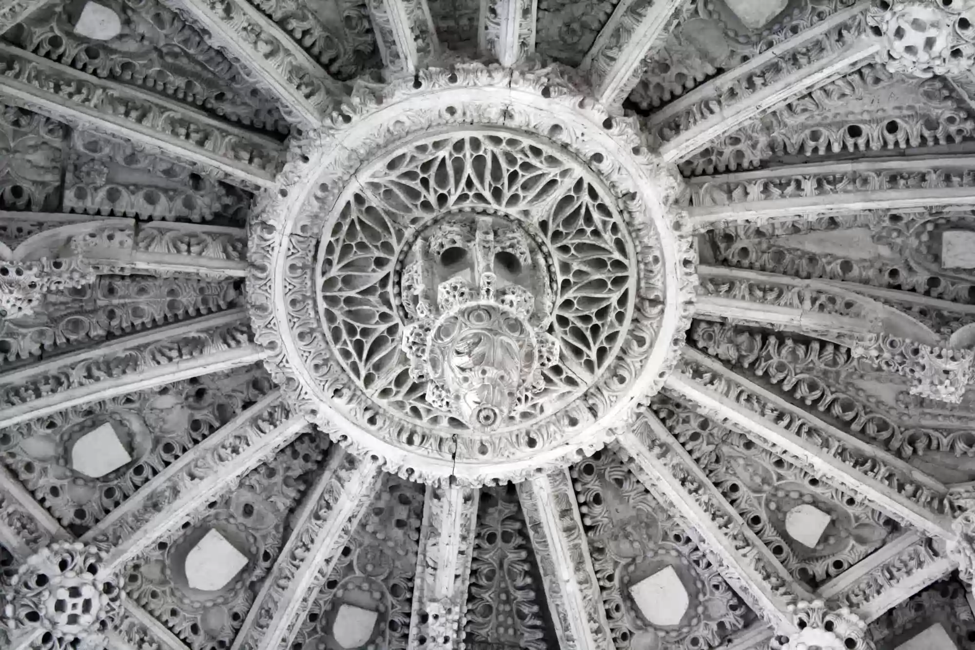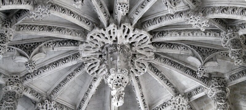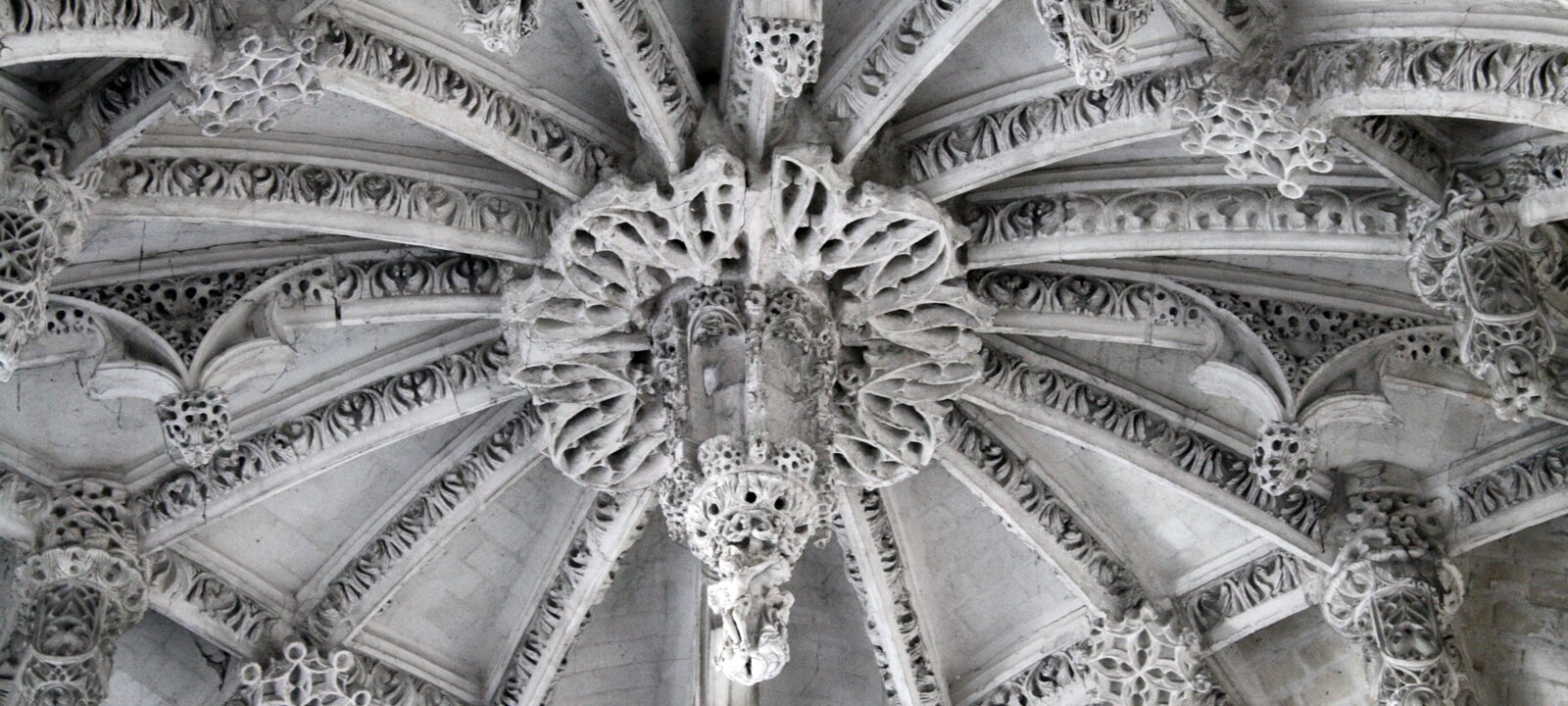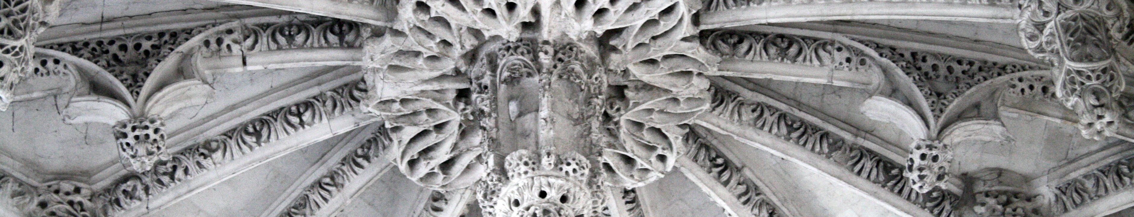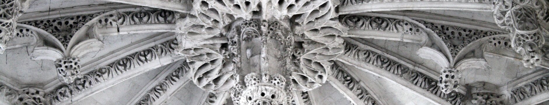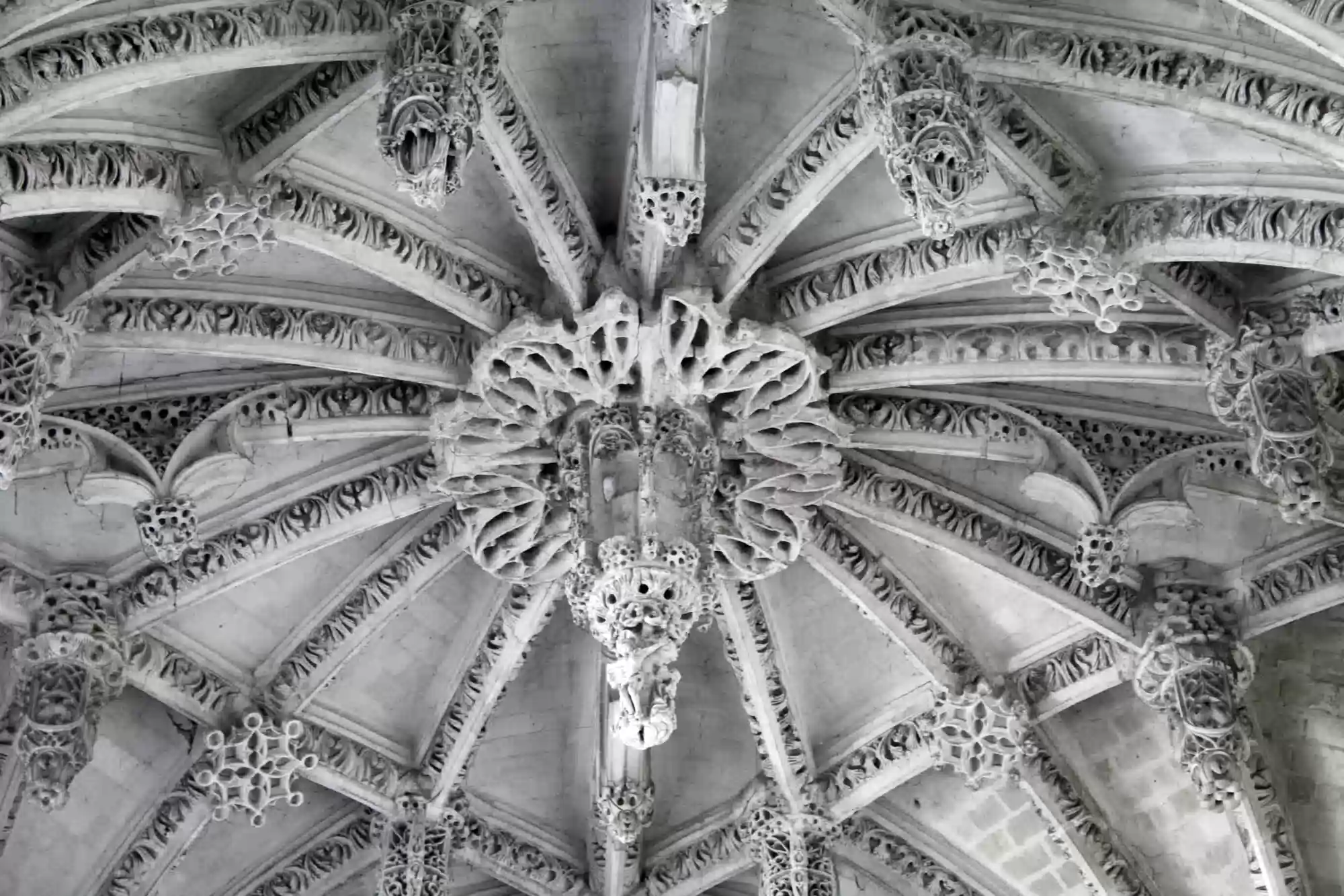 Chapel of the Holy Spirit, 1440-1515. Flamboyant gothic style. Blblic and royal statues. King Charlemagne is holding a sphere. Mary and child are visible on the right side. Belfry Labels